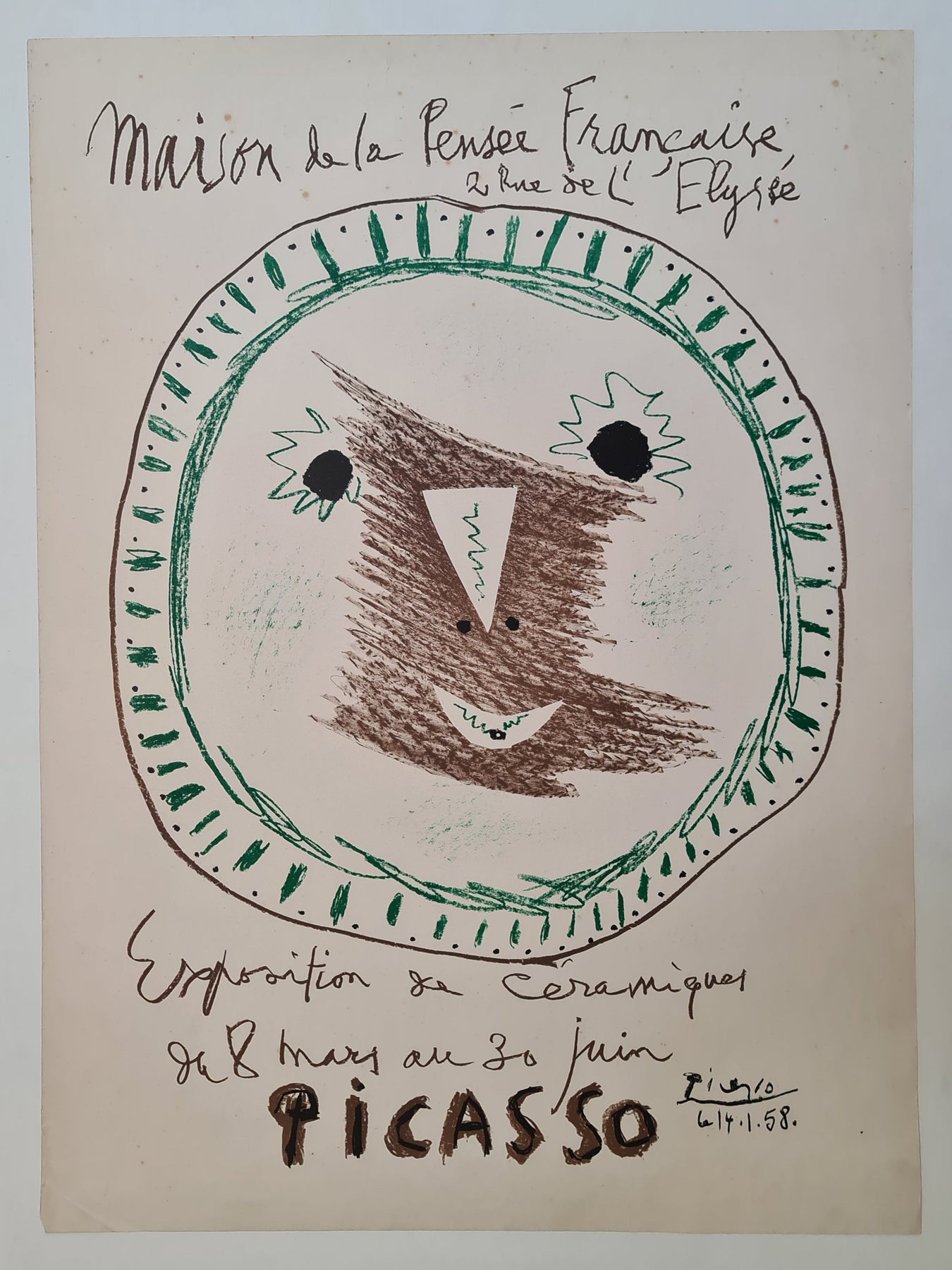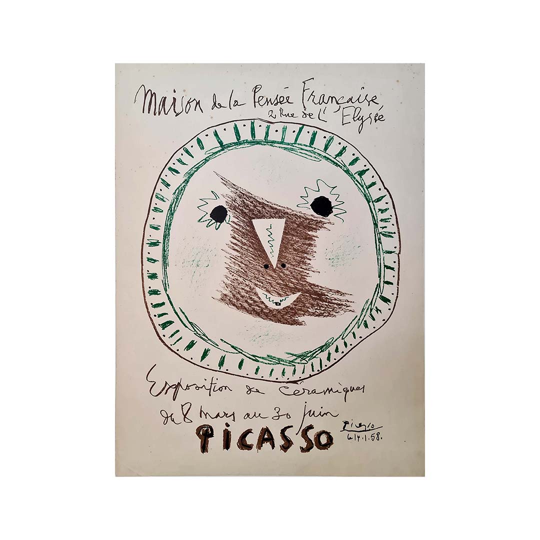 L'année 1958 marque un tournant dans le parcours artistique de Pablo Picasso, l'une des figures les plus influentes de l'art du XXe siècle. Cette année-là, Picasso, reconnu pour sa maîtrise de divers médiums, dont la peinture et la sculpture, s'aventure dans le domaine de la céramique. L'affiche originale de l'exposition de céramiques présentée à la Maison de la Pensée Française témoigne de cette phase charnière de sa carrière.