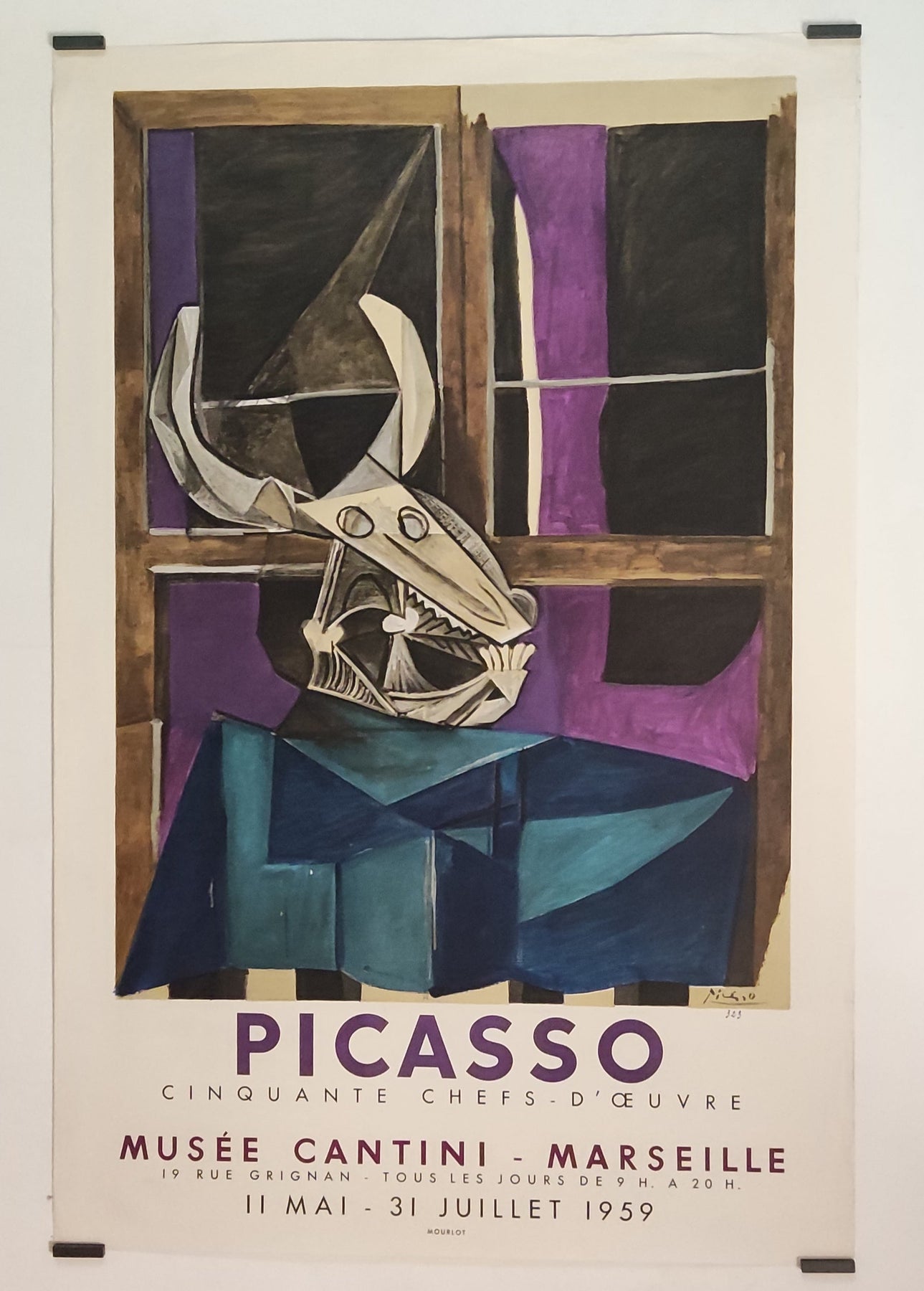 Audacieuse, théâtrale et résolument cubiste, cette affiche originale de 1959 a été créée par Pablo Picasso pour l'exposition « Cinquante Chefs-d'Œuvre » au musée Cantini de Marseille. L'exposition réunissait certaines des œuvres les plus importantes de Picasso, et cette composition saisissante en était l'image officielle.