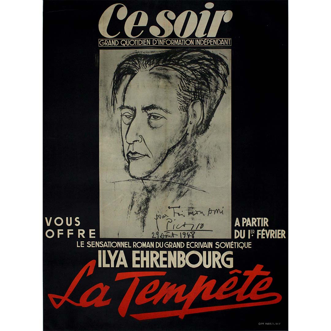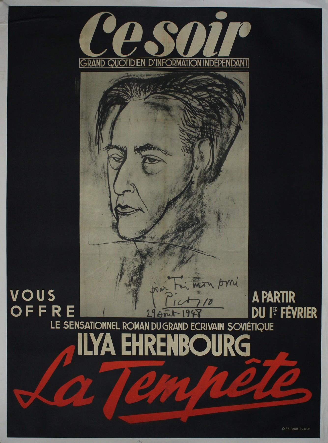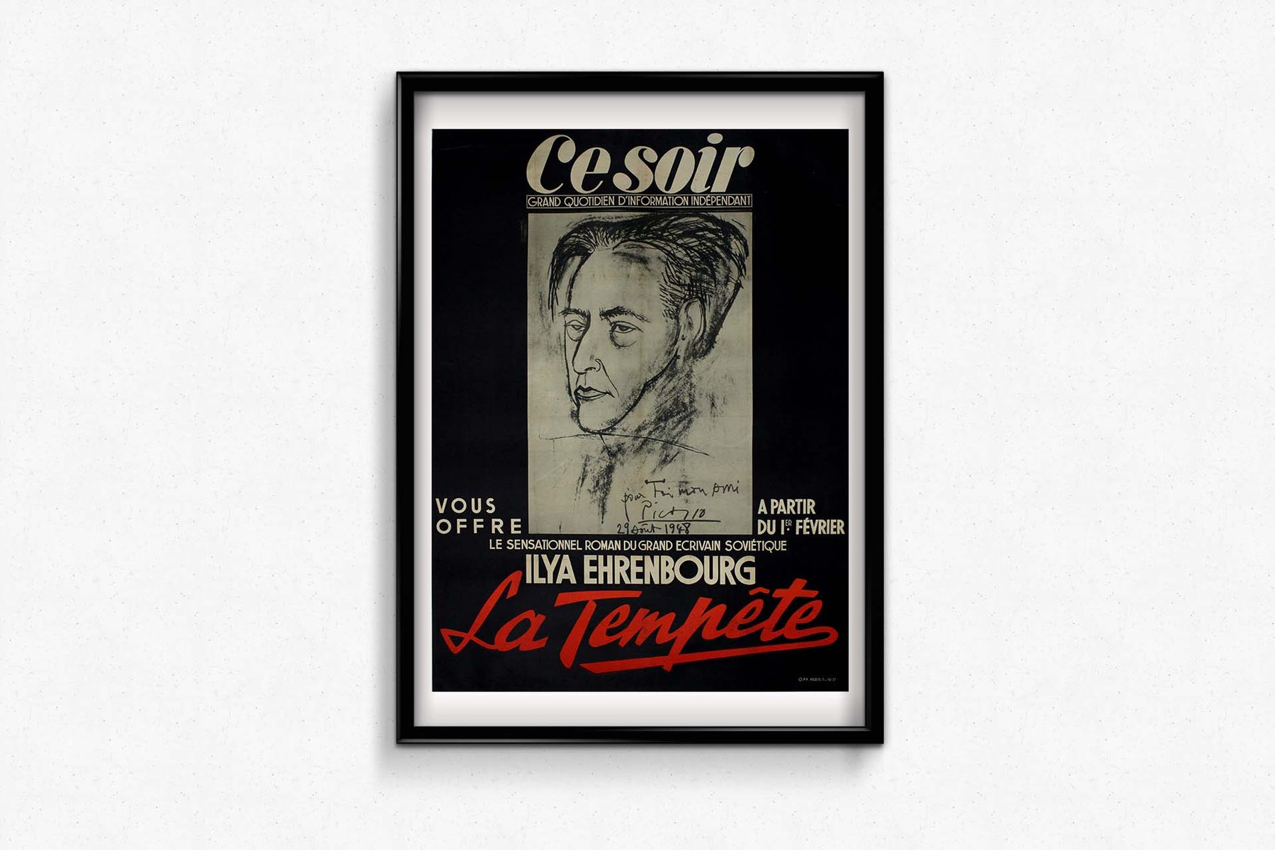 Prix régulier €800,00L'affiche originale de 1950 environ pour « Ce Soir », ornée du portrait d'Ilya Ehrenbourg par Pablo Picasso et faisant la promotion de « La Tempête », le roman à succès de l'écrivain soviétique, est une remarquable fusion d'art et de littérature. Cette œuvre fut créée pour promouvoir la publication en feuilleton du roman d'Ehrenbourg dans le quotidien français « Ce Soir », connu pour son indépendance politique et son engagement envers les causes de gauche.