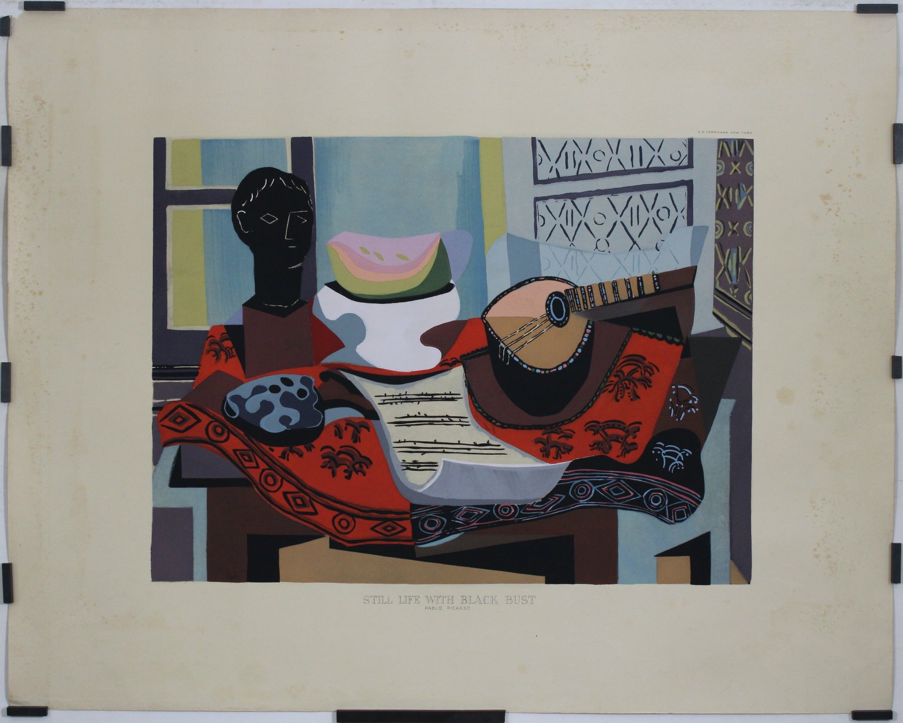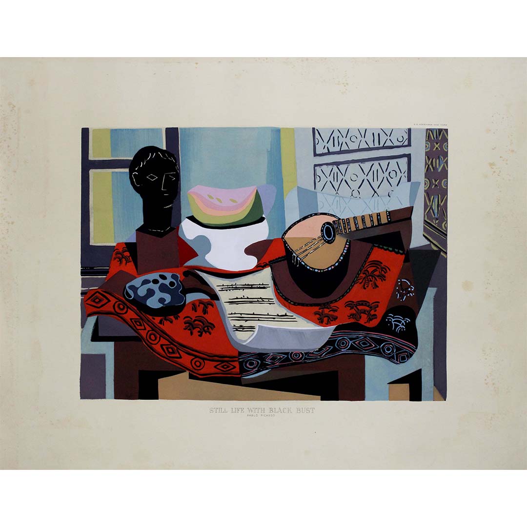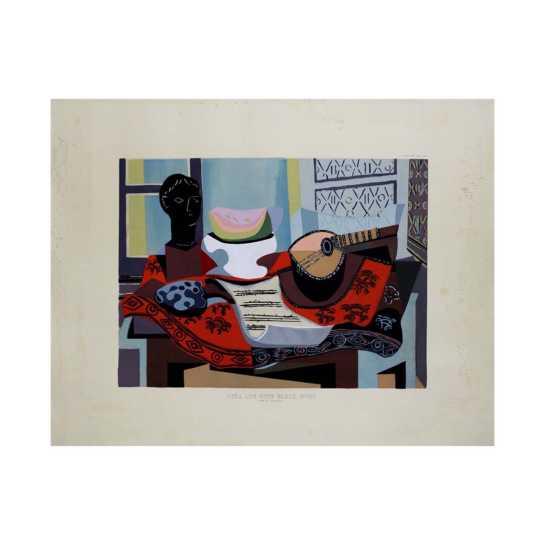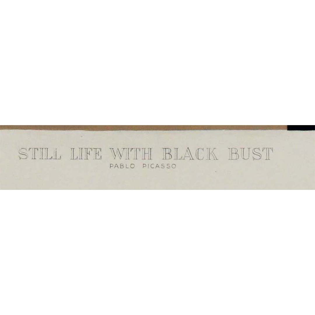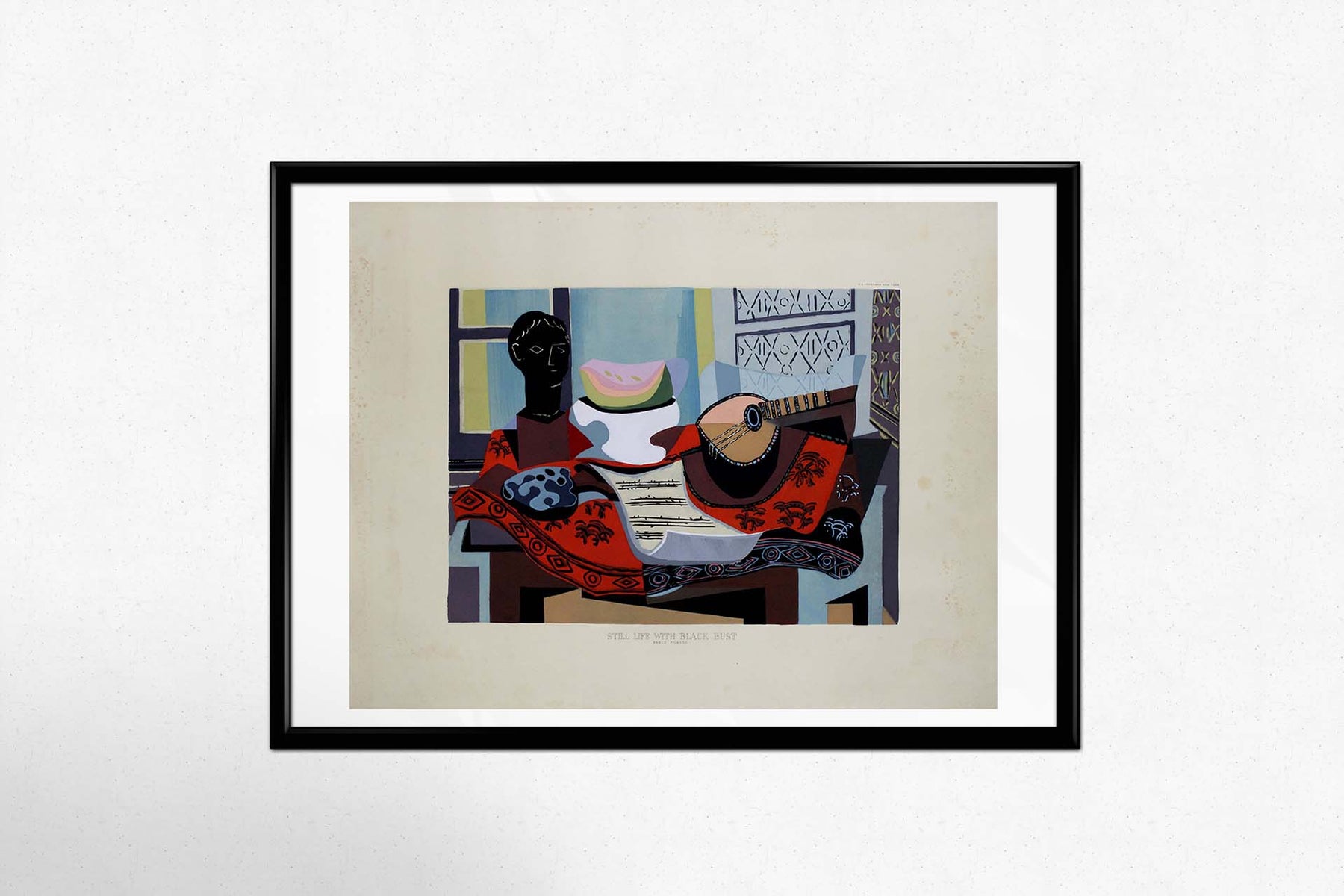Créée au milieu du XXe siècle, cette lithographie témoigne de l'approche singulière de Picasso en matière de nature morte, un genre qu'il n'a cessé de réinventer tout au long de sa carrière. Le buste noir, élément central de la composition, confère à l'œuvre une dimension intrigante et symbolique, invitant le spectateur à plonger dans l'univers imaginaire de l'artiste.