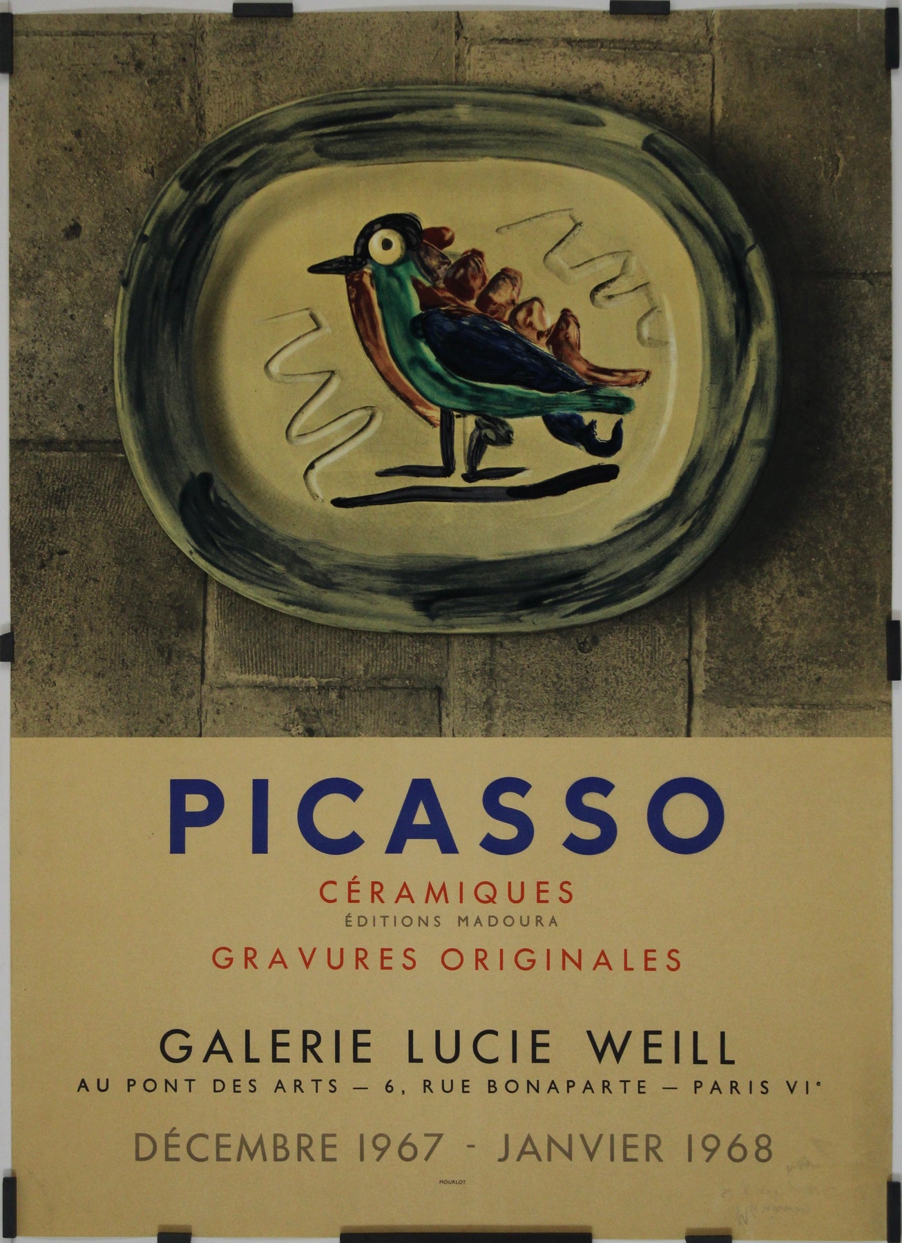 Audacieuse, raffinée et imprégnée du riche héritage de l'art moderne, cette affiche originale de 1967 capture l'essence même de l'univers créatif de Pablo Picasso. Conçue pour la Galerie Lucie Weill à Paris, cette lithographie d'exception annonçait une présentation unique des Céramiques de l'artiste — œuvres réalisées en collaboration avec le célèbre atelier de céramique Madoura — aux côtés de Gravures Originales .