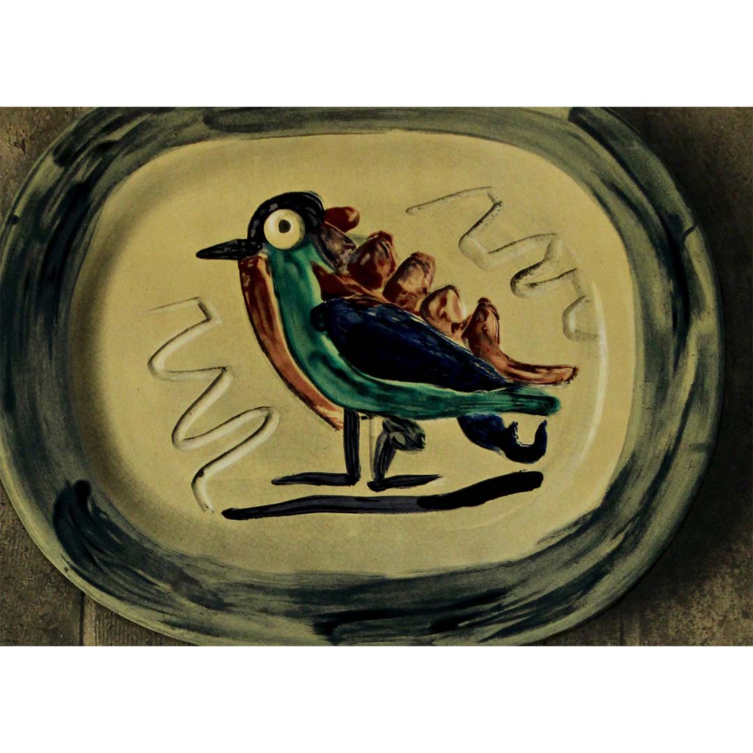 La composition frappe par sa simplicité : un plat en céramique orné d’un oiseau fantaisiste, dessiné dans la main immédiatement reconnaissable de Picasso, se détache sur un fond de carreaux rustiques. La forme stylisée de l’animal, la palette de couleurs éclatantes et la fluidité des lignes témoignent de l’exploration joyeuse de la céramique par Picasso – un médium qu’il a embrassé avec un enthousiasme débordant dès la fin des années 1940. L’oiseau, souvent symbole de liberté et de vitalité, reflète la fascination de l’artiste pour la nature et les formes, réduite à son langage visuel le plus pur.