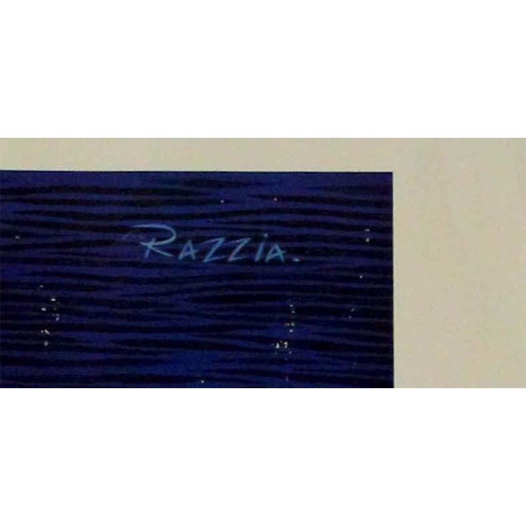 L'œuvre met en scène un élégant voilier de course fendant les vagues, évoquant la vitesse et la précision qui caractérisent la compétition. Le style minimaliste signature de Razzia confère une esthétique épurée et sophistiquée, soulignant les lignes fluides du voilier sur le bleu profond de la mer et du ciel, symbolisant l'énergie débordante de l'événement. Le cadre de San Diego, qui a accueilli la Coupe Louis Vuitton en 1995, est subtilement évoqué par les images côtières, renforçant le lien avec cet événement emblématique.