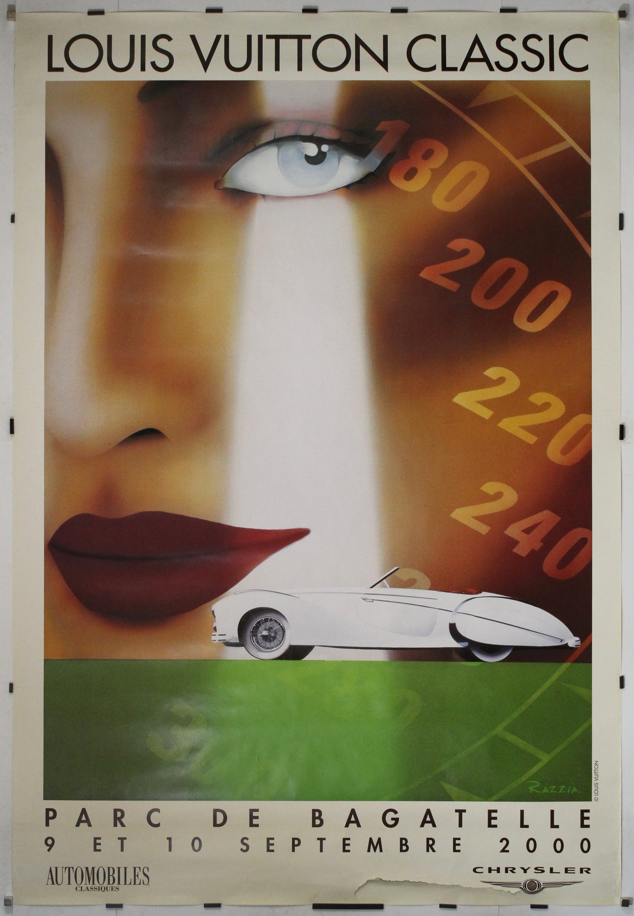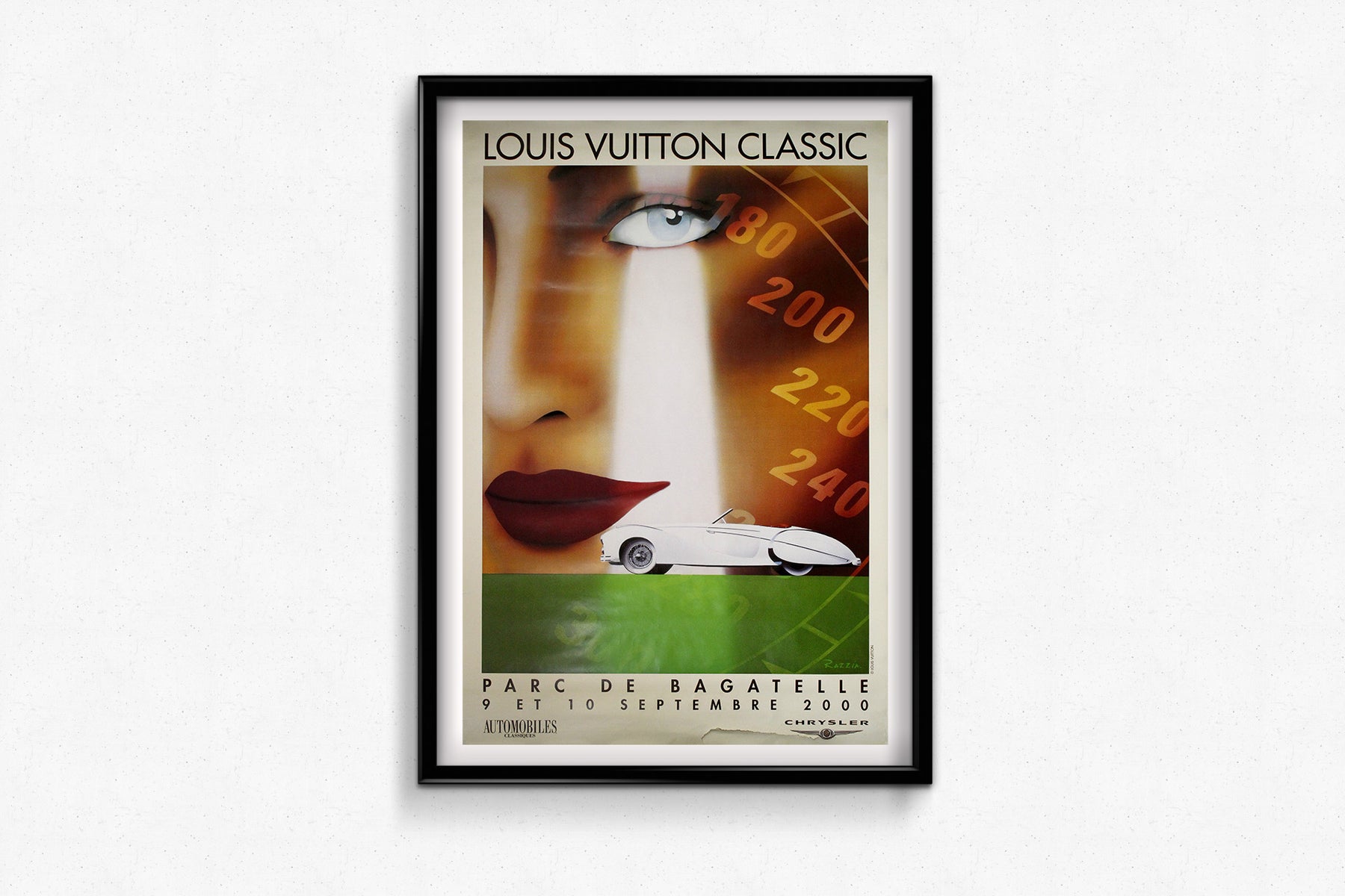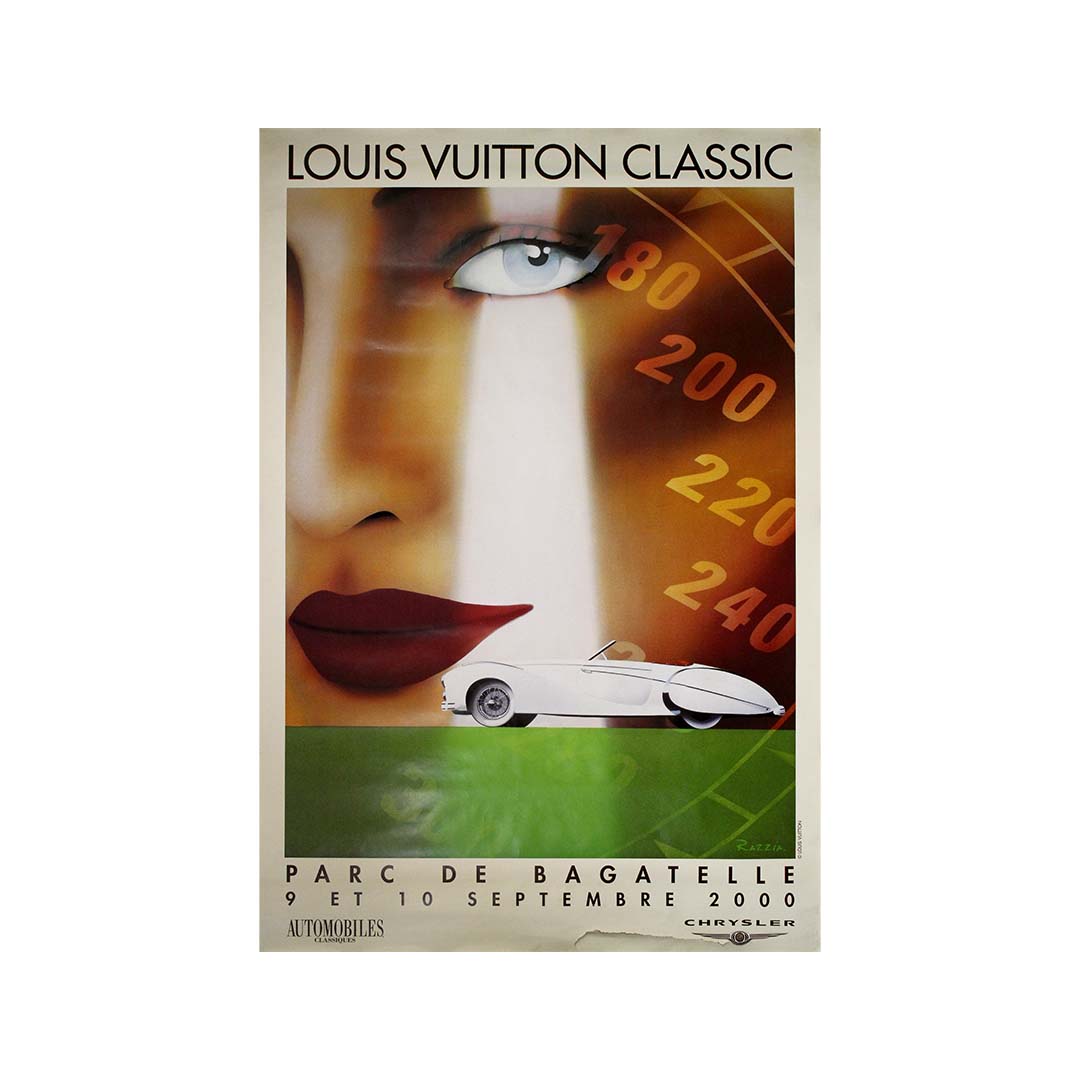 Cette superbe affiche originale de 2000, conçue par la célèbre artiste française Razzia, a été créée pour le Louis Vuitton Classic, qui s'est tenu les 9 et 10 septembre au prestigieux Parc de Bagatelle à Paris. Figure incontournable de l'affiche contemporaine, Razzia capture avec brio l'élégance, la vitesse et le charme du monde automobile, transposés dans l'univers raffiné de cet événement de voitures classiques organisé par Louis Vuitton.
