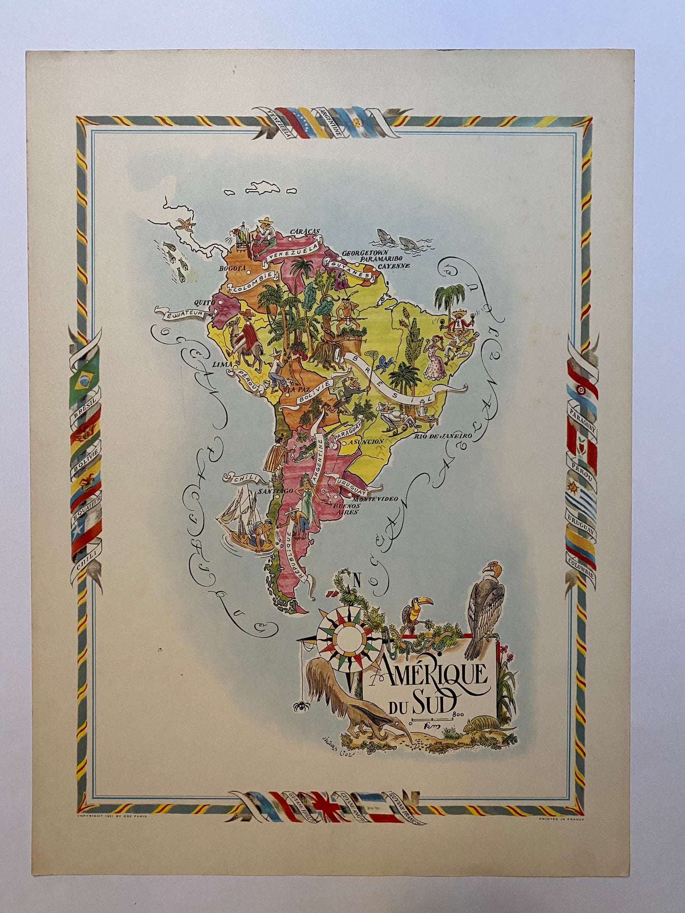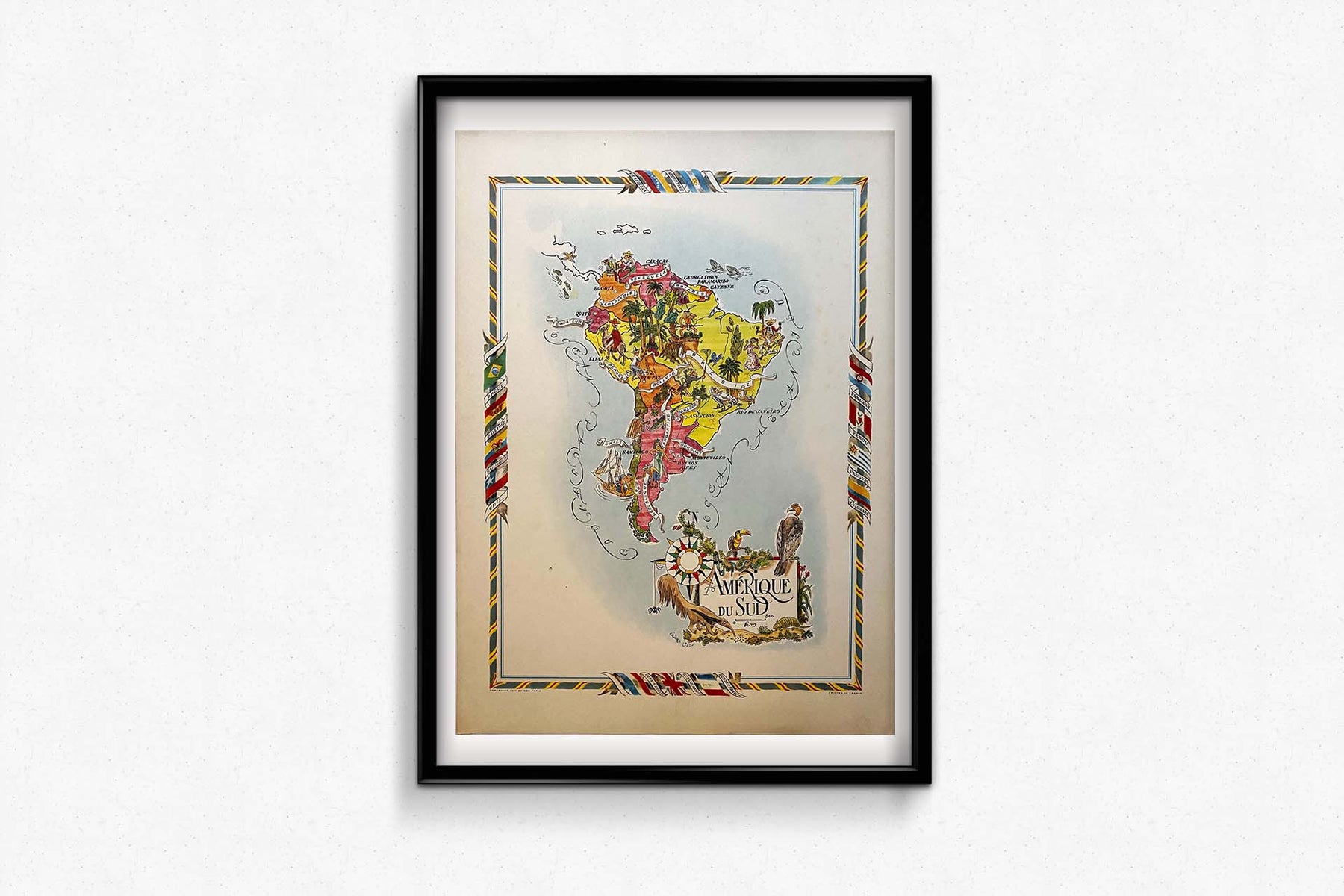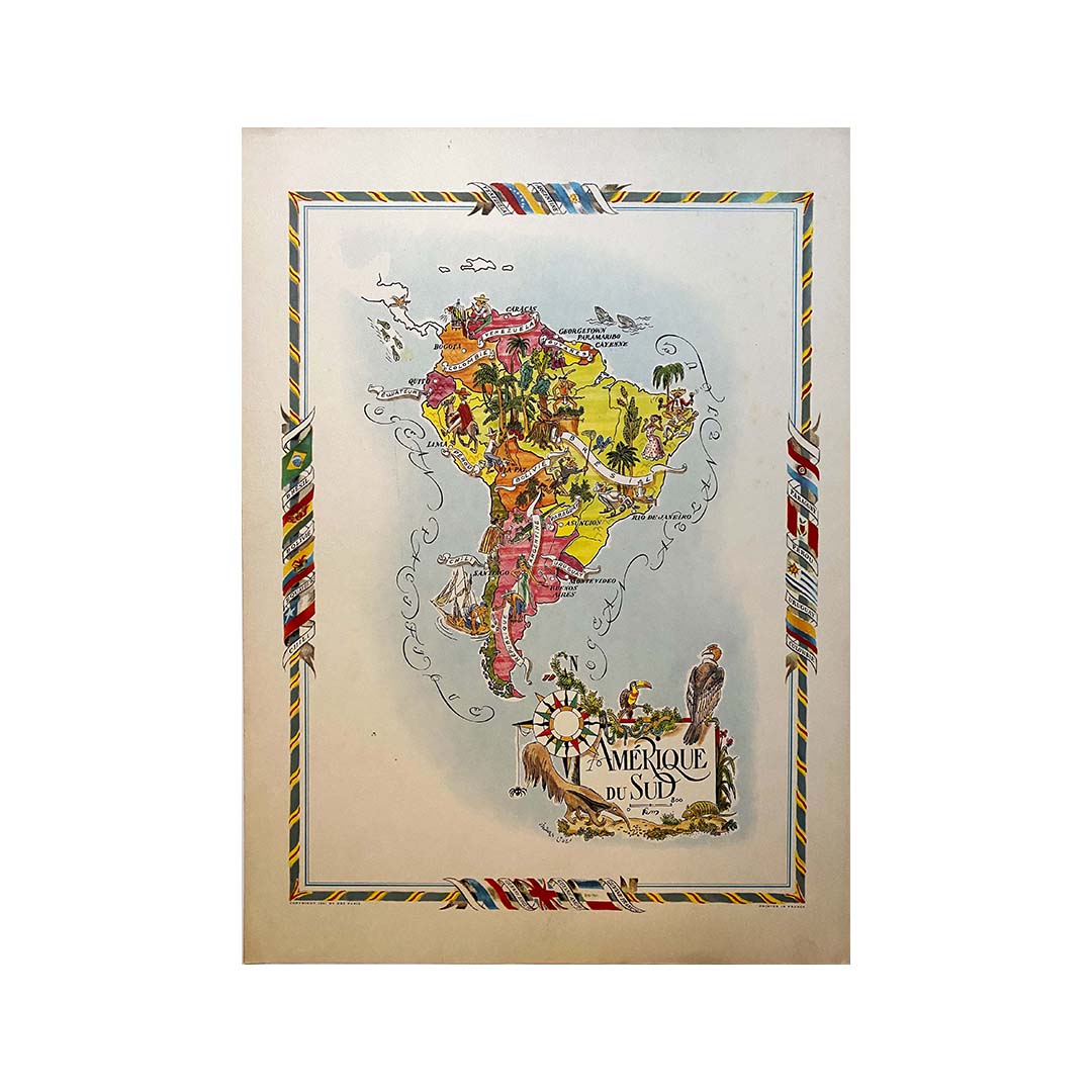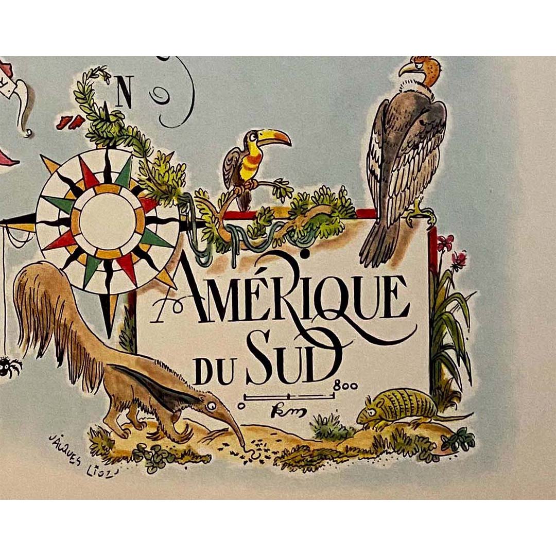 Aujourd'hui, la carte illustrée de l'Amérique du Sud par Jacques Liozu est devenue une pièce de collection très prisée des passionnés de cartographie et d'art. Elle témoigne avec éclat du talent de Liozu en tant qu'artiste-cartographe et de sa capacité à transformer un objet utilitaire en une œuvre d'art véritablement inspirante. Cette carte continue d'évoquer l'esprit d'aventure et la curiosité géographique, rappelant la magie intemporelle du voyage et de la cartographie artistique.