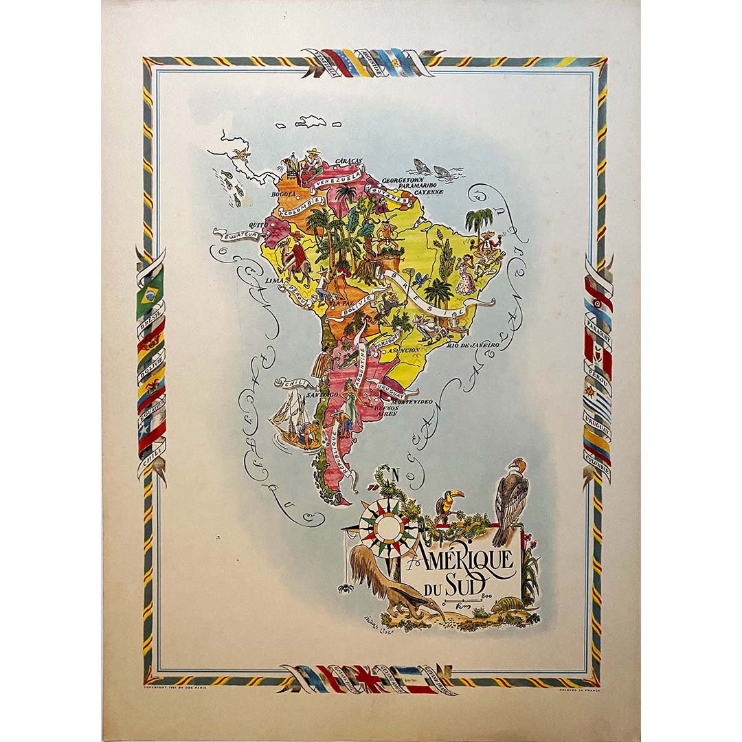 La carte illustrée de l'Amérique du Sud de Jacques Liozu, datant de 1951, est une œuvre cartographique exceptionnelle qui allie avec brio art et géographie. L'artiste et cartographe français Jacques Liozu a créé cette carte pour représenter les paysages, les cultures et les richesses de l'Amérique du Sud.
