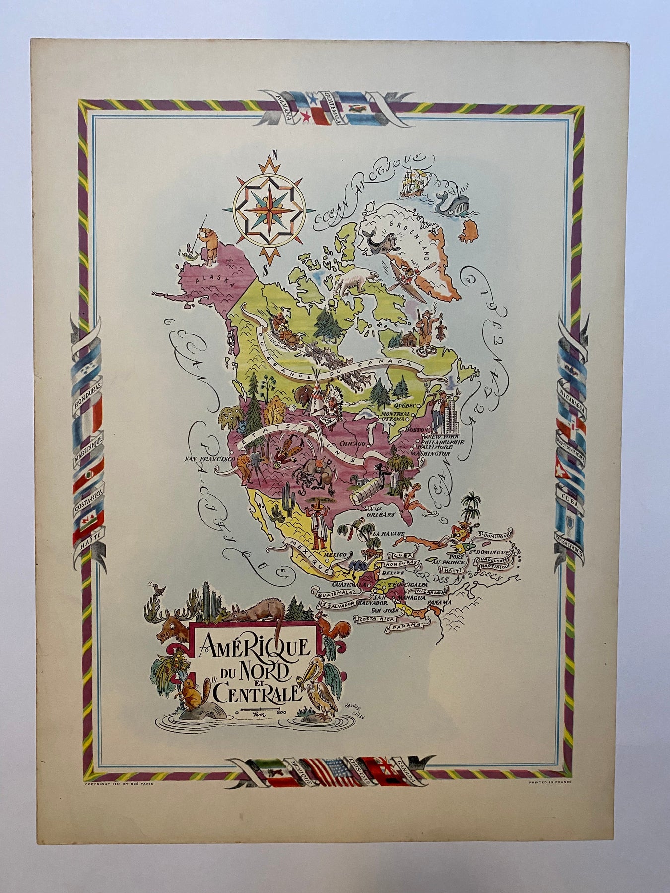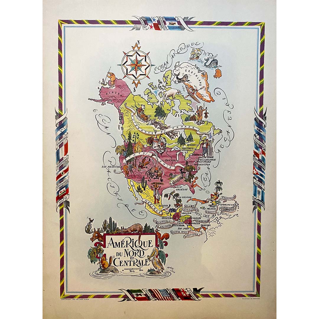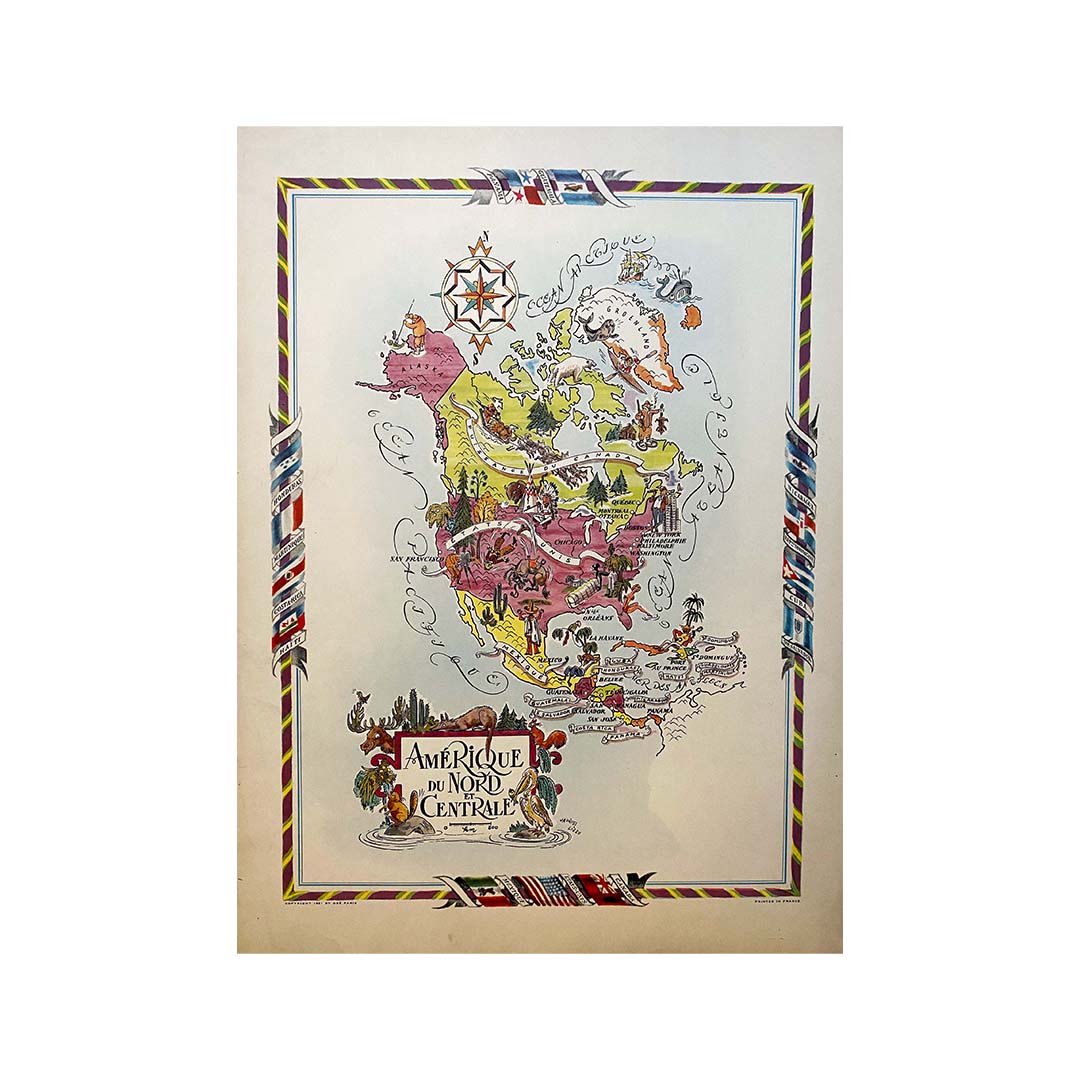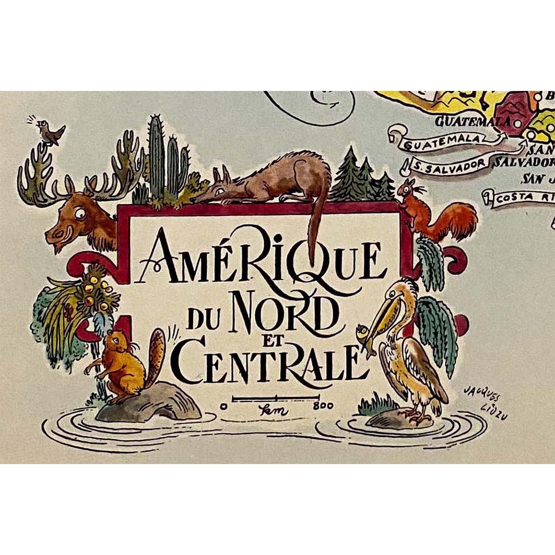La carte illustrée de l'Amérique du Nord et de l'Amérique centrale réalisée par Jacques Liozu en 1951 est une œuvre cartographique exceptionnelle qui allie précision géographique et esthétique artistique. Jacques Liozu, artiste et cartographe français de renom, a créé cette carte pour représenter avec une précision élégante les vastes étendues et la diversité culturelle de ces deux régions du continent américain.