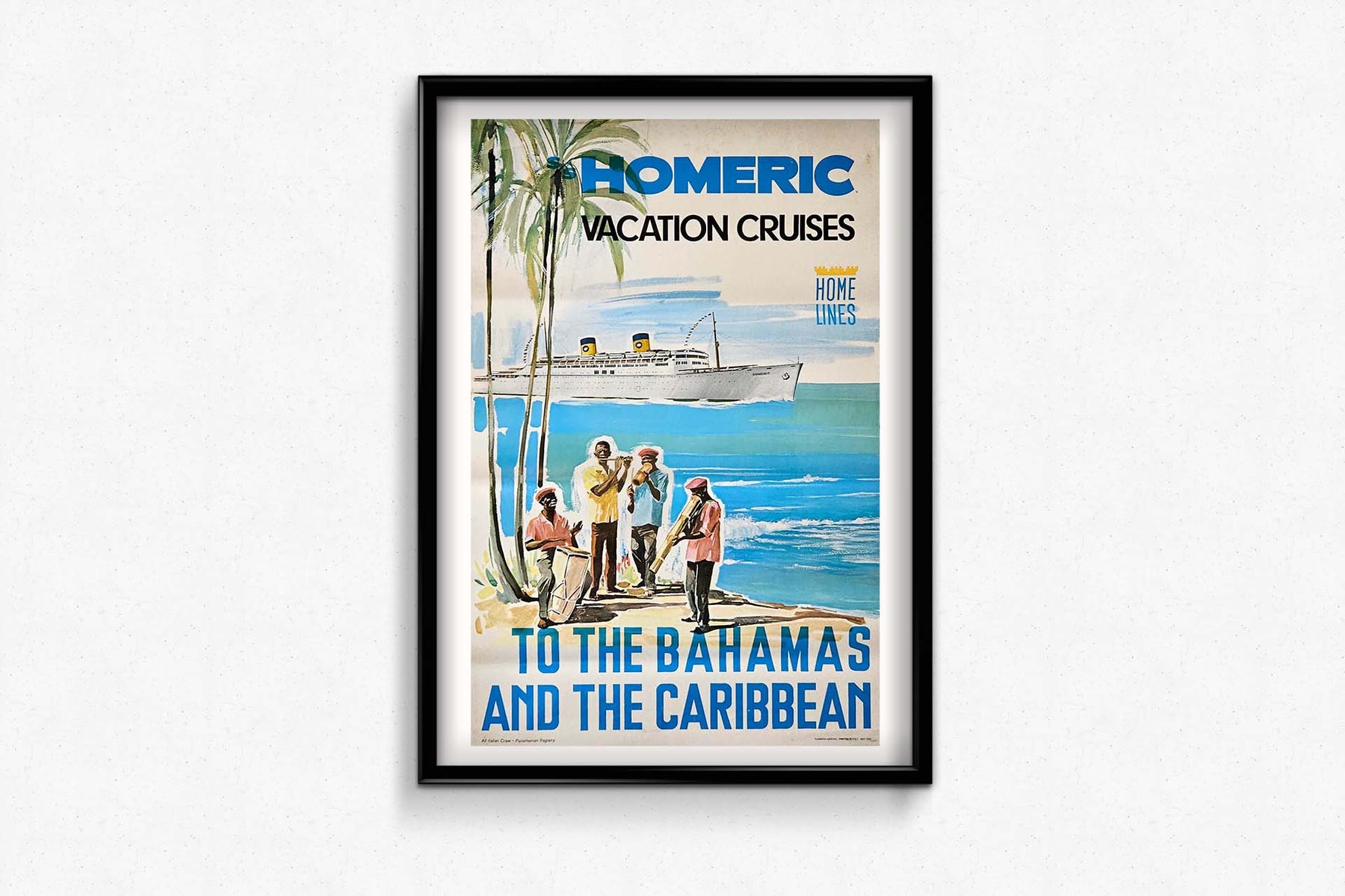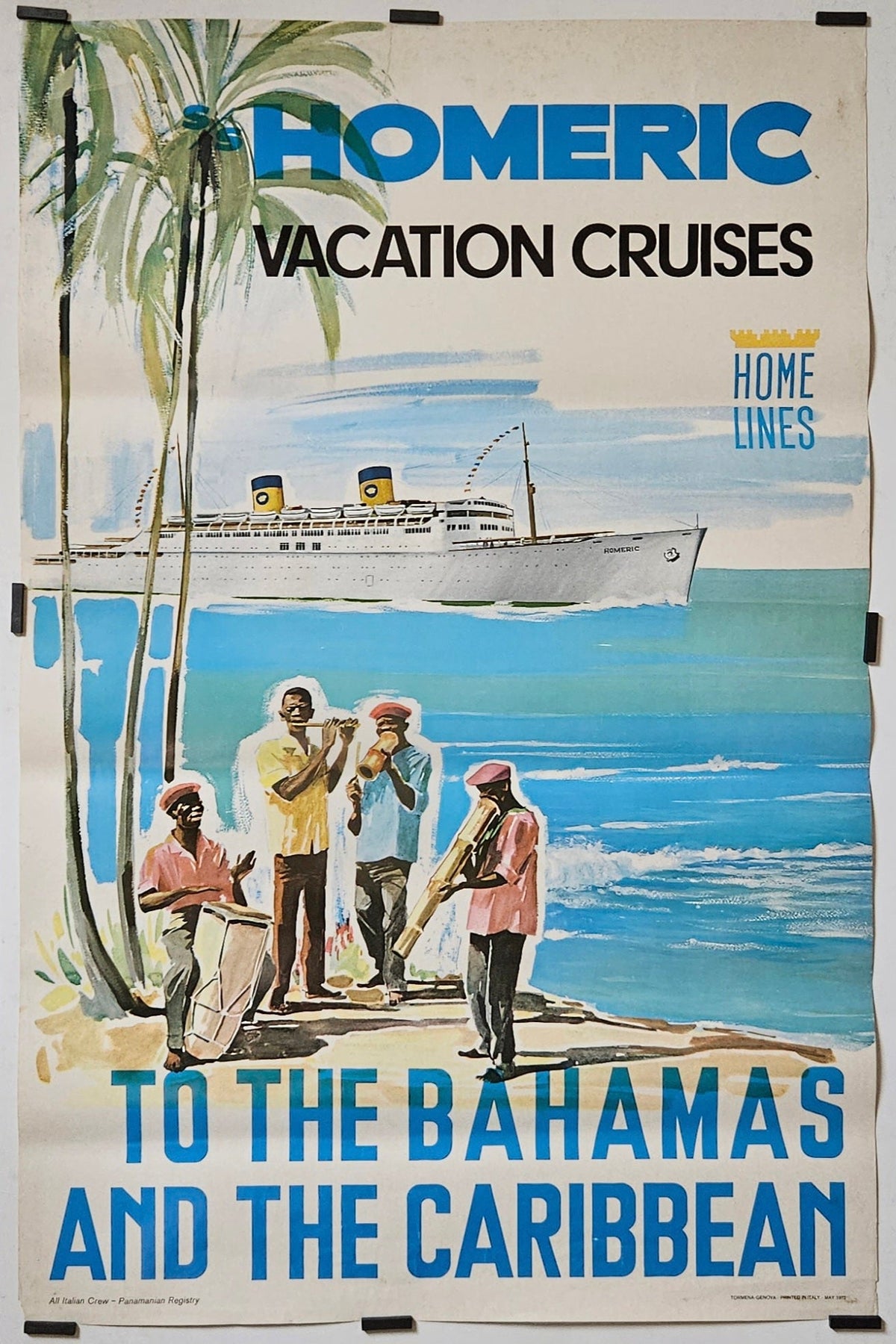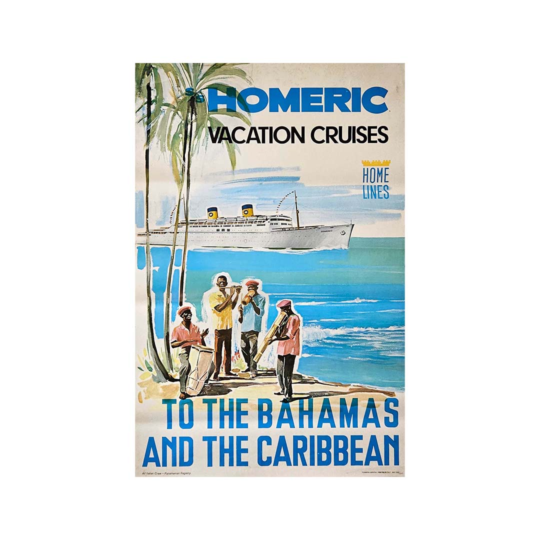 L'affiche originale faisant la publicité des croisières de vacances à bord du S/S Homeric de Home Lines en 1972 offre un aperçu captivant de l'attrait des voyages de luxe aux Bahamas et dans les Caraïbes à cette époque.