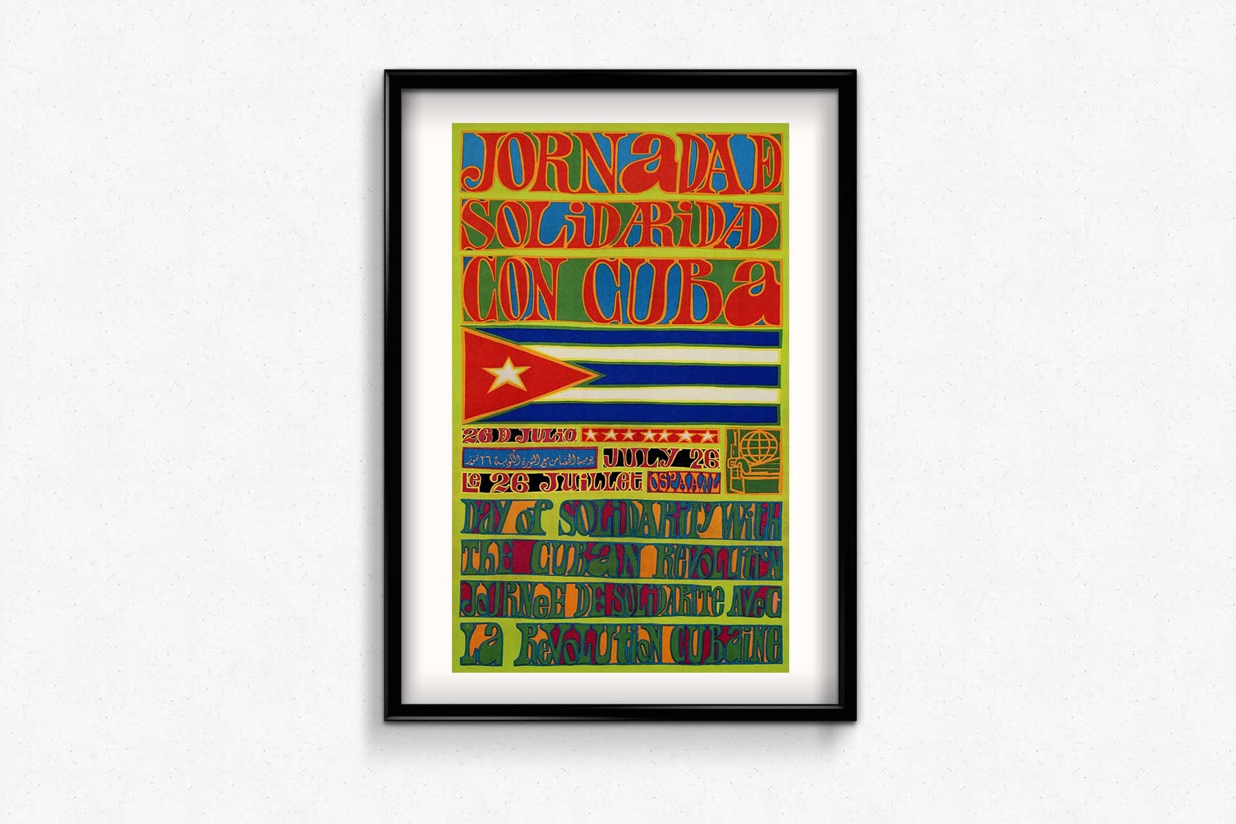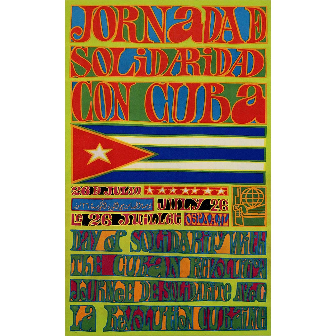 Produite par l'OSPAAAL, organisation fondée en 1966 pour promouvoir la solidarité entre les peuples luttant contre l'impérialisme, le colonialisme et le néocolonialisme, cette affiche incarne l'esprit d'internationalisme et d'action collective. Par son design audacieux et ses images percutantes, elle invite à la solidarité avec Cuba et sa lutte révolutionnaire contre l'oppression et l'exploitation.