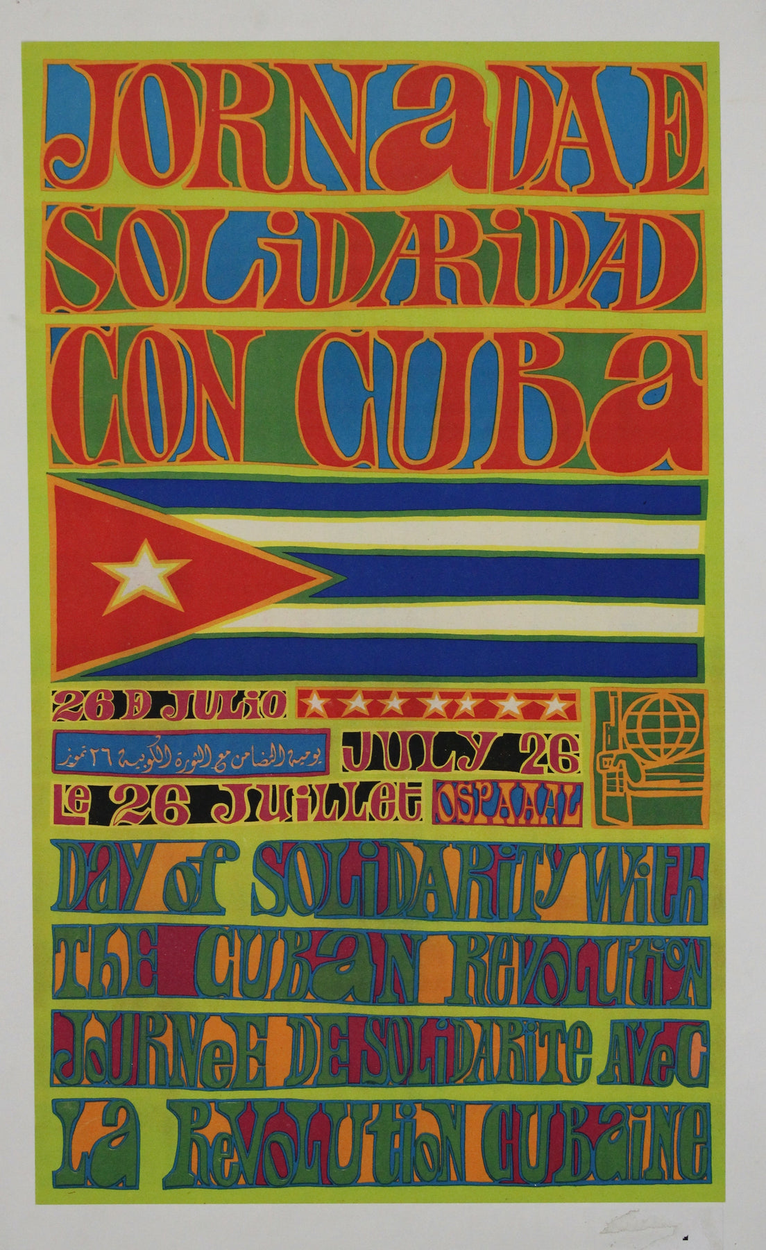 L'affiche politique originale de 1970 environ, réalisée par l'OSPAAAL (Organisation de solidarité avec les peuples d'Asie, d'Afrique et d'Amérique latine) pour la « Jornada de solidaridad con Cuba » (Journée de solidarité avec Cuba), témoigne avec force du soutien international à la révolution cubaine. Audacieuse, vibrante et emblématique de la ferveur qui animait les mouvements révolutionnaires de l'époque, cette affiche est à la fois un cri de ralliement et un symbole de solidarité internationale.