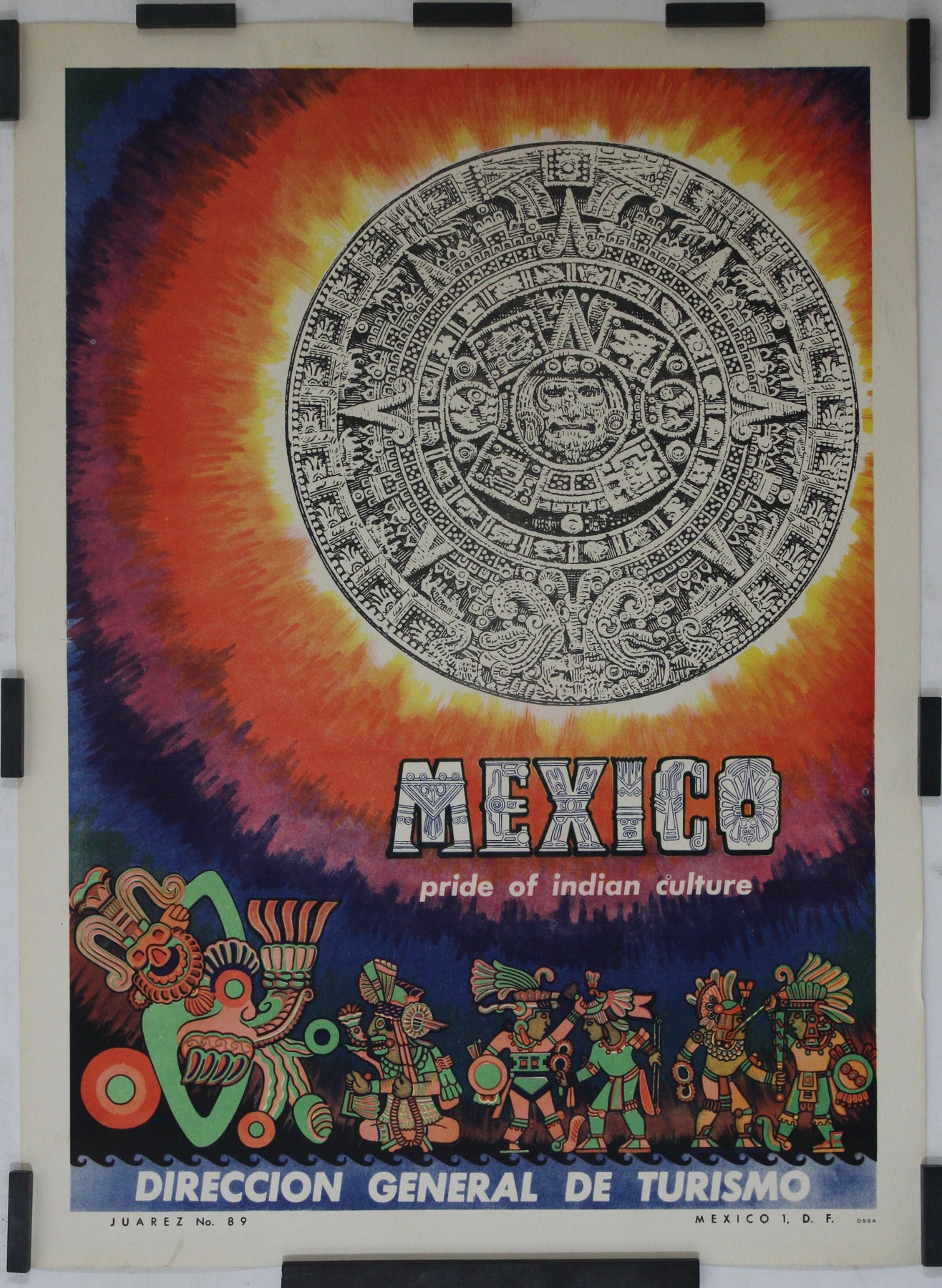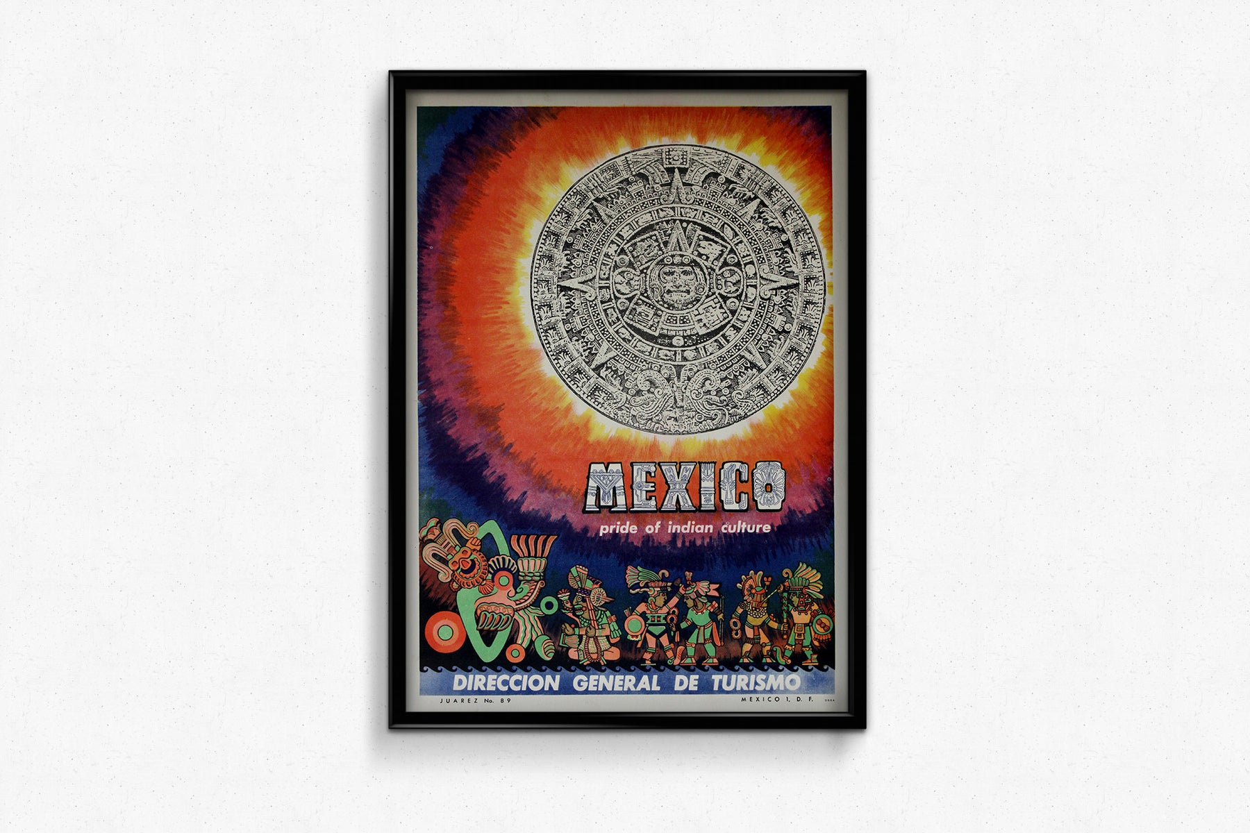 Au pied de la pierre monumentale, une rangée festive de personnages indigènes en tenue de cérémonie anime l'affiche. Stylisées en formes géométriques colorées, ces figures représentent diverses divinités, guerriers et danseurs précolombiens , célébrant la richesse des cultures indigènes qui ont façonné l'identité du Mexique moderne.
