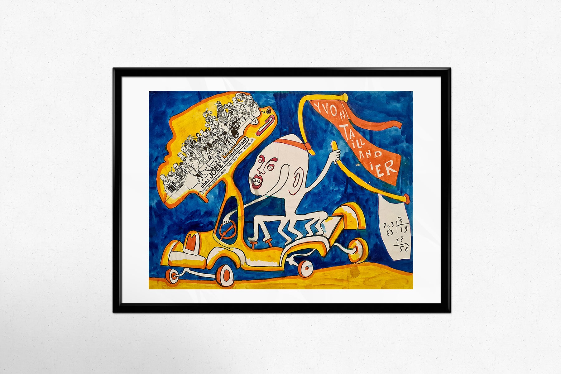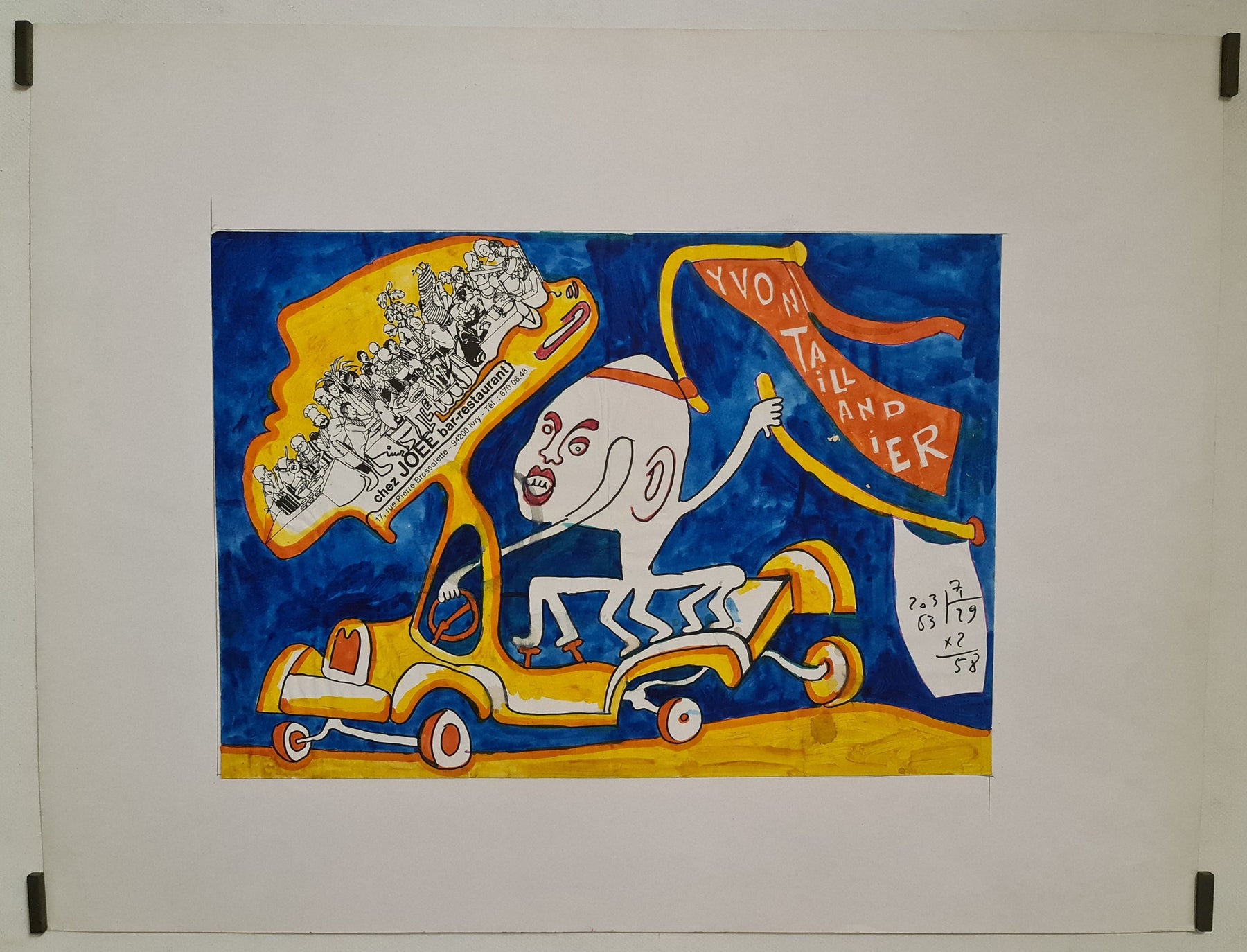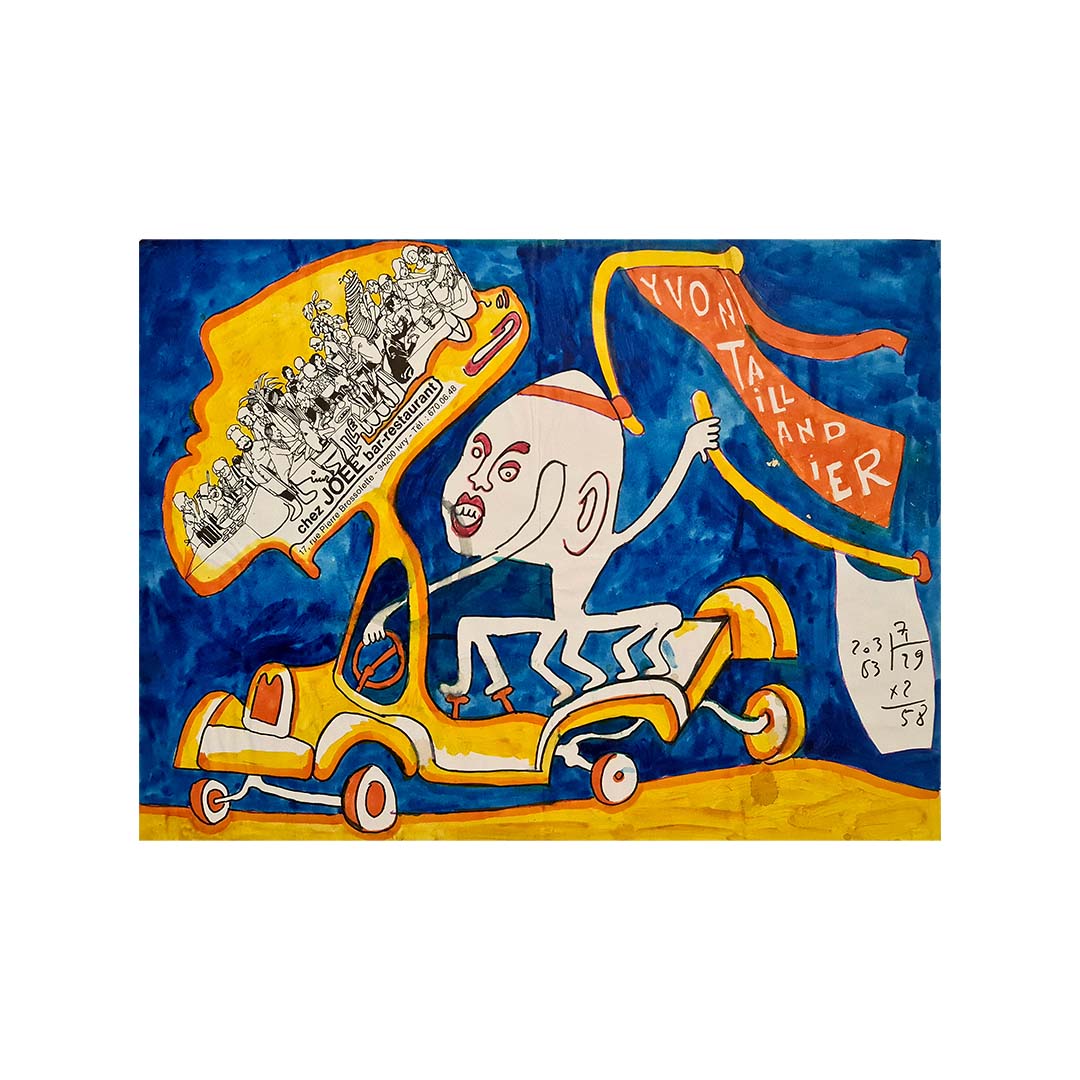 Ce tableau original d'Yvon Taillandier illustre parfaitement son style caractéristique, le « Taillandier-land », un univers de figures fantastiques et de compositions surréalistes. Artiste et écrivain français de renom, Taillandier fut profondément influencé par l'Art Brut et une esthétique narrative, créant des œuvres vibrantes qui fusionnent narration visuelle et langage symbolique unique.