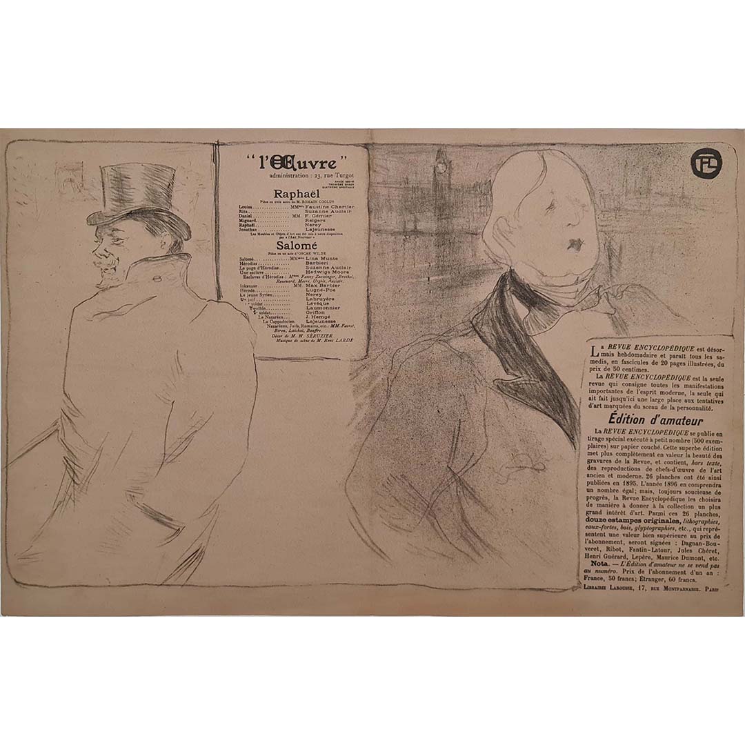 La revue encyclopédique présentée au théâtre, avec « Salomé » d'Oscar Wilde et « Raphaël » de Romain Coulus, constituait une exploration audacieuse de l'art et de la culture de l'époque. L'affiche saisit subtilement les tensions et les questionnements sociaux et culturels de cette période. La position de Toulouse-Lautrec entre Oscar Wilde et Félix Fénéon, les deux « prisonniers », symbolise la convergence de leurs destins et des enjeux de l'époque. Wilde, brisé par son incarcération, et Fénéon, observateur apparent, sont liés par Lautrec, créant un réseau de significations qui transcende la simple représentation visuelle.