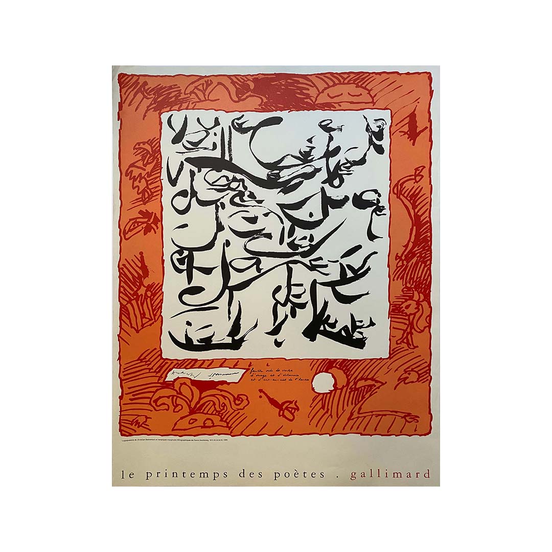 L'affiche originale de Pierre Alechinsky pour Le Printemps des Poètes (1999) est une célébration vibrante et visuellement captivante de l'écriture et de l'esprit artistique. Créée pour promouvoir le festival annuel de poésie, cette affiche sert non seulement de support publicitaire, mais aussi à saisir l'essence même de l'expression poétique, de la créativité et de la fusion des arts visuels et littéraires.