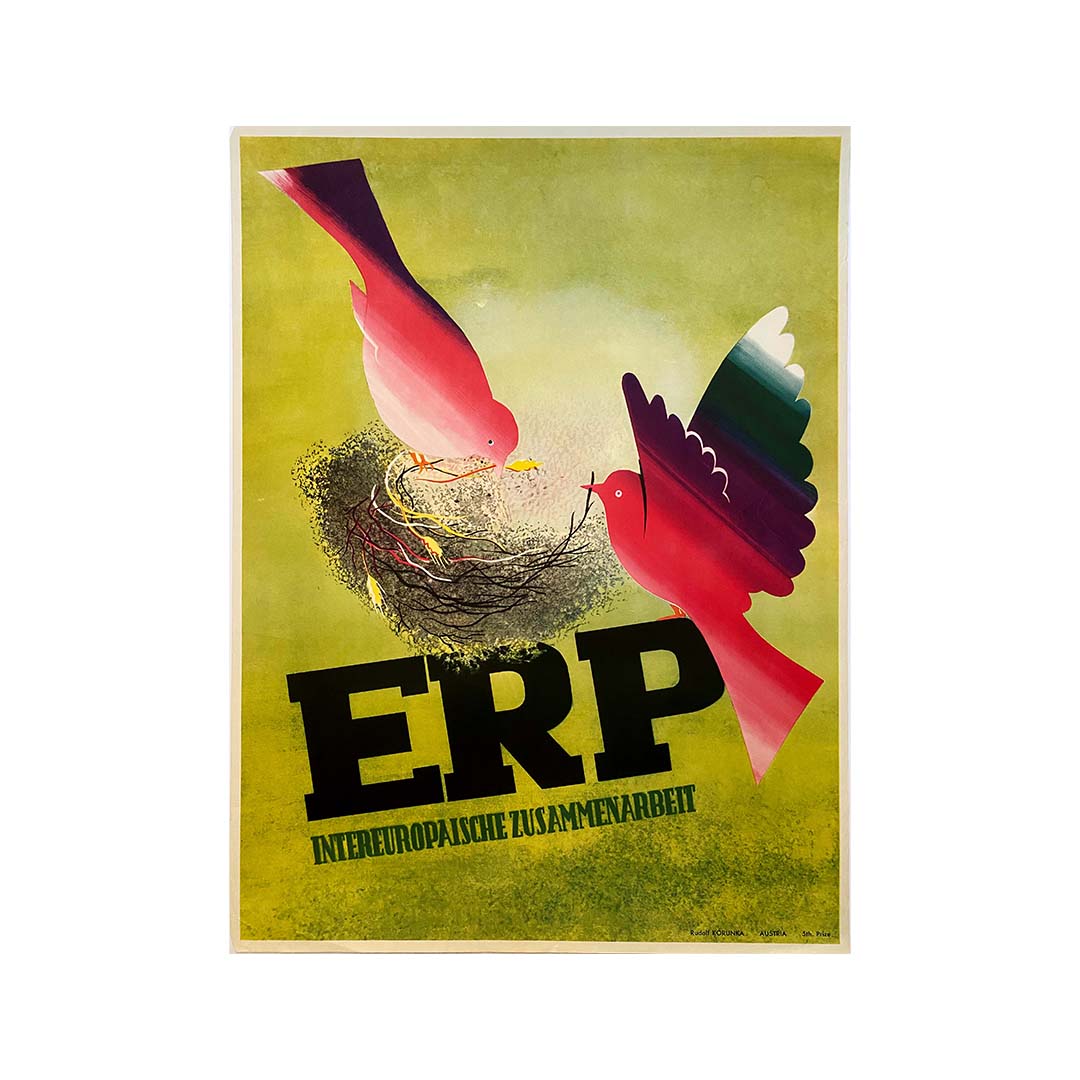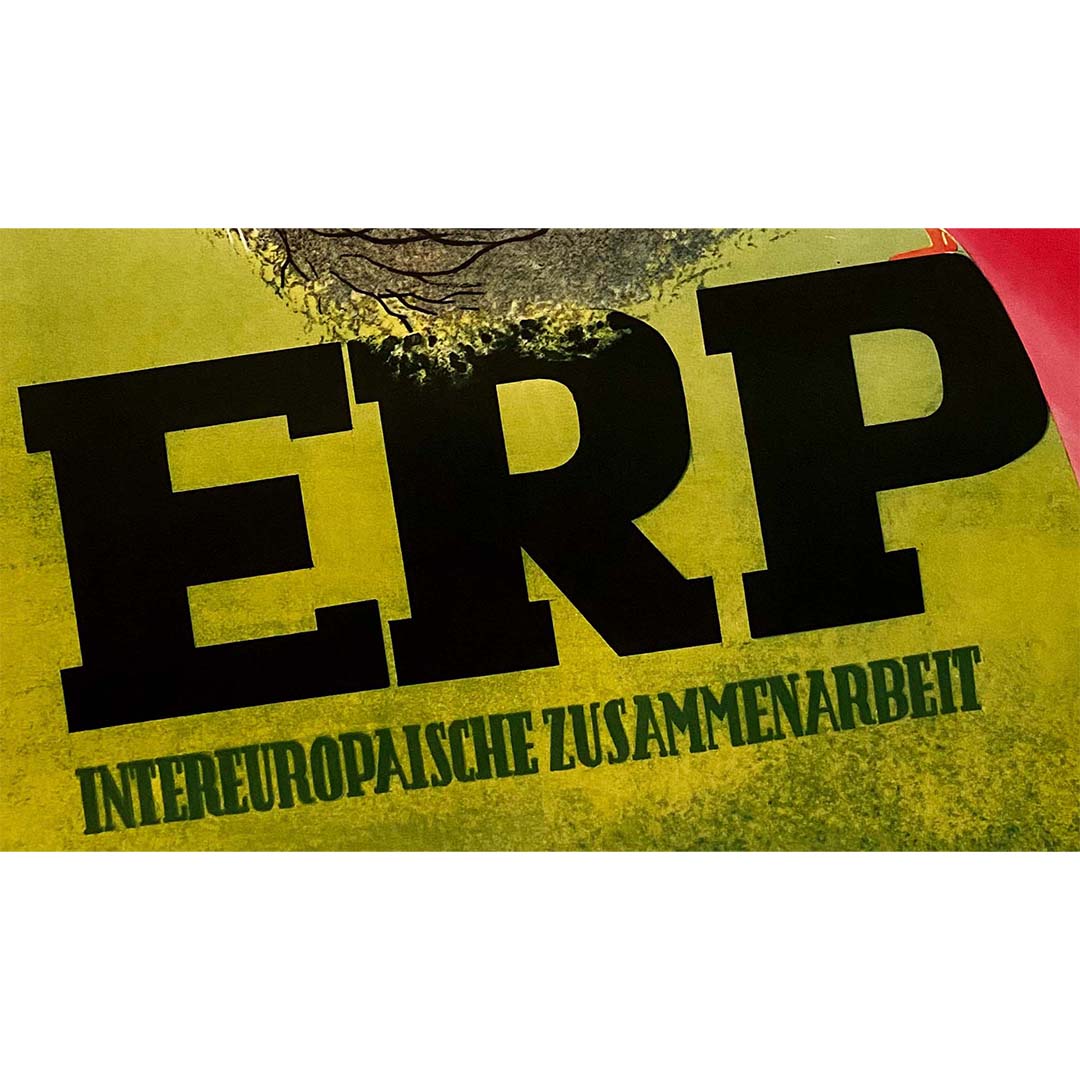 Affiche originale du Programme de réunification européenne (ERP), intitulé « Inter-europaische Zusammenarbeit », soit « Collaboration intereuropéenne ». Le Programme de réunification européenne (ERP), plus tard connu sous le nom de plan Marshall, était un programme américain destiné à relancer les économies européennes après la Seconde Guerre mondiale. Les entreprises allemandes bénéficiaires de fonds de l'ERP étaient tenues de rembourser l'État allemand, qui prêtait ensuite ces fonds à d'autres entreprises. Ce processus se poursuit aujourd'hui par le biais de la banque publique allemande KfW, qui finance plusieurs programmes – les « programmes ERP » – grâce aux actifs spécifiques de l'ERP.