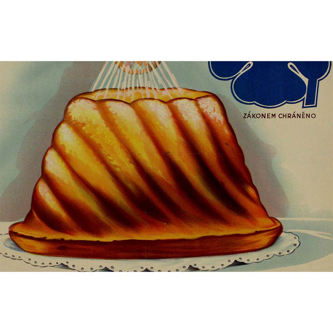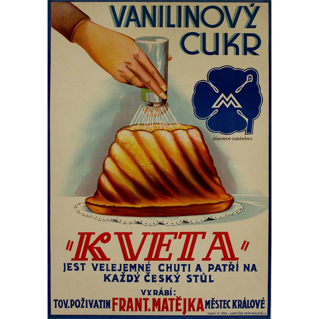 Cette publicité met en avant le « Vanilinový Cukr » (sucre vanillé), un ingrédient de pâtisserie très utilisé dans la cuisine d'Europe centrale, notamment pour la préparation de gâteaux, de viennoiseries et de desserts. La marque « KVĚTA » y est mise en évidence, soulignant son association avec un goût raffiné et une production de haute qualité. Le slogan « Jest velejemné chuti a patří na každý český stůl » (« Il a un goût très fin et a sa place sur toutes les tables tchèques ») fait appel à la fierté nationale et à la place traditionnelle de la pâtisserie dans les foyers tchèques.