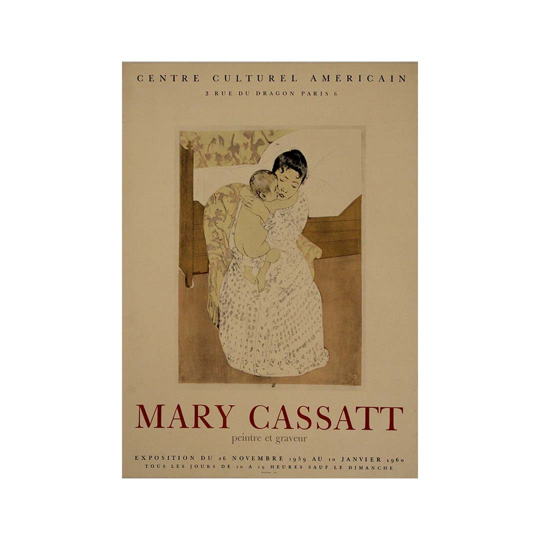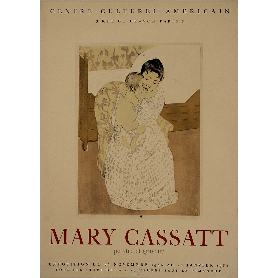 La typographie de l'affiche est d'une élégante sobriété, le titre « Peintres et graveurs au Centre culturel américain » étant mis en valeur par une police à empattements classique. Ce choix typographique s'accorde à l'esthétique raffinée des œuvres de Cassatt, conférant à l'exposition une aura de sophistication et de portée culturelle. Le texte est soigneusement positionné pour équilibrer la composition, veillant à renforcer, plutôt qu'à nuire, à l'impact visuel de l'image centrale.