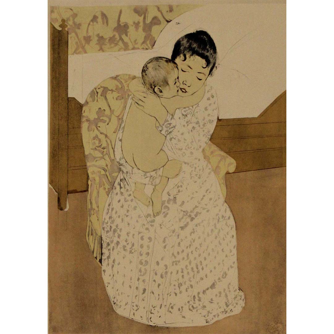 L'image centrale de l'affiche capture l'essence du style de Cassatt, offrant un portrait tendre et détaillé d'une mère et de son enfant. La composition, à la fois intime et chaleureuse, invite le spectateur à partager un moment de douce affection et de complicité. La maîtrise avec laquelle Cassatt dessine les personnages, avec leurs contours doux et leurs traits expressifs, témoigne de son talent pour transmettre une profonde émotion à travers son art.