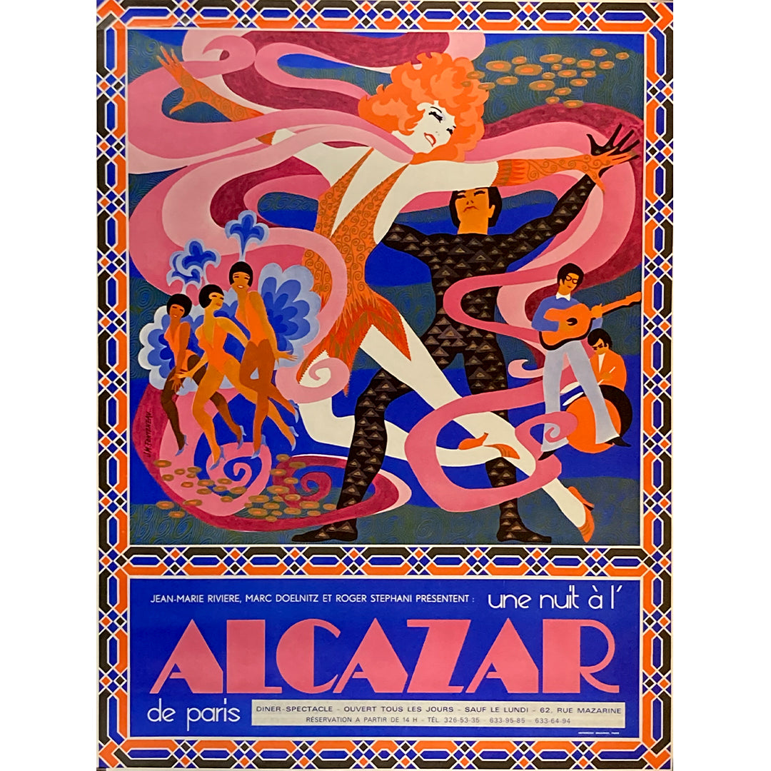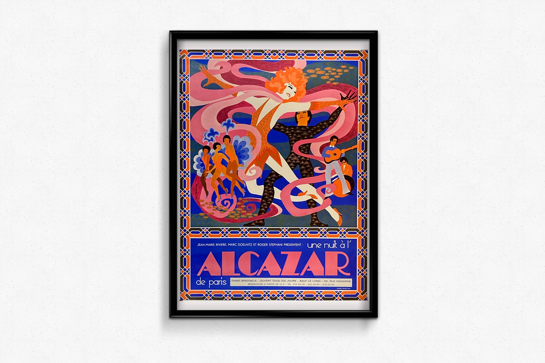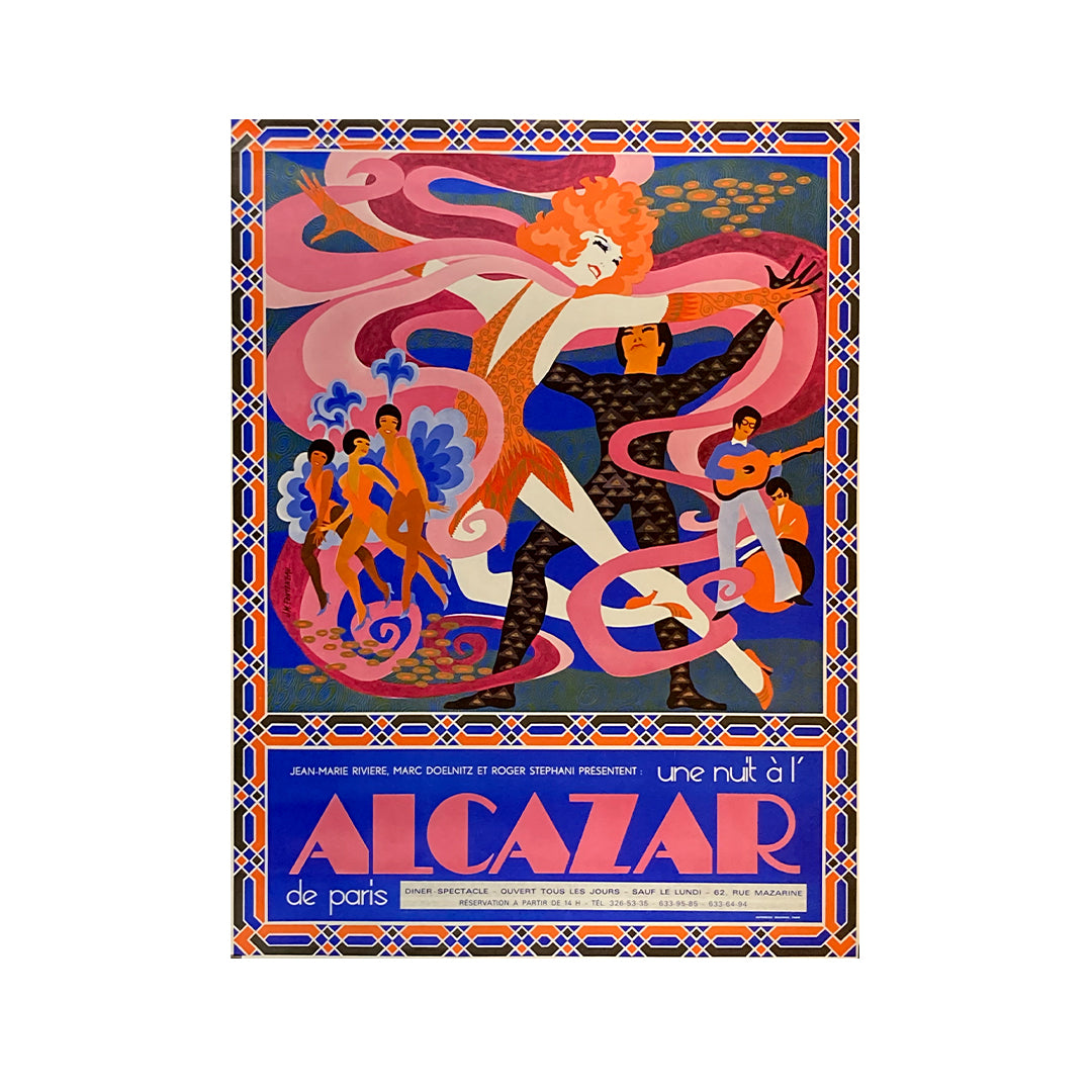 Une splendide affiche conçue par JM Fonteneau pour promouvoir l'Alcazar, un restaurant situé au numéro 62 de la rue Mazarine, dans le 6e arrondissement de Paris.