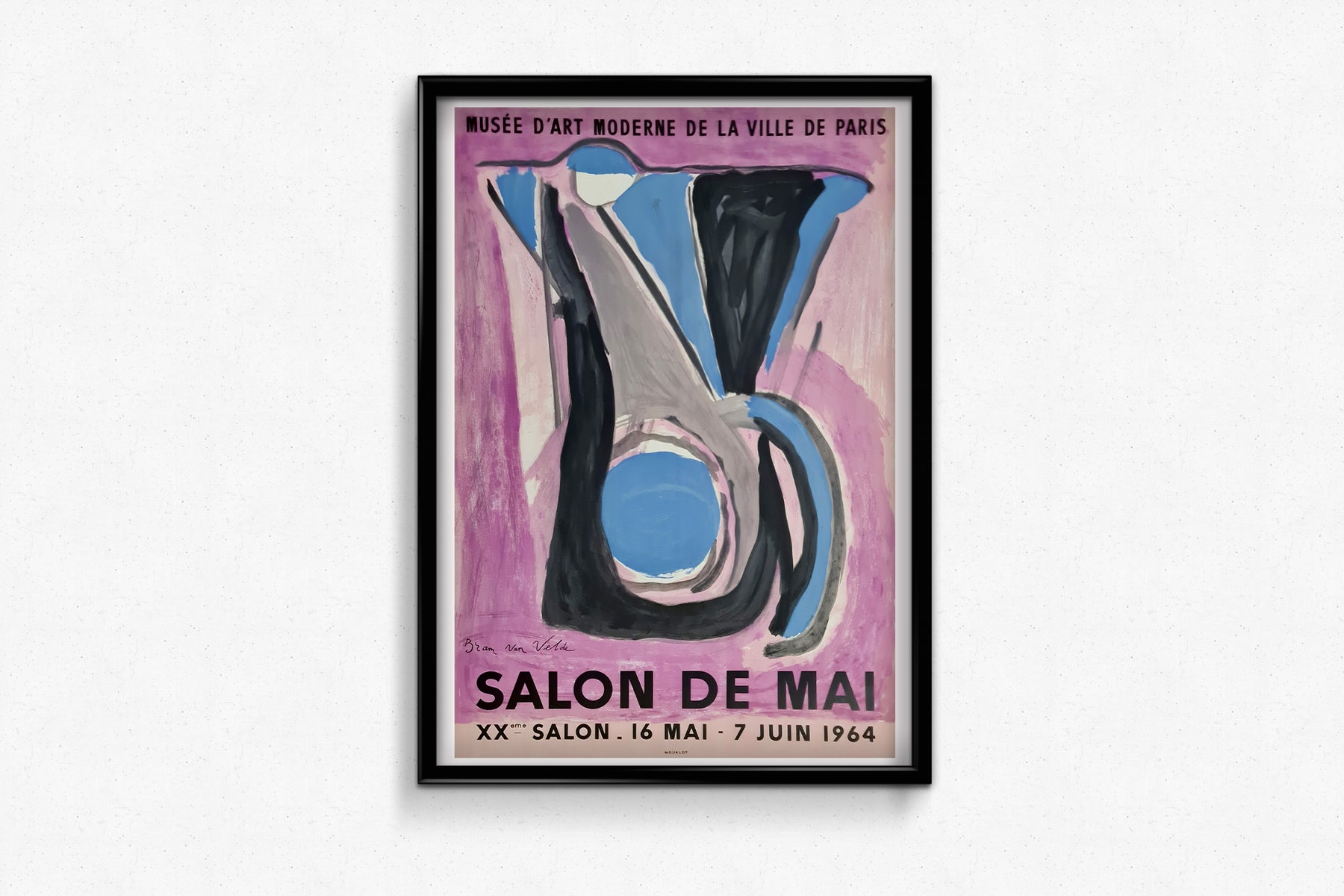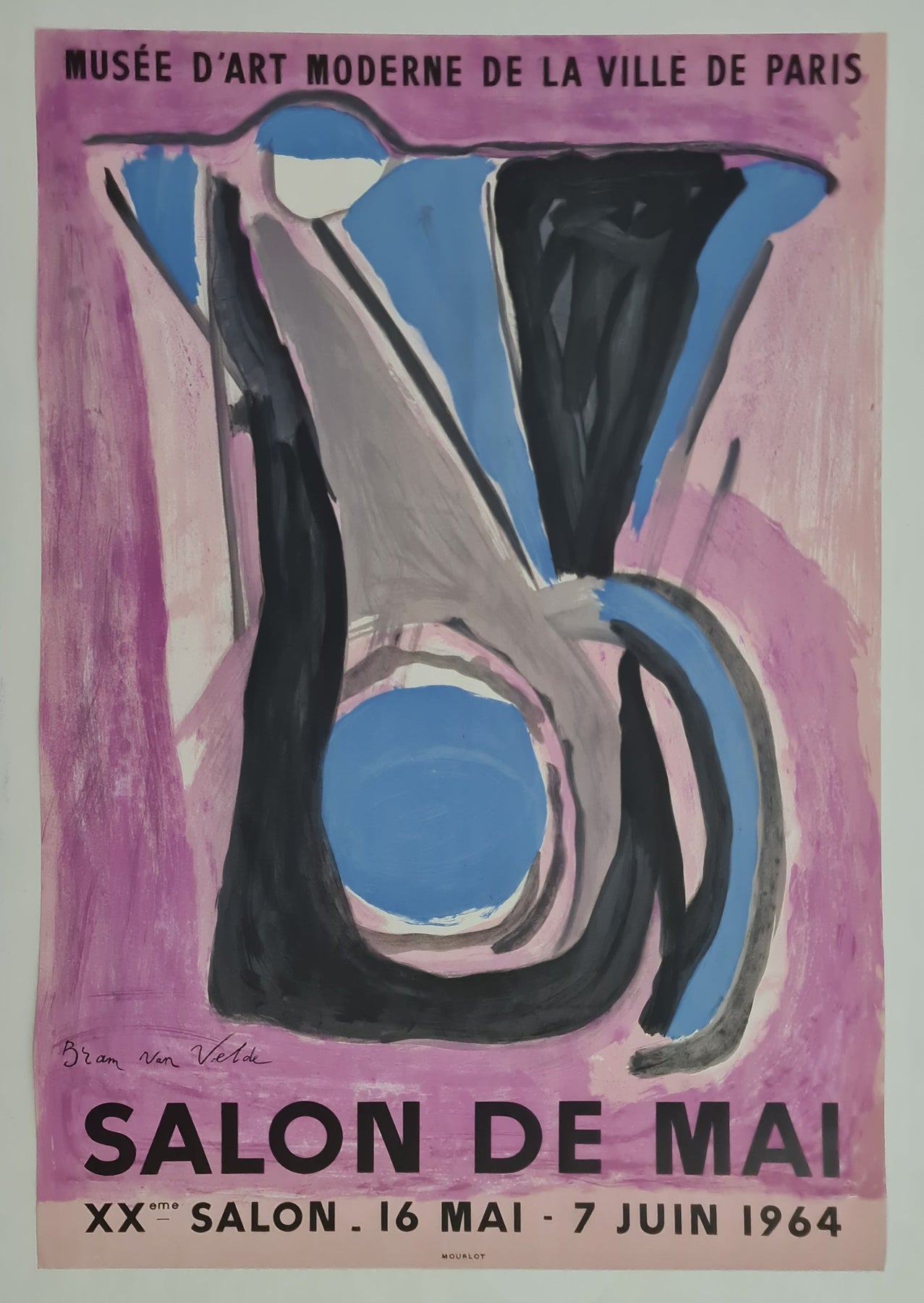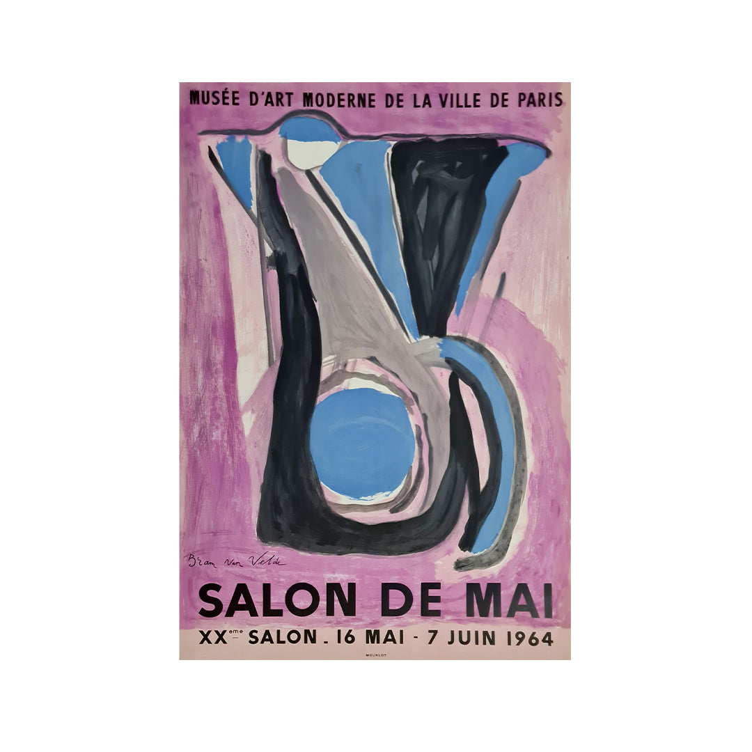 Vivante, abstraite et résolument moderne, cette affiche originale de 1964 a été créée par Bram Van Velde pour le 20e Salon de Mai, présenté au Musée d'Art Moderne de la Ville de Paris. Par son coup de pinceau expressif et son audacieux jeu de formes, cette création saisissante illustre l'intensité gestuelle et la tension émotionnelle qui ont caractérisé la place singulière de Van Velde dans l'art européen d'après-guerre.