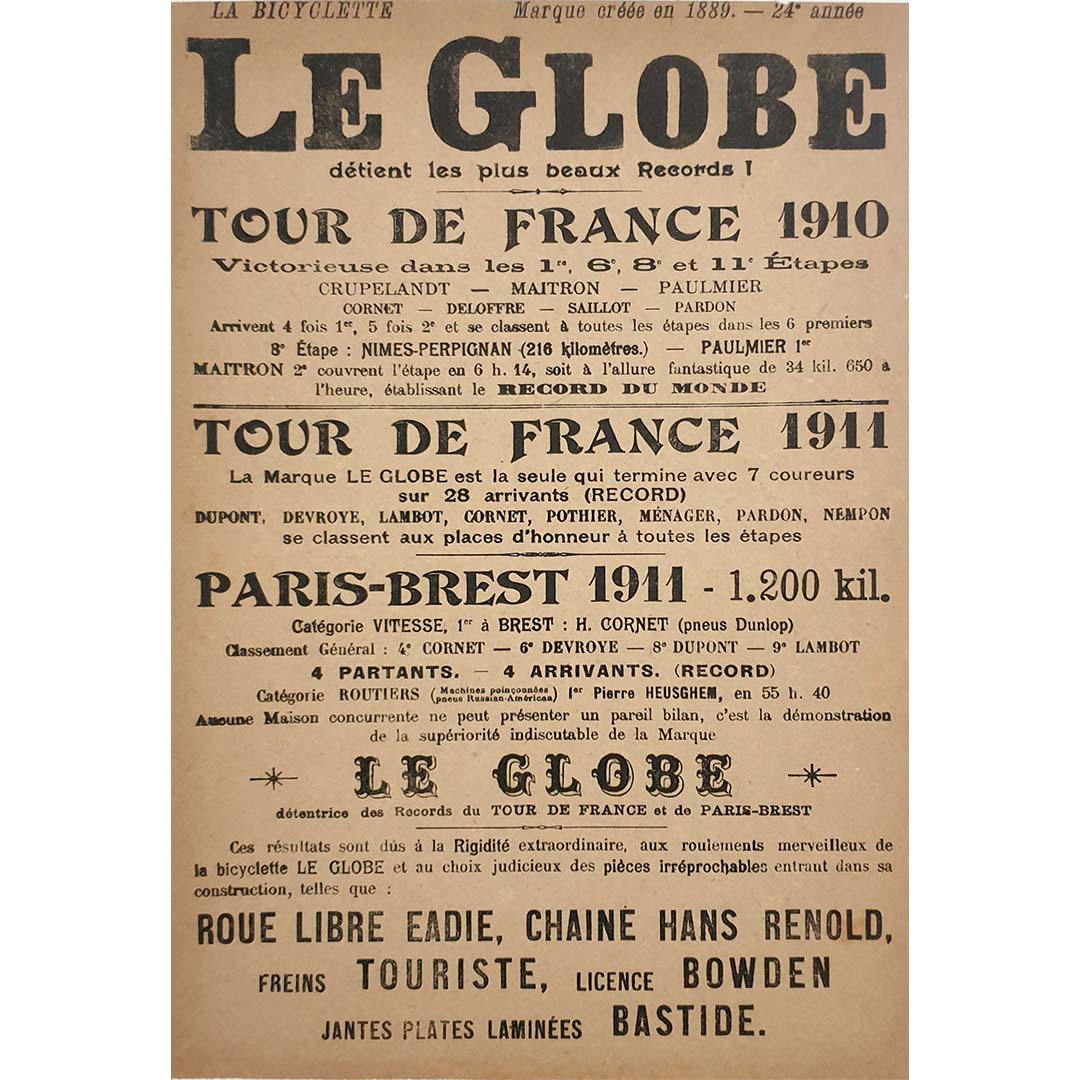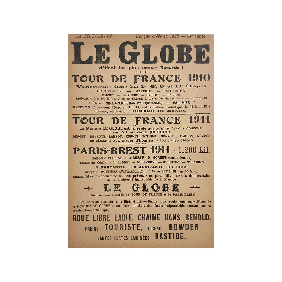L'affiche originale de 1911 pour La Bicyclette - Le Globe est un témoignage remarquable de la culture cycliste du début du XXe siècle et de l'essor du marketing sportif compétitif. Créée pour promouvoir la marque de vélos Le Globe , cette affiche met l'accent sur son association avec des exploits cyclistes majeurs, notamment des victoires dans des courses prestigieuses comme le Tour de France de 1910 et 1911 et la redoutable course Paris-Brest-Paris de 1911.