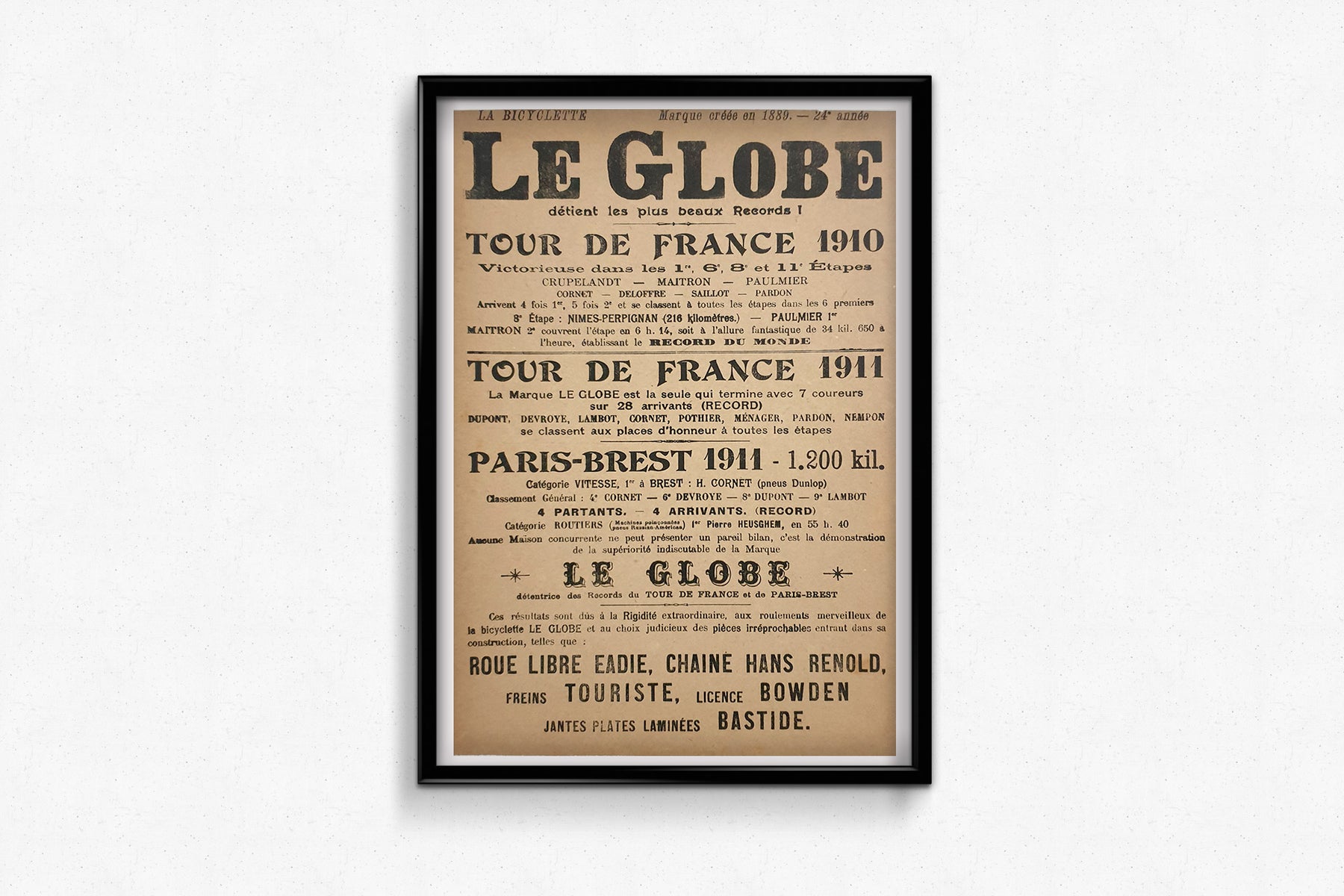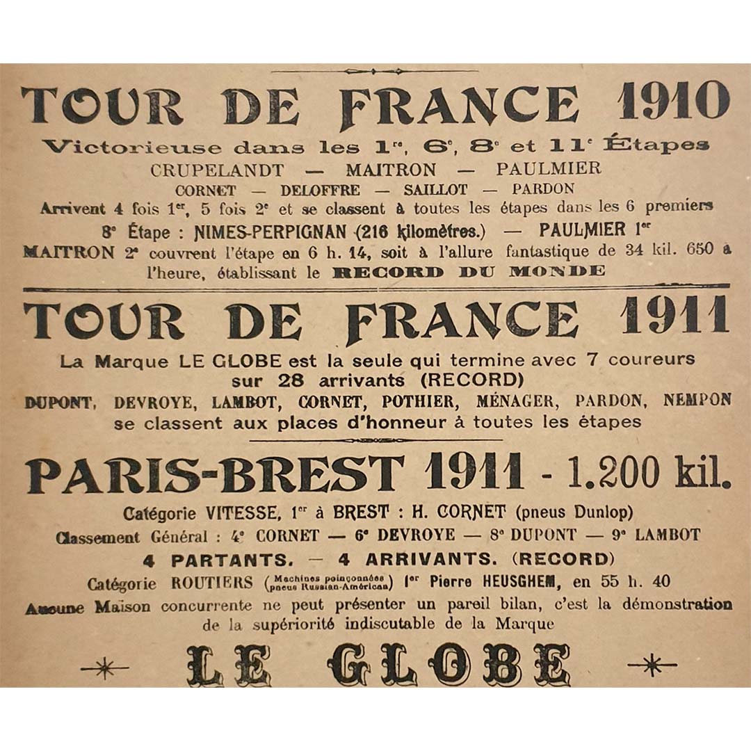Les victoires des cyclistes utilisant les vélos Le Globe sont fièrement célébrées sur l'affiche, avec des références détaillées aux victoires d'étape sur le Tour de France et aux records extraordinaires établis lors de Paris-Brest-Paris. Le texte détaillé retrace ces exploits et témoigne de la fiabilité et de la supériorité de la marque.