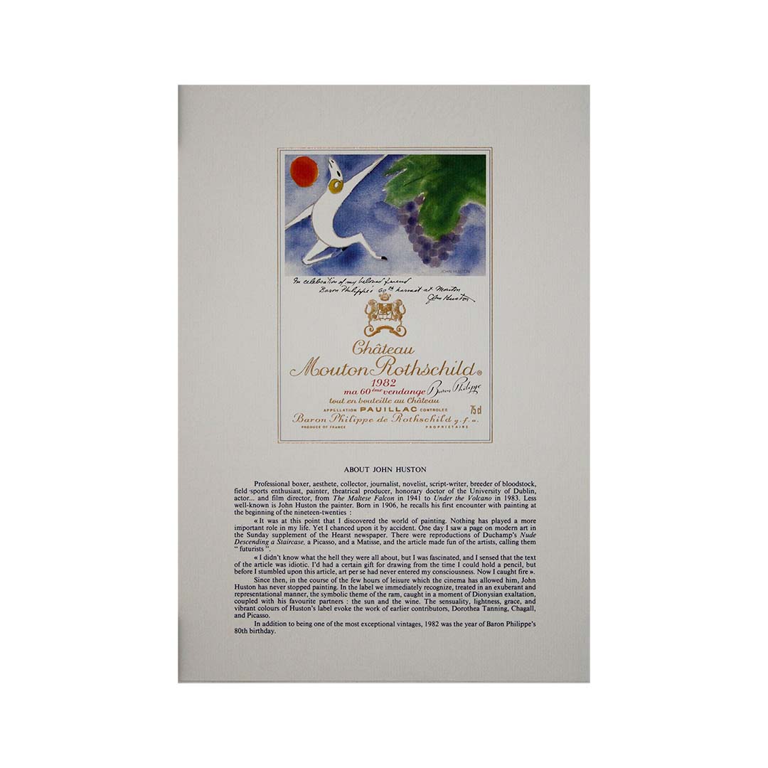 L'illustration représente une figure abstraite et espiègle tendant la main vers un soleil rouge éclatant se détachant sur un ciel d'un bleu profond, tandis qu'une vigne richement peinte orne un coin. Le mouvement et la vitalité qui s'en dégagent reflètent l'exubérance du millésime et l'énergie créatrice de l'artiste. La dédicace manuscrite de Huston au baron Philippe de Rothschild confère à l'œuvre une dimension personnelle et intime, célébrant les soixante vendanges sous son égide.