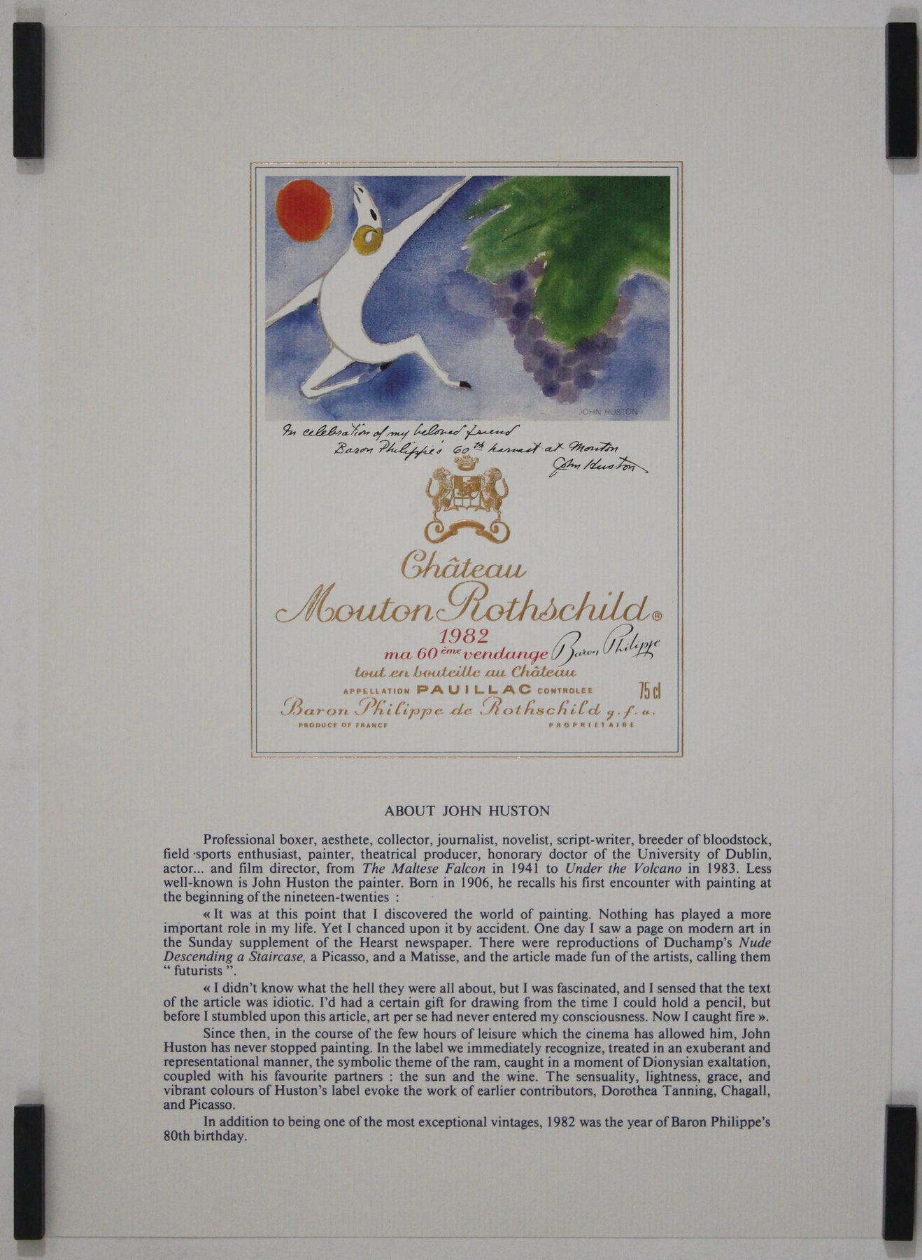 John Huston (1906-1987), célèbre réalisateur, scénariste et acteur hollywoodien, était également un fervent peintre. Son œuvre pour l'étiquette Mouton Rothschild de 1982 témoigne de l'influence des maîtres modernistes tels que Picasso et Chagall, par son utilisation audacieuse de la couleur, des formes et de coups de pinceau expressifs.