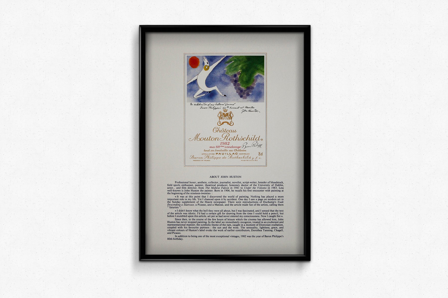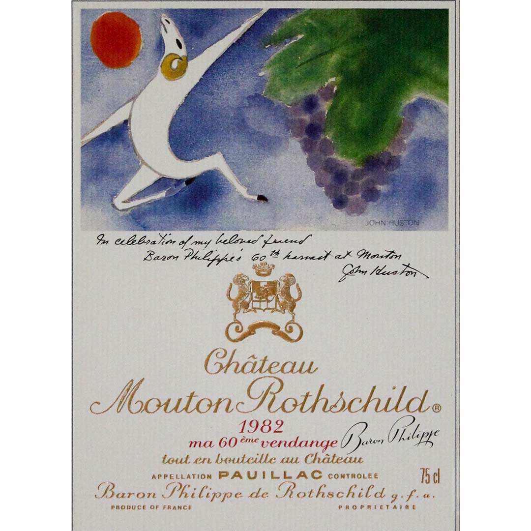 L'étiquette du Château Mouton Rothschild 1982, conçue par le légendaire cinéaste et artiste John Huston, est une fusion unique entre grand vin et expression artistique. Commandée dans le cadre de la longue tradition du domaine qui consiste à faire appel à des artistes de renom pour ses étiquettes, l'œuvre de Huston capture l'esprit joyeux de la vinification à travers une composition à la fois fantaisiste et dynamique.