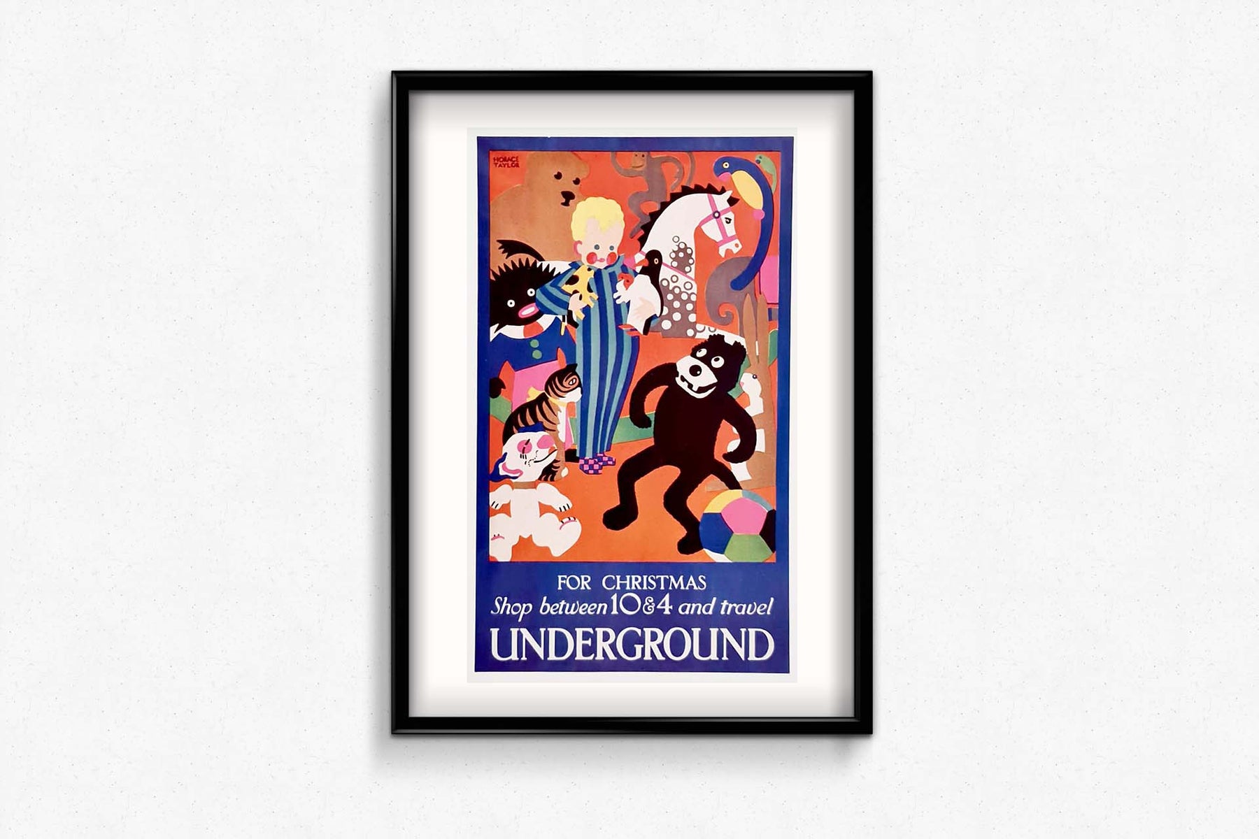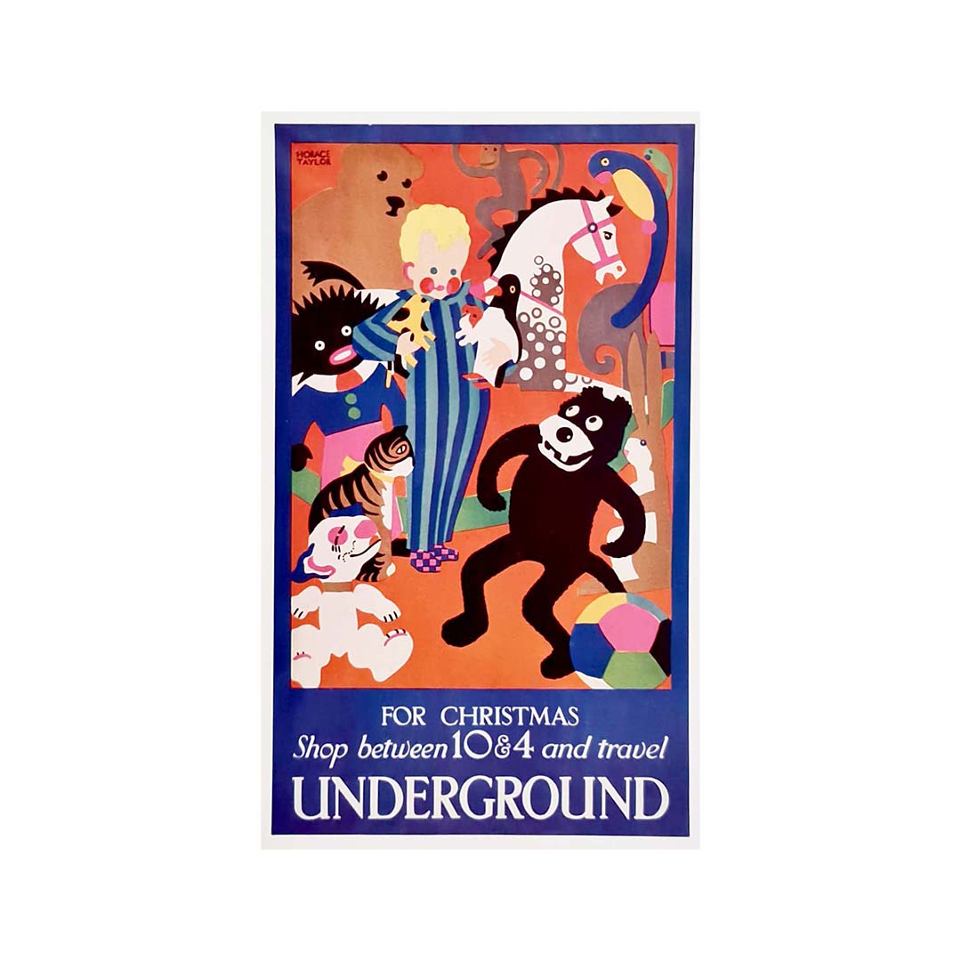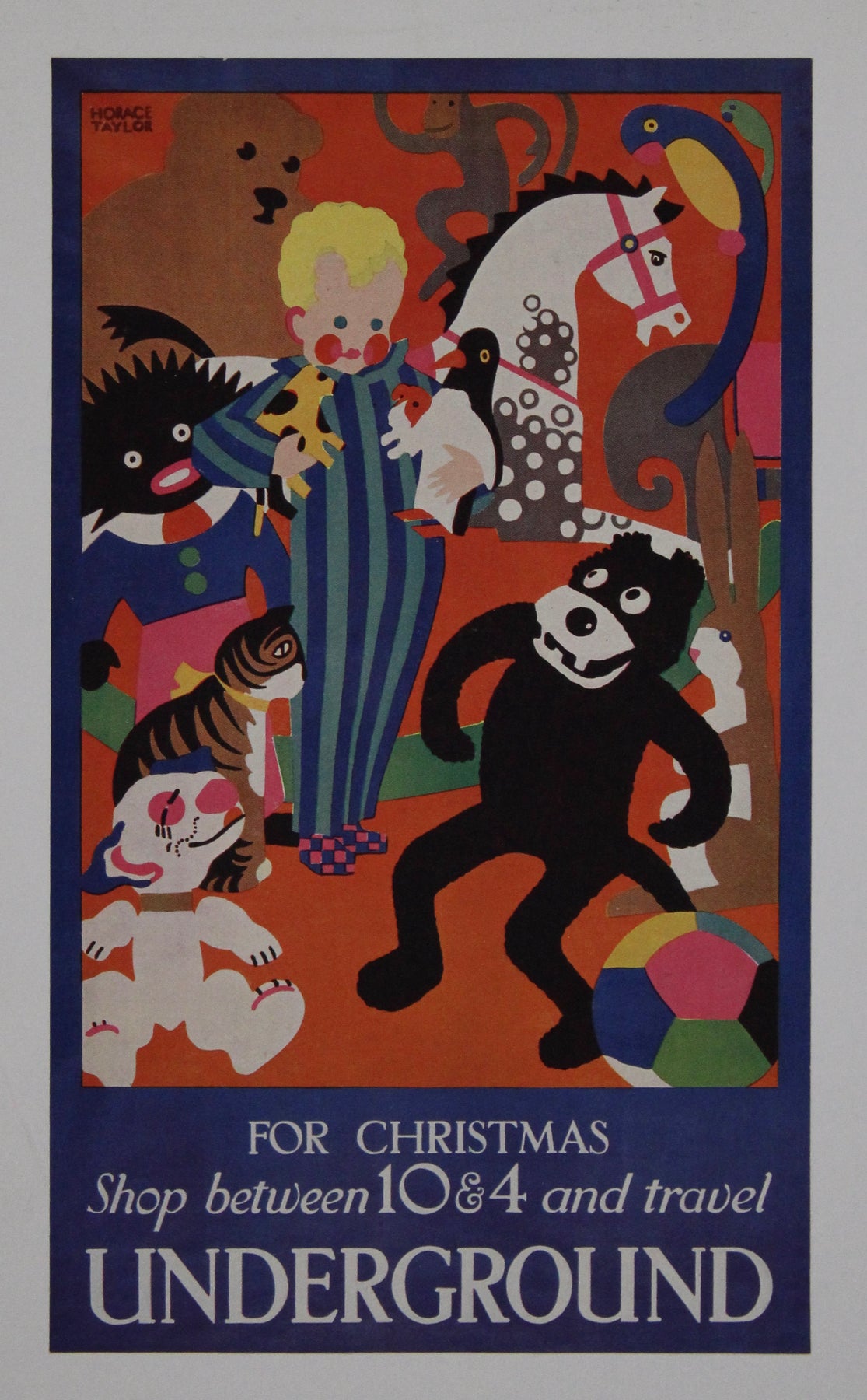 Cette affiche de 1924 a été conçue pour le métro londonien à l'occasion de Noël. Elle représente un enfant entouré de jouets, dont un cheval à bascule, un ballon et diverses peluches.