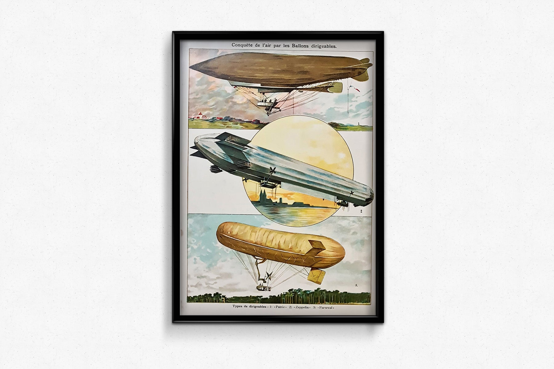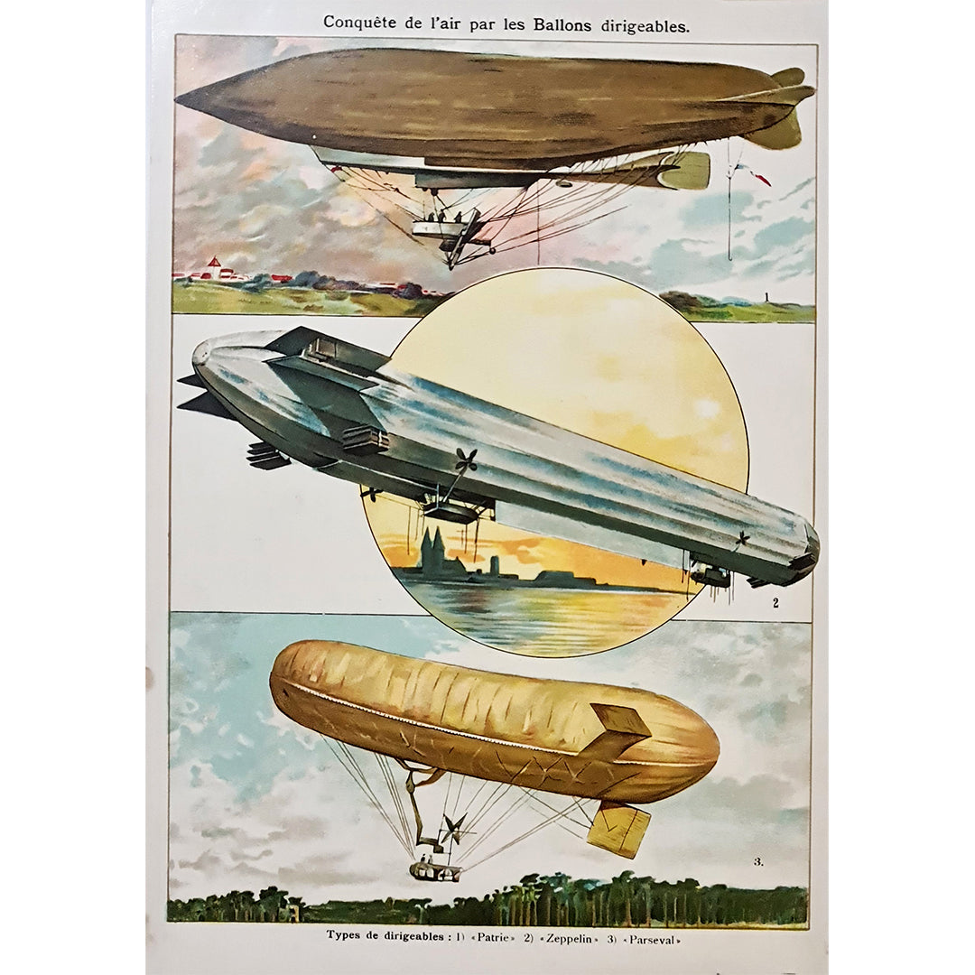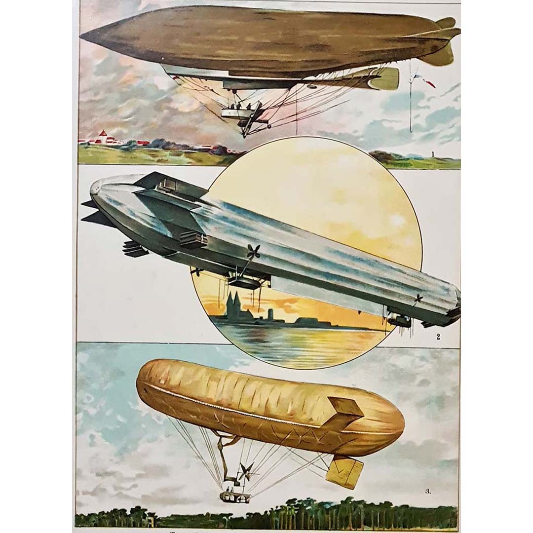 Une magnifique affiche réalisée vers 1950, illustrant les différents ballons dirigeables qui ont contribué à la conquête des airs.