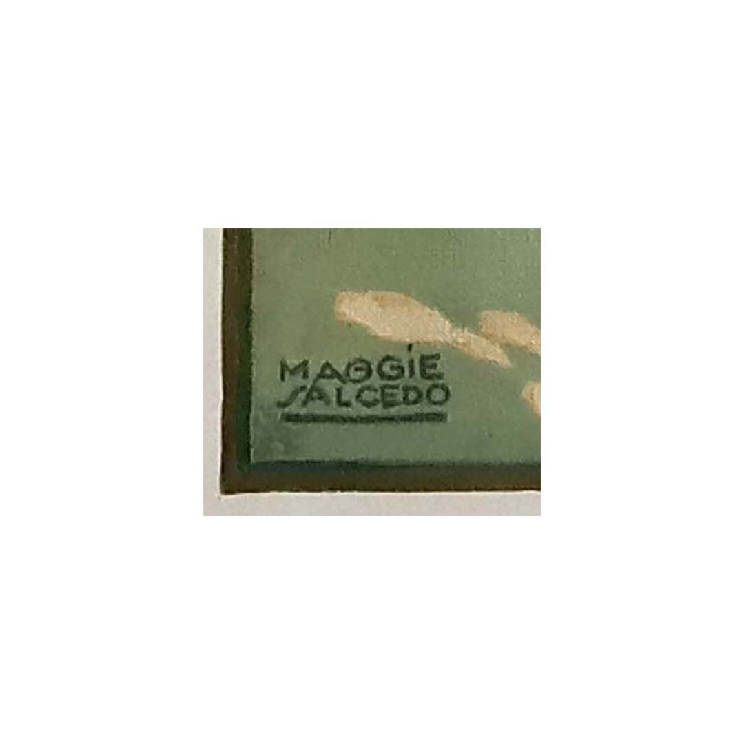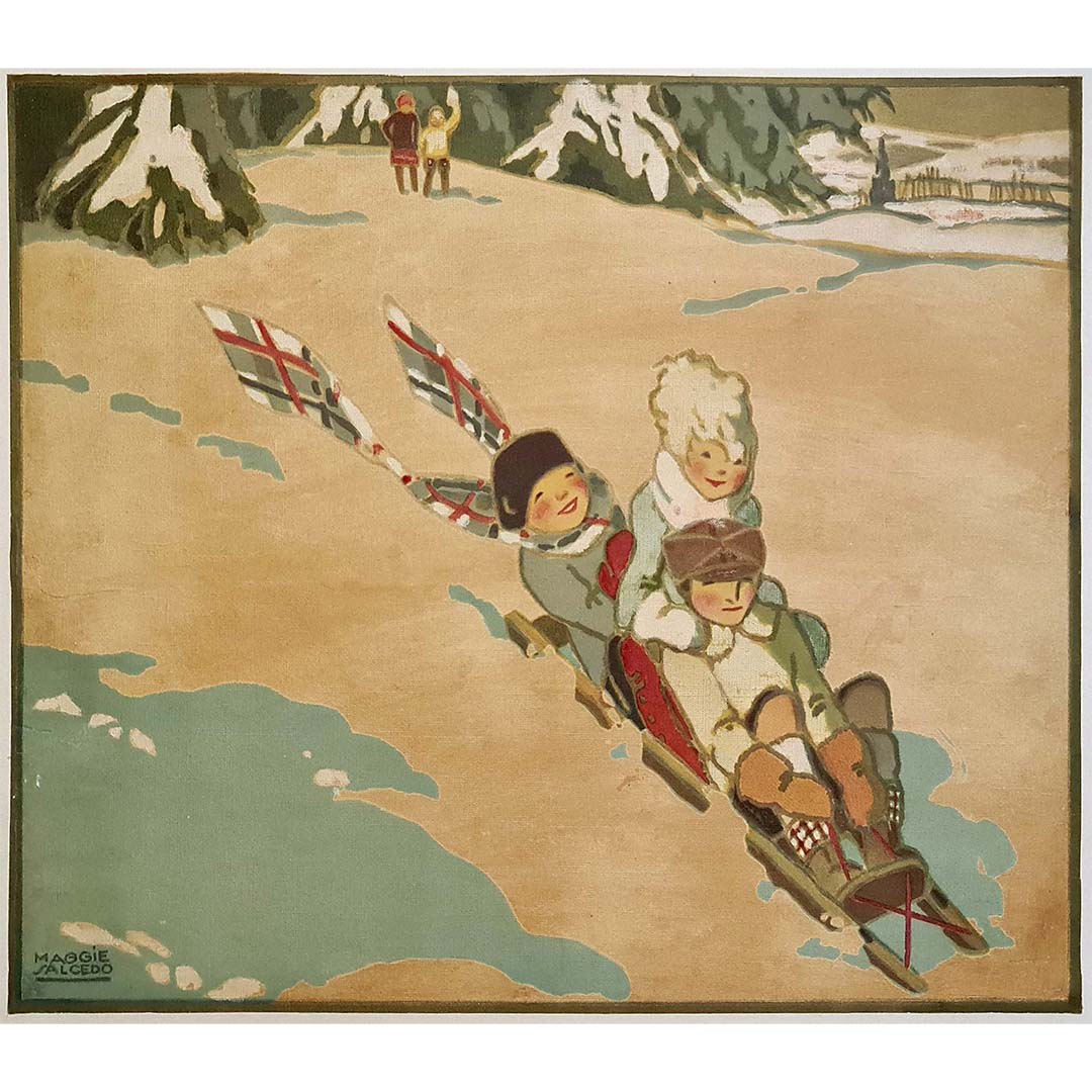 Magnifique affiche originale de Maggie Salcedo représentant une descente en luge. Maggie Salcedo (1890-1959) était une peintre et illustratrice française de l'Art déco.