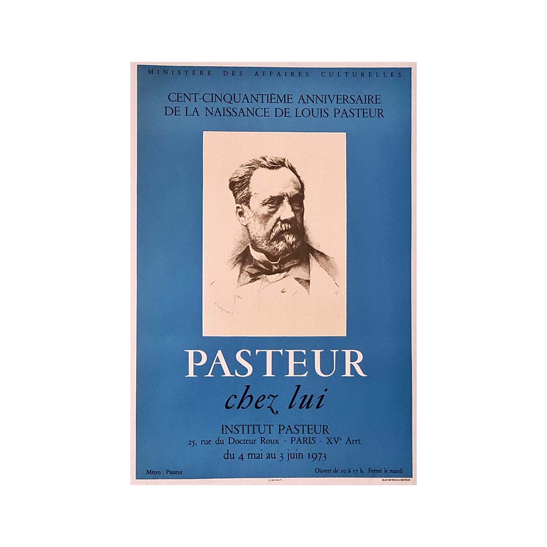 Affiche originale de Champolion pour le cent cinquantième anniversaire de la naissance de Louis Pasteur, réalisée par le ministère de la Culture. Louis Pasteur était un chimiste et microbiologiste français, célèbre pour ses découvertes sur les principes de la vaccination, de la fermentation microbienne et de la pasteurisation, cette dernière portant son nom. Ses recherches en chimie ont permis des avancées remarquables dans la compréhension des causes et de la prévention des maladies, jetant ainsi les bases de l'hygiène, de la santé publique et d'une grande partie de la médecine moderne.
