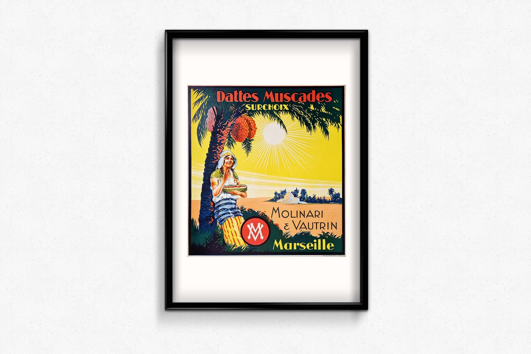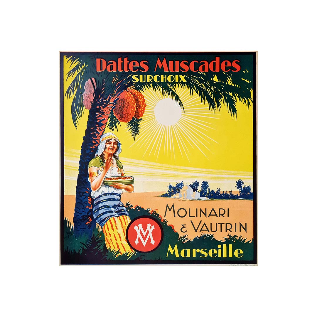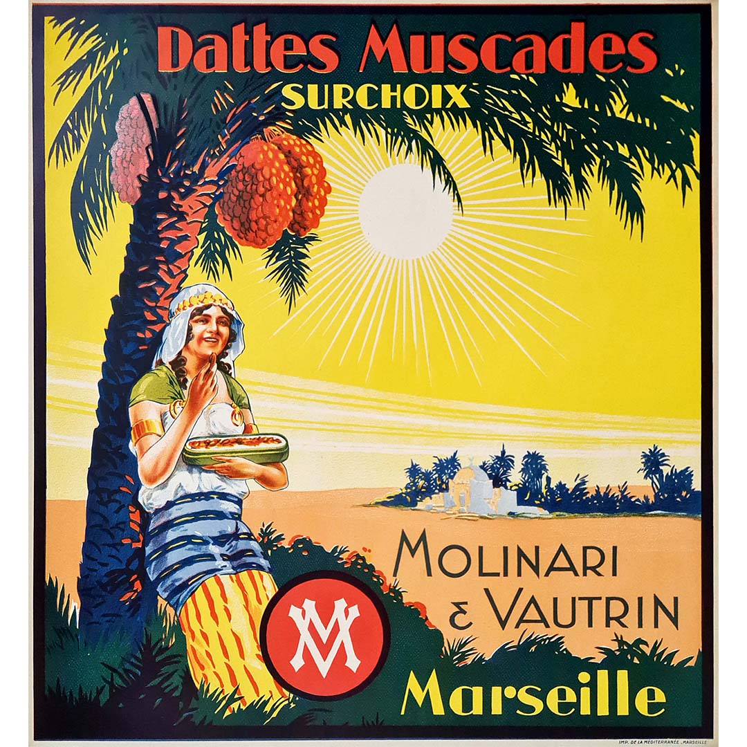 Très belle affiche pour les dattes Molinari et Vautrin et la noix de muscade Surchoix.