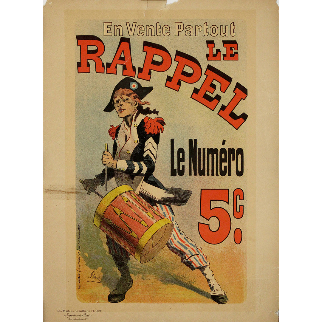 Cette lithographie vibrante de Jules Chéret a été créée en 1898 comme planche 209 de la série Les Maîtres de l'Affiche . Intitulée Le Rappel , elle fait la publicité du populaire quotidien républicain français du même nom, vantant son prix abordable de seulement cinq centimes par numéro.