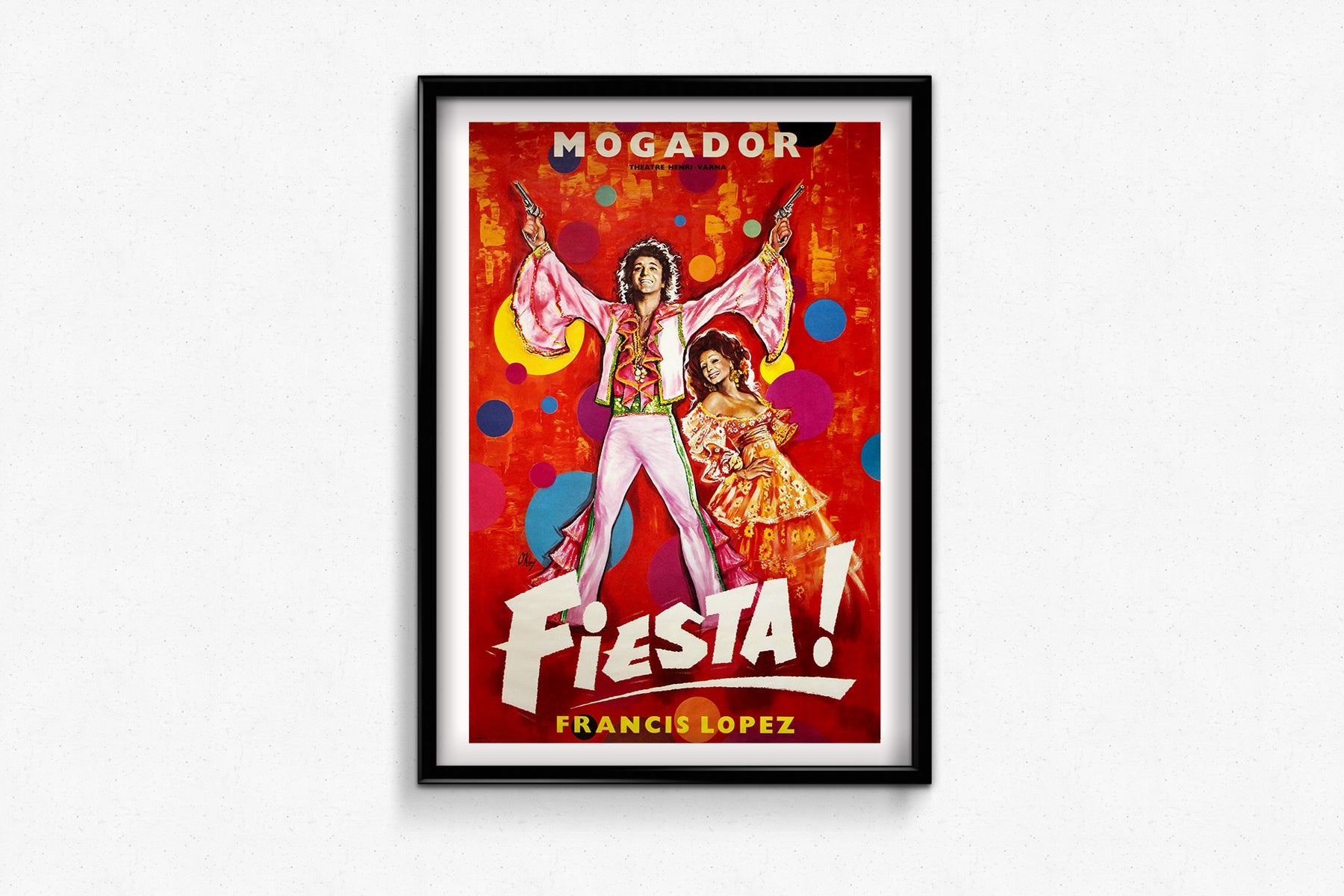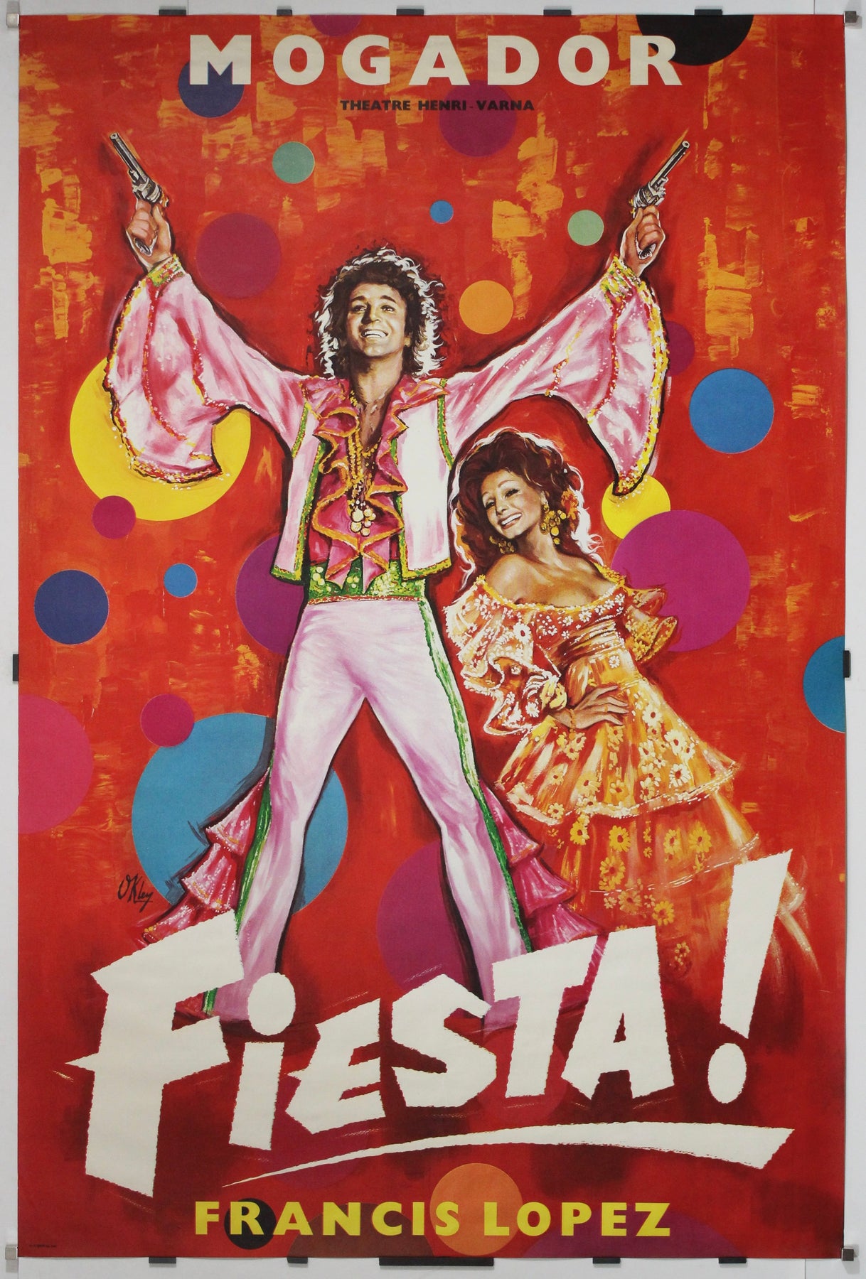 Commandée pour le Théâtre Mogador, sous la direction d'Henri Varna, l'affiche traduit l'énergie visuelle du spectacle par des rouges éclatants, des pois saturés et deux stars resplendissantes saisies en pleine célébration. Les personnages principaux, vêtus de costumes flamboyants de style flamenco, ornés de sequins, rayonnent de joie : le premier rôle masculin brandit des pistolets comme des castagnettes et le premier rôle féminin adopte une posture digne d'une danseuse classique.