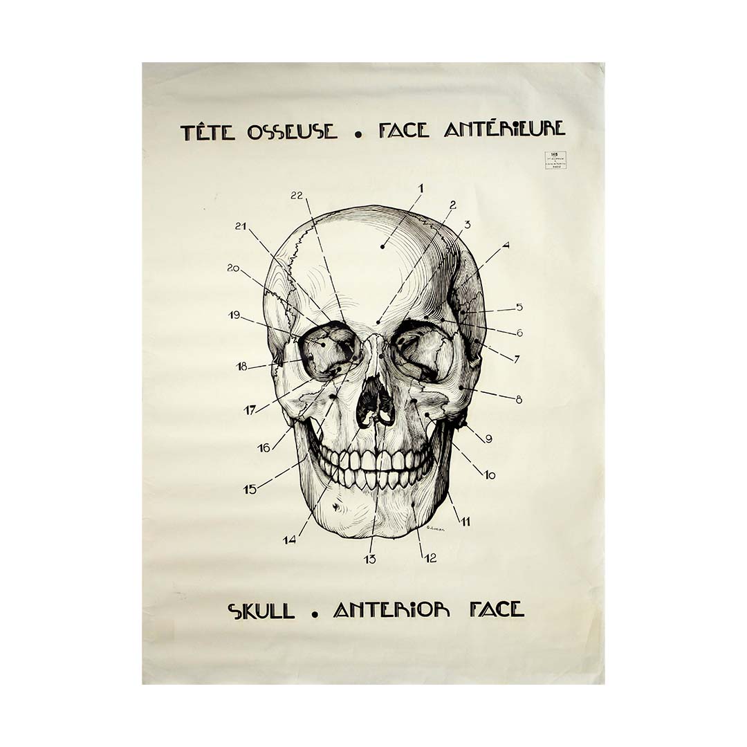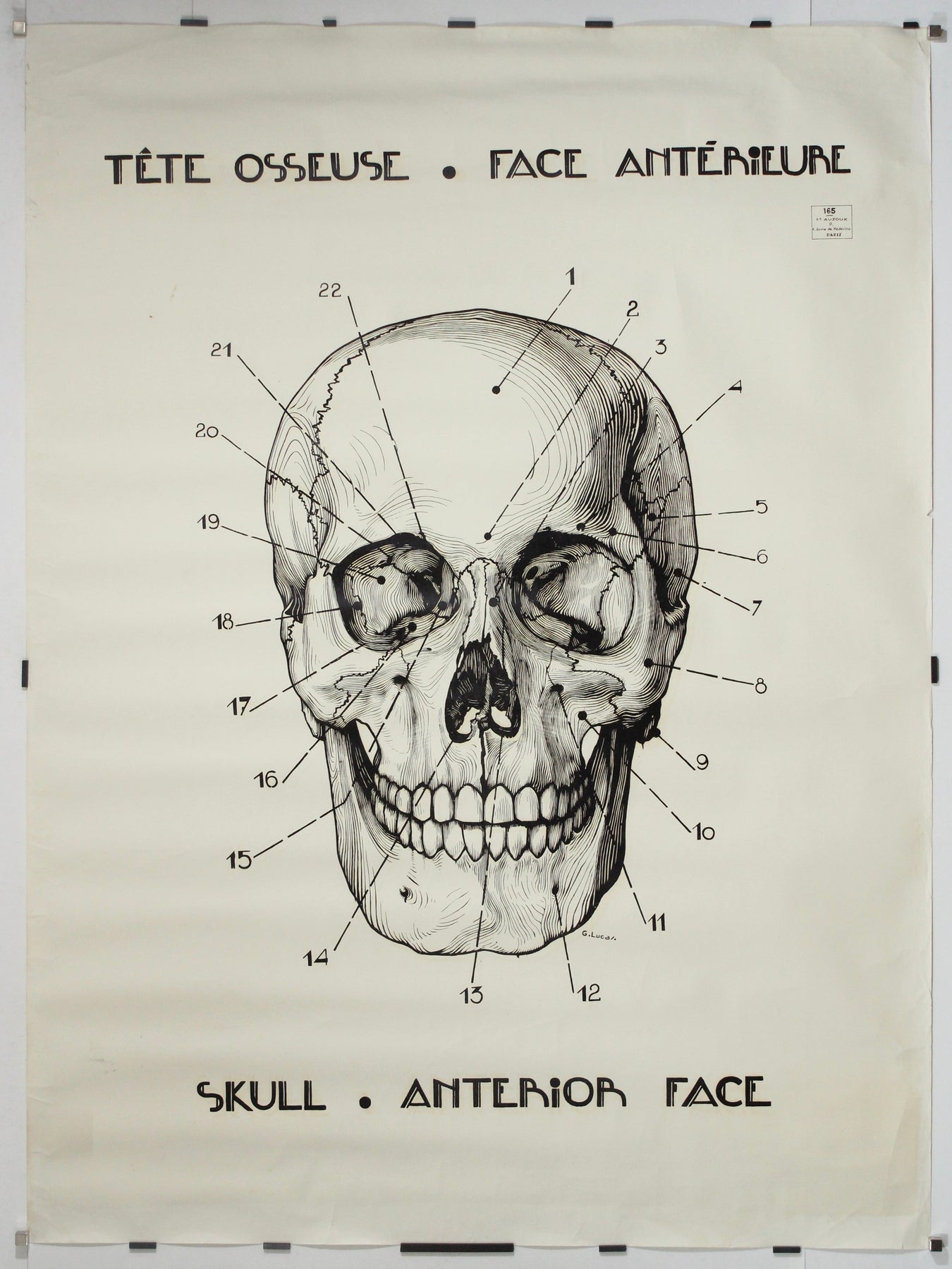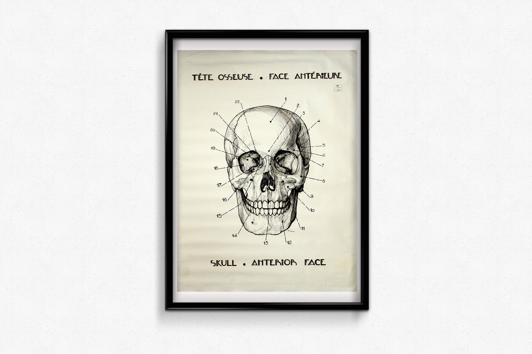 Cette affiche anatomique française originale datant d'environ 1950, intitulée Tête osseuse – Face antérieure , a été créée par G. Lucas à des fins pédagogiques et est basée sur le travail du légendaire anatomiste Dr Louis Auzoux.