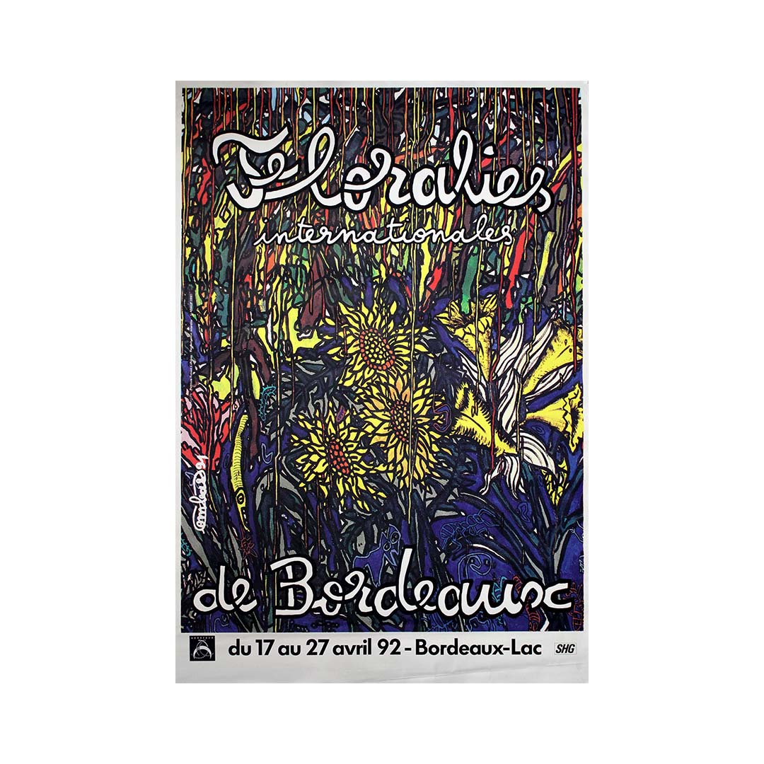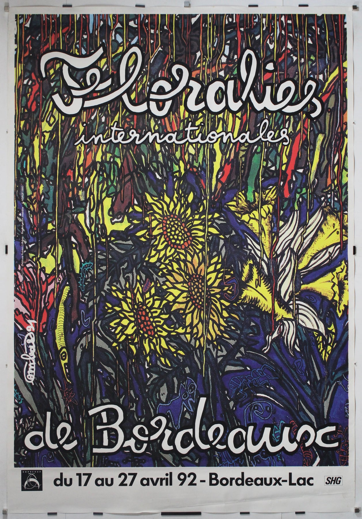 Cette affiche originale saisissante de 1992, signée par l'artiste français Robert Combas, a été créée pour les Floralies Internationales de Bordeaux, grande fête de l'horticulture organisée à Bordeaux-Lac. Véritable explosion de couleurs et de lignes, Combas transforme le langage visuel de l'art floral en un festival vibrant et chaotique de formes fleuries.