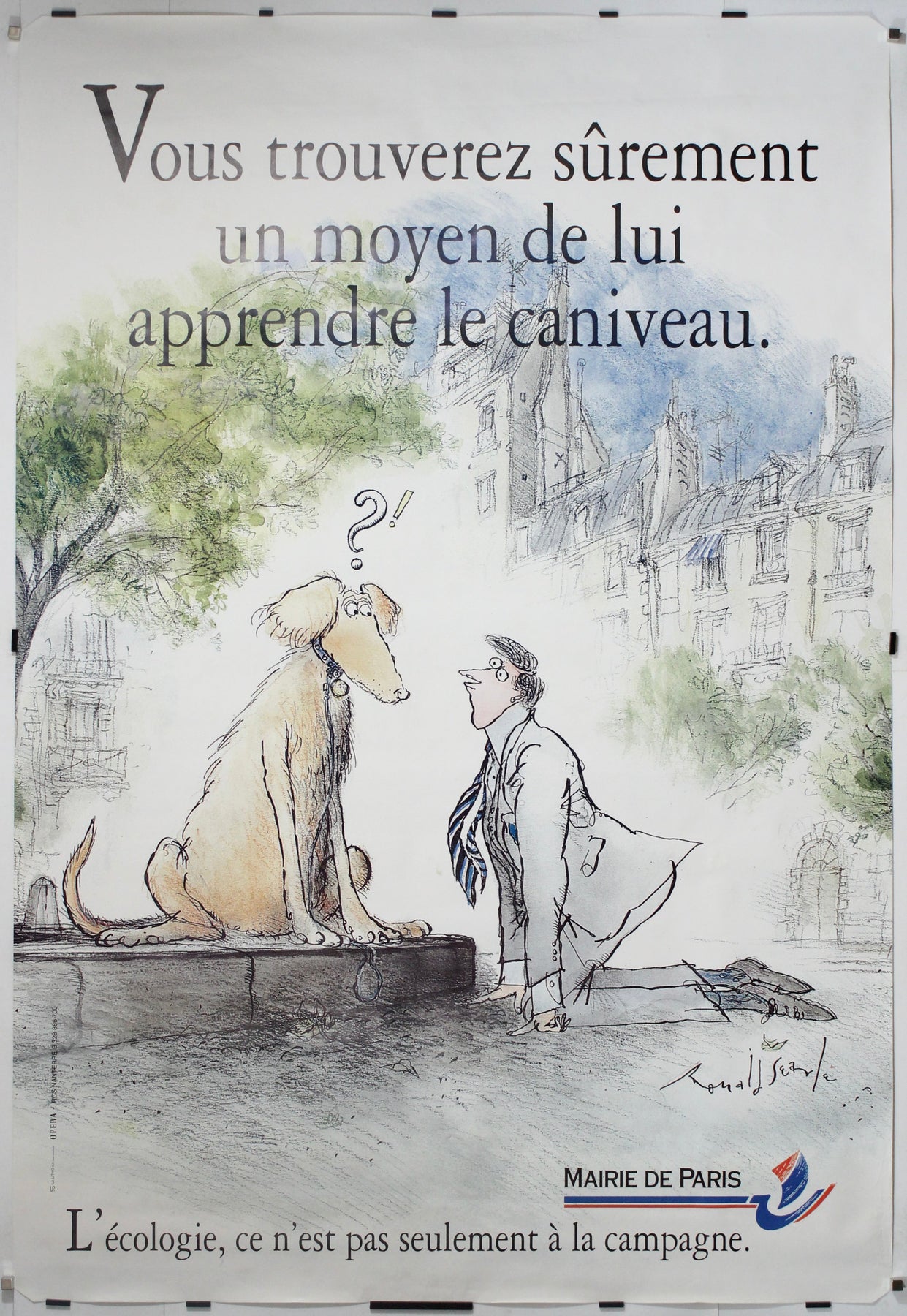 « Vous trouverez sûrement un moyen de lui apprendre le caniveau » est une affiche originale charmante et satirique datant d'environ 1985, commandée par la Mairie de Paris dans le cadre de sa campagne d'hygiène publique. Illustrée par le légendaire dessinateur britannique Ronald Searle, l'affiche aborde avec humour la propreté urbaine à travers le prisme subtil de l'esprit, du caractère et du sens civique.