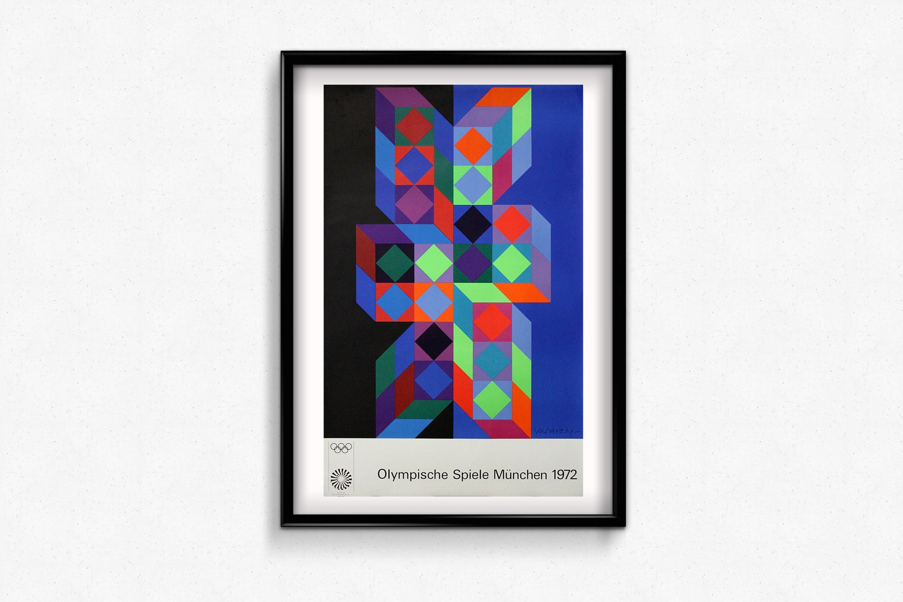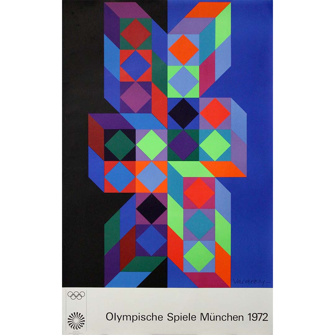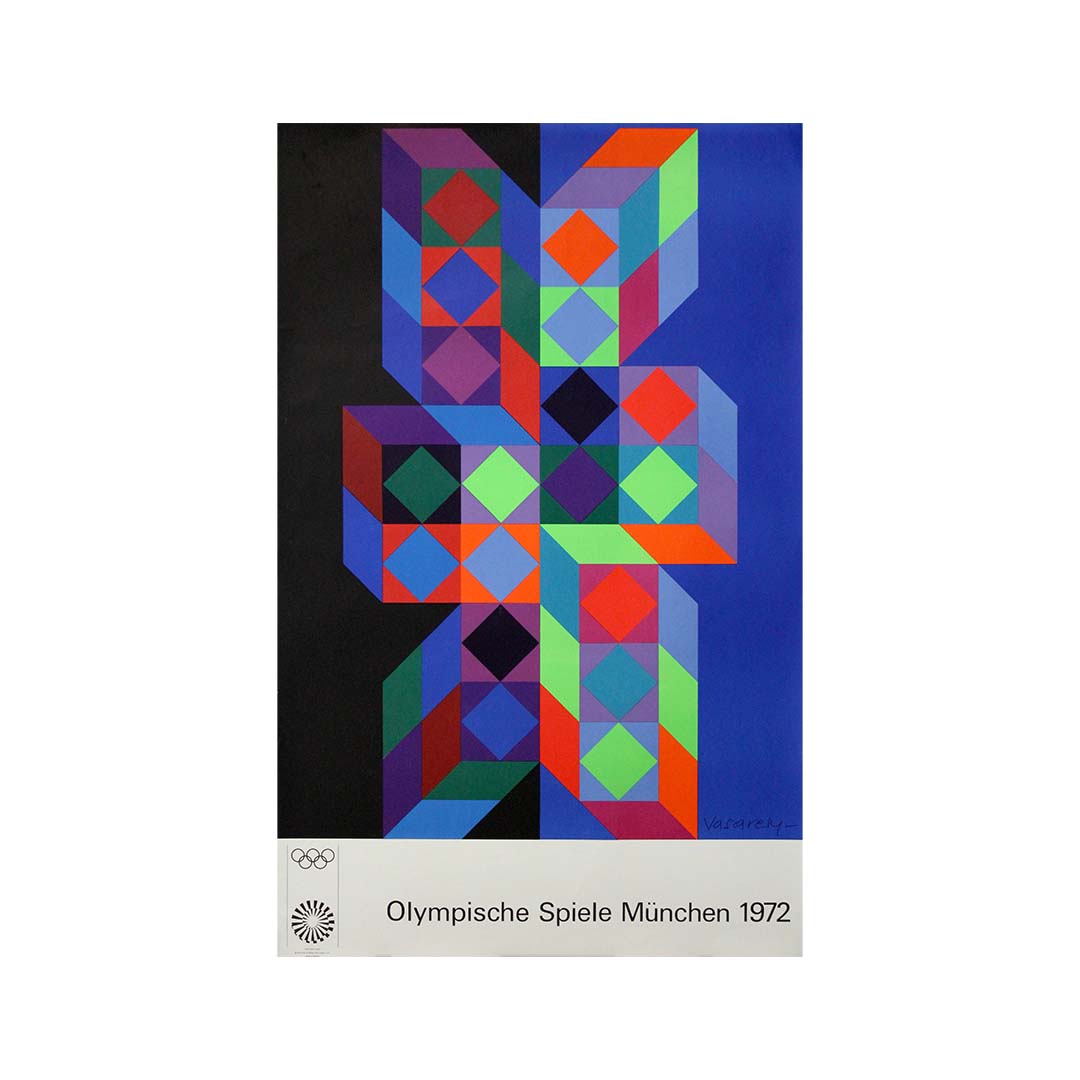 Fusion saisissante d'esthétique moderniste et d'esprit olympique, cette affiche originale de 1972 signée Victor Vasarely s'impose comme l'une des contributions les plus emblématiques à l'identité visuelle des Jeux de Munich. Père de l'Op Art, Vasarely a imposé sa précision géométrique et son jeu optique caractéristiques sur la scène internationale, créant une œuvre à la fois abstraite, mathématique et profondément dynamique.