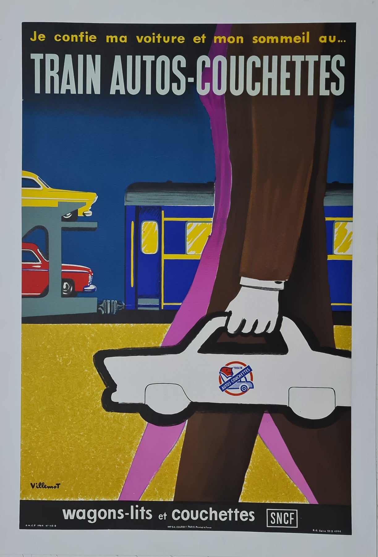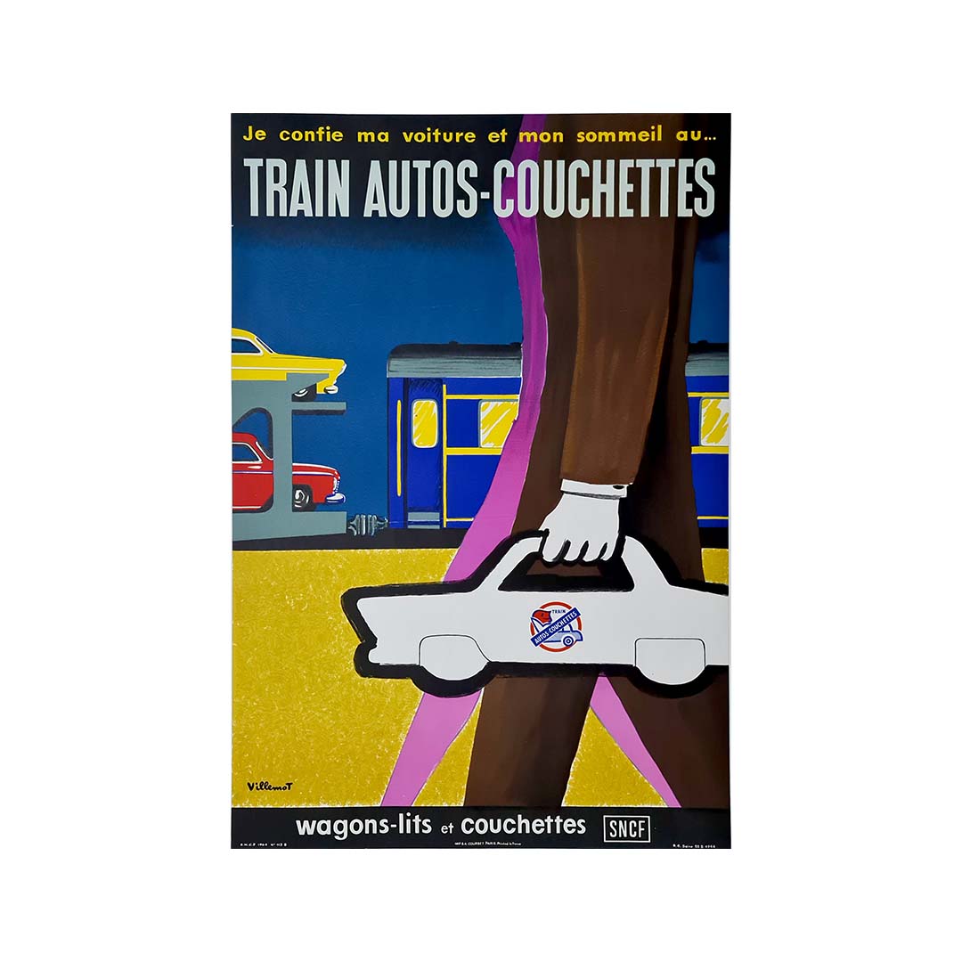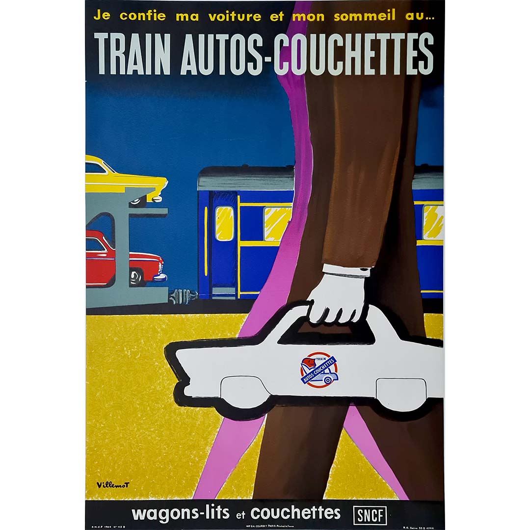 L'affiche originale de 1964, conçue par Villemot pour le service Train Autos-Couchettes de la SNCF, est une pièce majeure de l'histoire de la publicité du milieu du XXe siècle. Avec le slogan « Je confie ma voiture et mon sommeil au… » , elle met en avant ce service novateur qui permettait aux voyageurs de transporter leur voiture en train tout en profitant du confort des compartiments-lits.