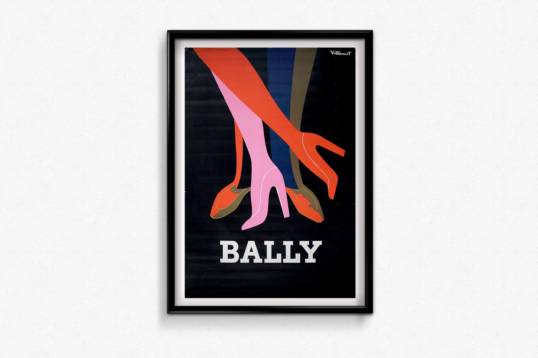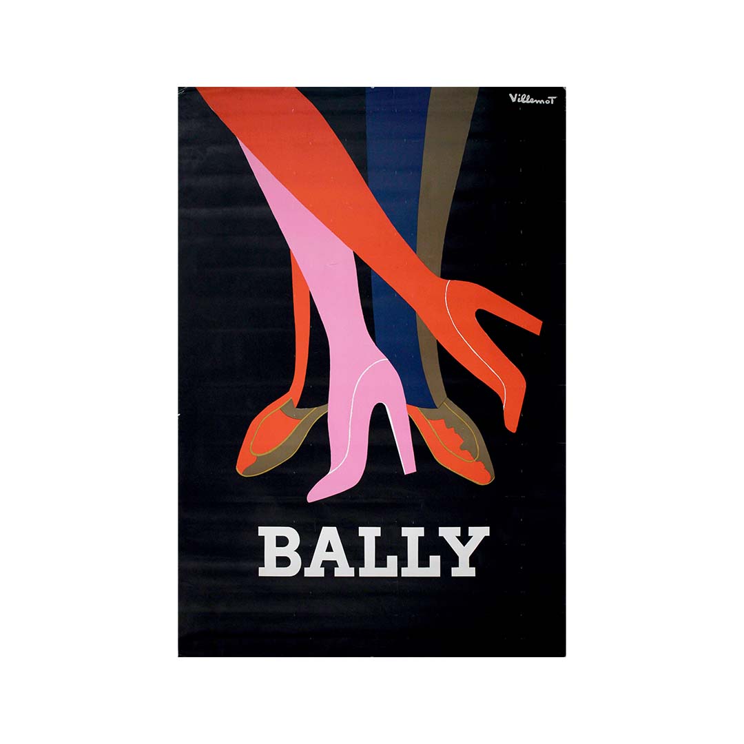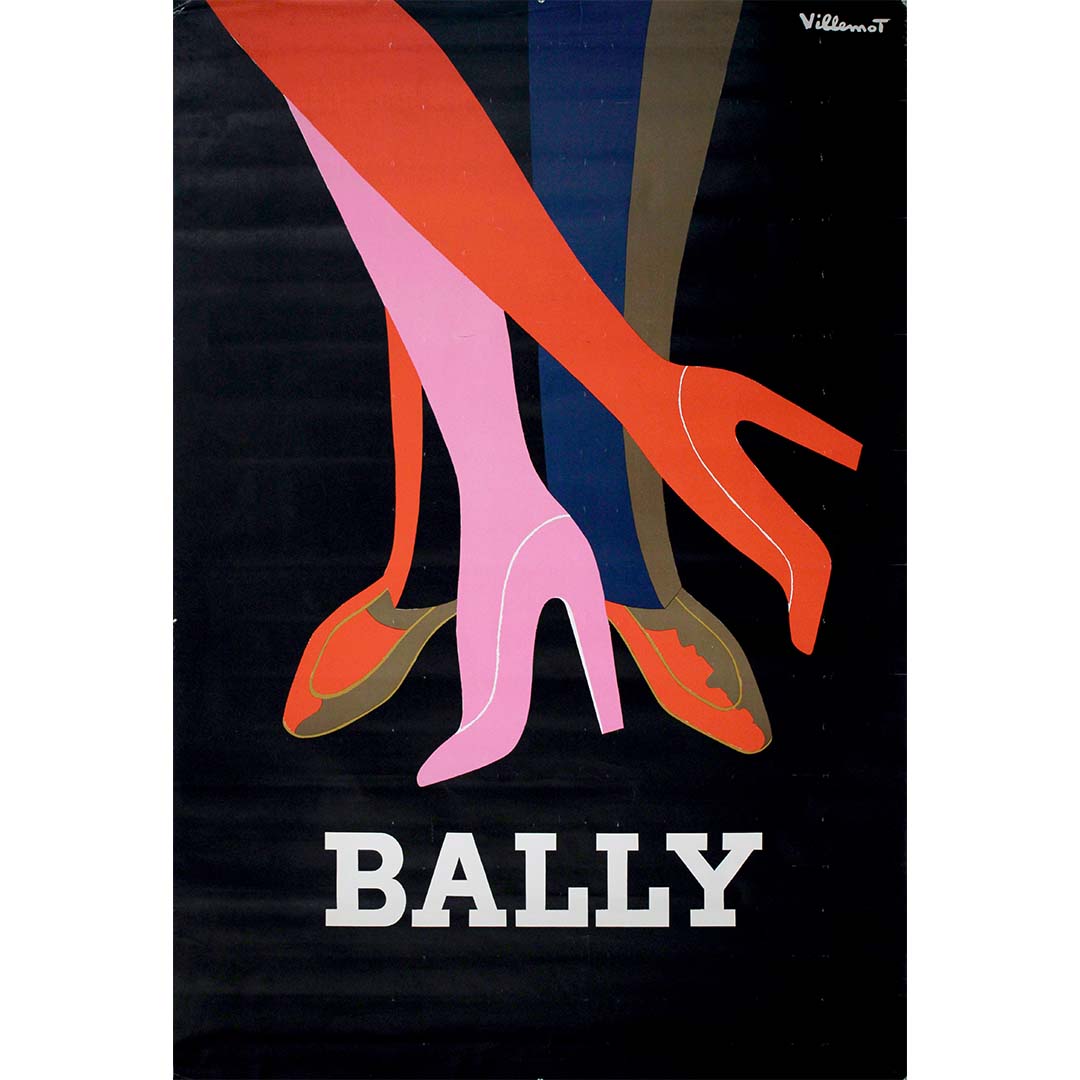 L'affiche présente une harmonie visuelle saisissante : trois jambes allongées et stylisées – l'une vêtue de rose, l'autre d'écarlate et la troisième de tons terreux – se détachent avec assurance sur un fond noir profond. Chaque jambe, chaussée d'une élégante chaussure Bally ou d'un talon haut, est bien plus qu'une simple illustration de mode : c'est une affirmation de mouvement, d'identité et de séduction. Par quelques courbes et aplats de couleur judicieusement placés, Villemot métamorphose les jambes en lignes de danse, de grâce et de désir.
