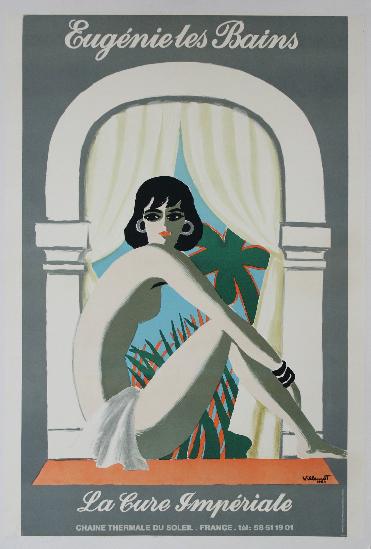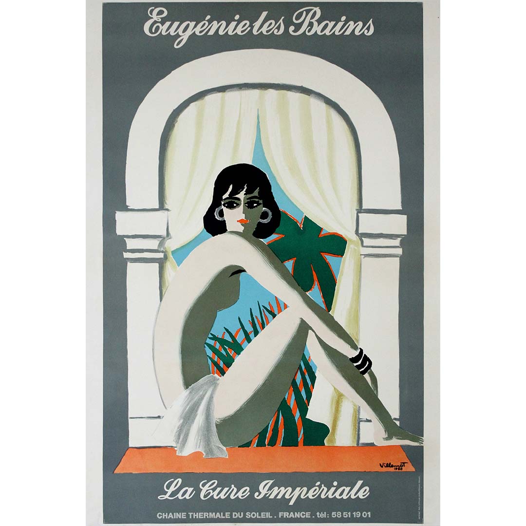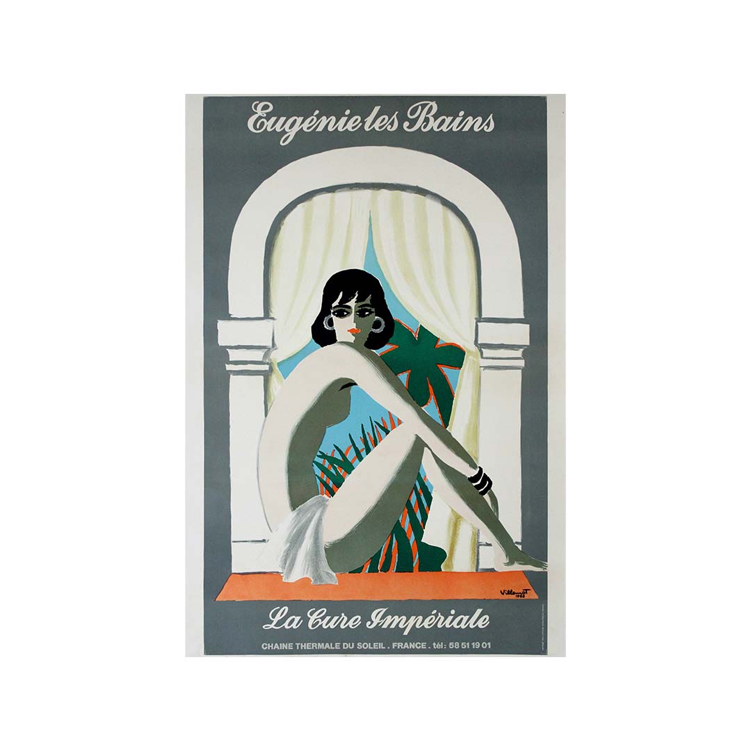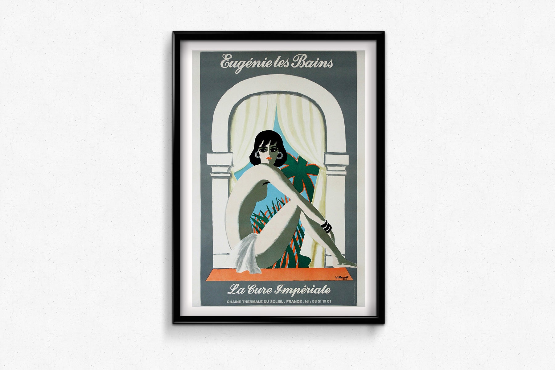 L’affiche « Eugénie-les-Bains – La Cure Impériale » , créée en 1988 par le célèbre graphiste français Bernard Villemot, est un exemple remarquable de son style caractéristique : élégant, minimaliste et évocateur. Commandée dans le cadre d’une campagne promotionnelle pour la Chaîne Thermale du Soleil , cette œuvre célèbre la célèbre station thermale d’Eugénie-les-Bains, réputée pour ses eaux bienfaisantes et ses luxueux centres de bien-être.