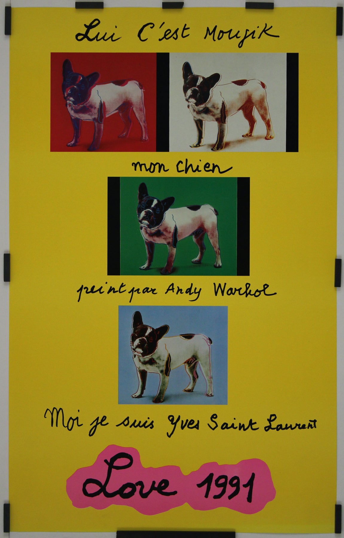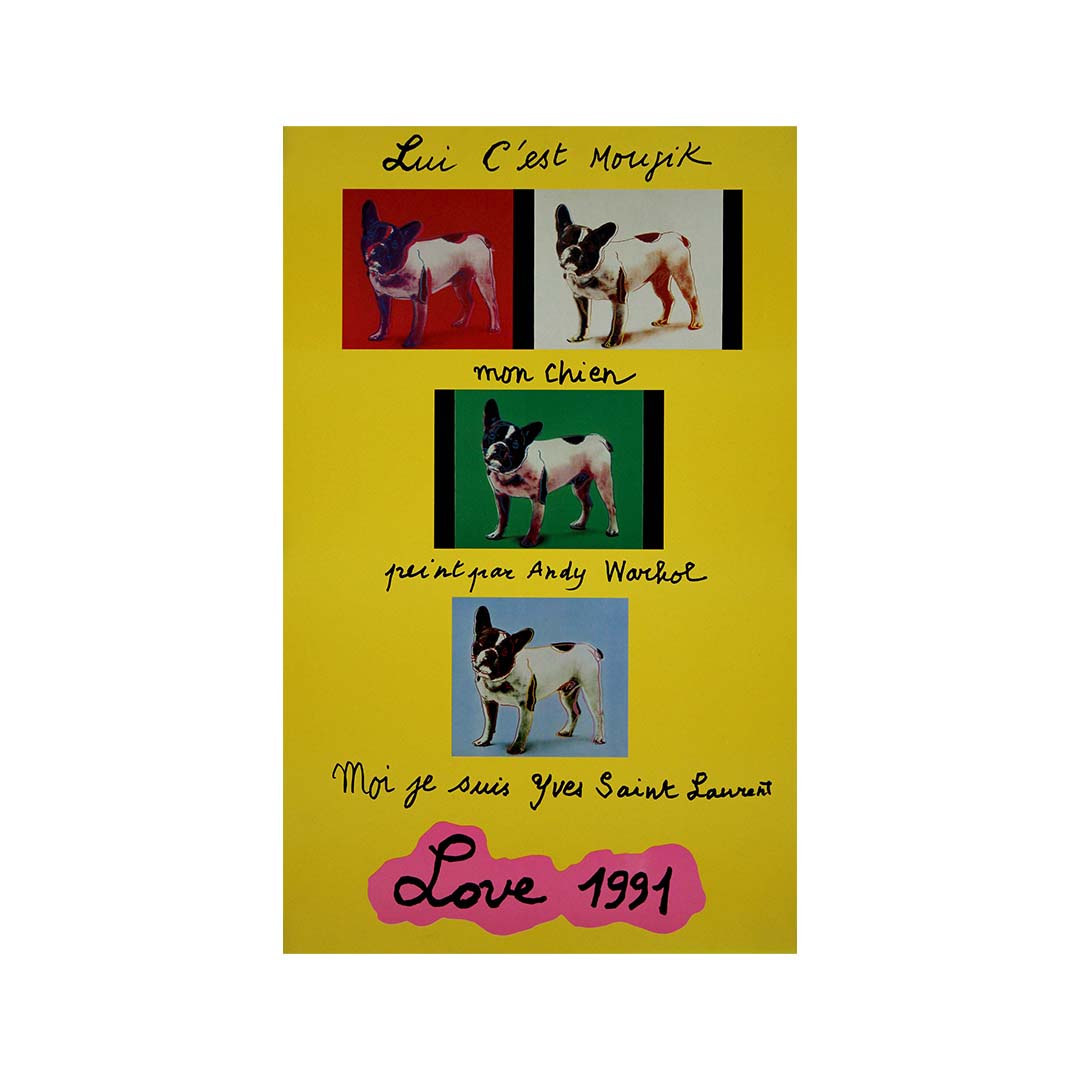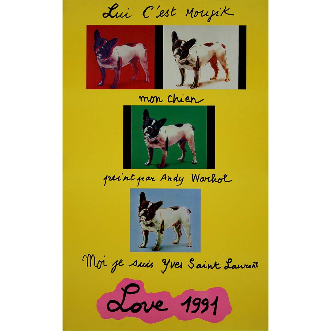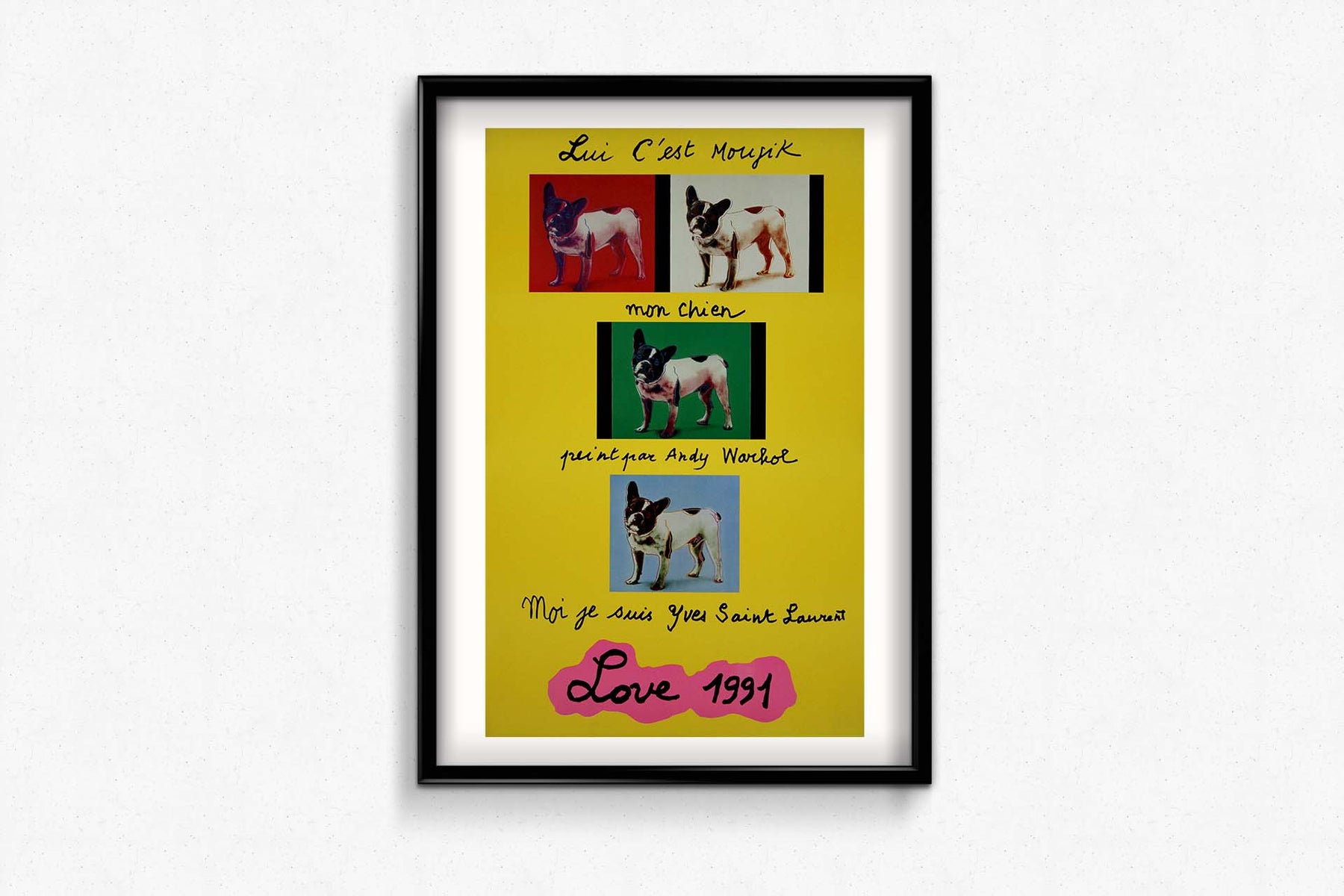 Intitulée « Love by Yves Saint Laurent, Lui c'est Moujik, mon chien peint par Andy Warhol, moi je suis Yves Saint Laurent », l'affiche incarne l'essence de l'amour, de la créativité et du lien entre l'homme et son fidèle compagnon.