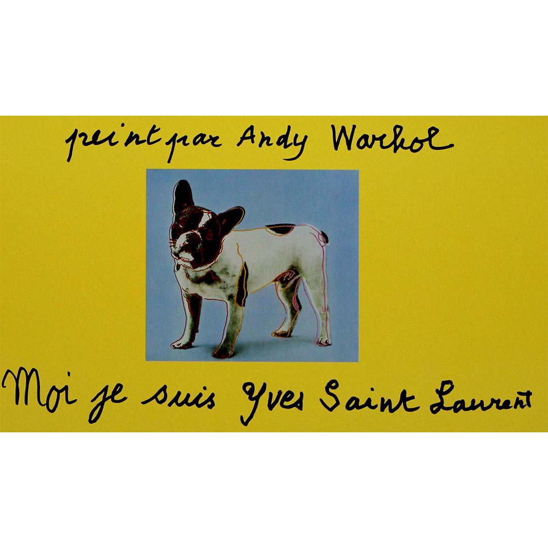 L'inclusion de la phrase « Lui c'est Moujik, mon chien peint par Andy Warhol, moi je suis Yves Saint Laurent » ajoute une touche personnelle à l'œuvre, soulignant le lien particulier entre Saint Laurent, son chien Moujik et le célèbre artiste Andy Warhol.