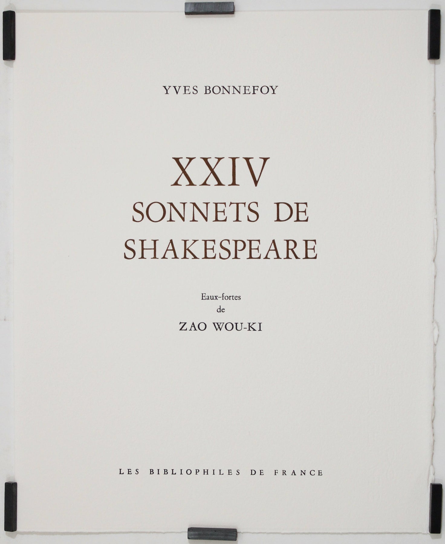 Cette édition des « XXIV Sonnets de Shakespeare » est très recherchée en raison de son tirage limité, de la participation de deux figures majeures dans leurs domaines respectifs et de la qualité de sa fabrication. La référence bibliographique Agerup 366 à 372 inscrit l'ouvrage dans le catalogue exhaustif de la carrière de graveur de Zao Wou-Ki, lui assurant ainsi une place de choix dans l'œuvre officielle de l'artiste.