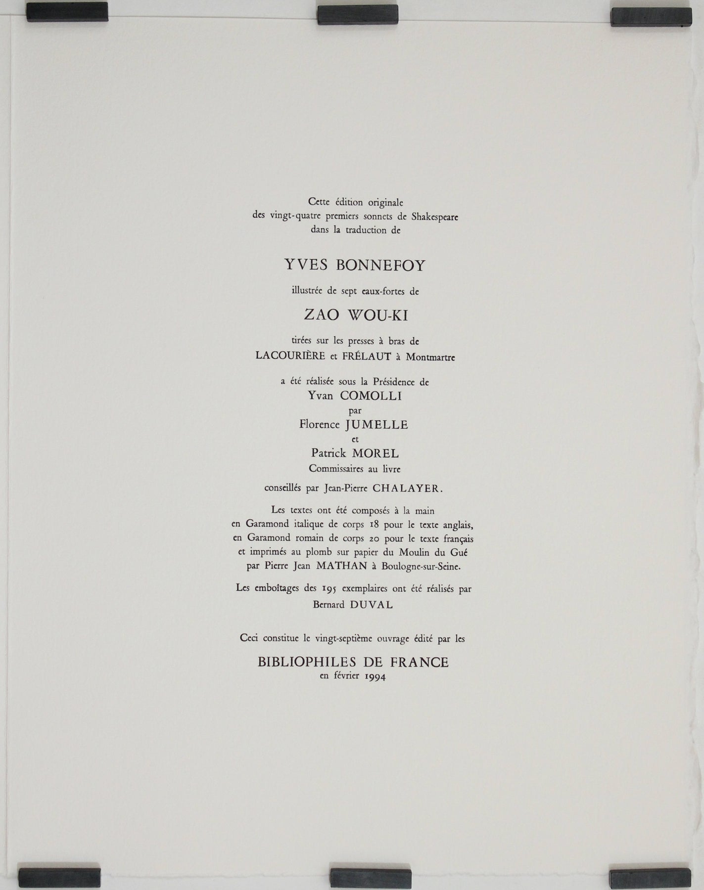 L'édition de 1994 des « XXIV Sonnets de Shakespeare » par Zao Wou-Ki et Yves Bonnefoy est un chef-d'œuvre de l'art du livre moderne. Alliant la poésie intemporelle de Shakespeare au talent d'interprétation de Bonnefoy et Zao Wou-Ki, cet ouvrage offre une expérience de lecture unique et hors du commun. Tiré en édition limitée et réalisé avec un soin exceptionnel, il constitue une pièce précieuse dans le monde du livre d'art et un incontournable pour les collectionneurs d'ouvrages illustrés modernes.