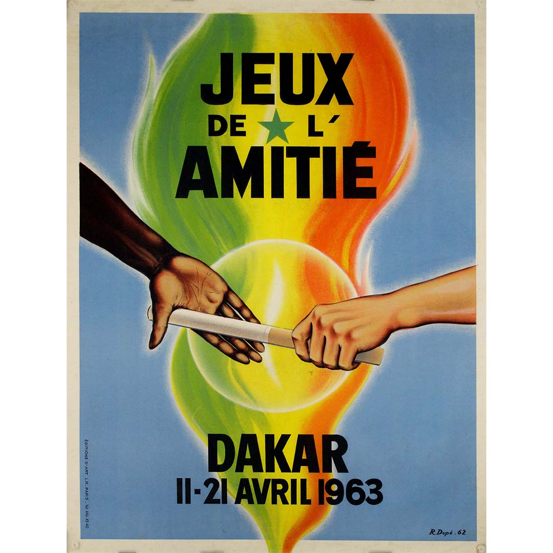 Regular price €800,00The Jeux de l'Amitié (Friendship Games) poster designed by R. Dupé in 1962 for the 1963 games held in Dakar, Senegal, is a vibrant example of how sport and art were intertwined in the cultural and political landscapes of post-colonial Africa. This striking poster was created to promote the first Jeux de l’Amitié, an event held from April 11 to April 21, 1963. The games, which brought together athletes from French-speaking African nations, symbolized not only athletic competition but also the camaraderie and solidarity among the newly independent African countries.