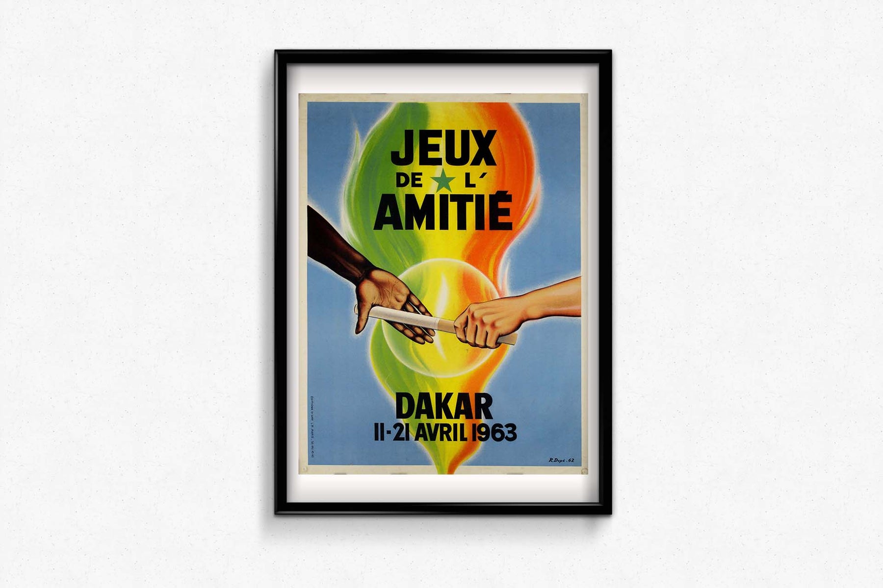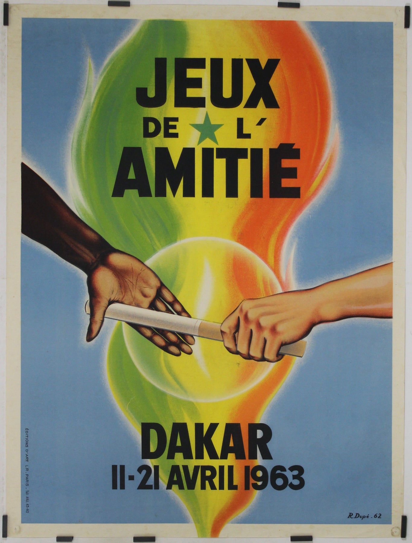 R. Dupé’s design for the Dakar games exemplifies the role of graphic art in amplifying messages of unity and collaboration during a time when African nations were emerging from colonial rule. The poster’s symbolism—the handshake, the passing of the baton, the flames of national colors—comes together to create a compelling and hopeful vision of what the games and the future of African solidarity could be. Today, the poster stands as both an artifact of African sporting history and a testament to the power of design in shaping and expressing the political currents of the time.