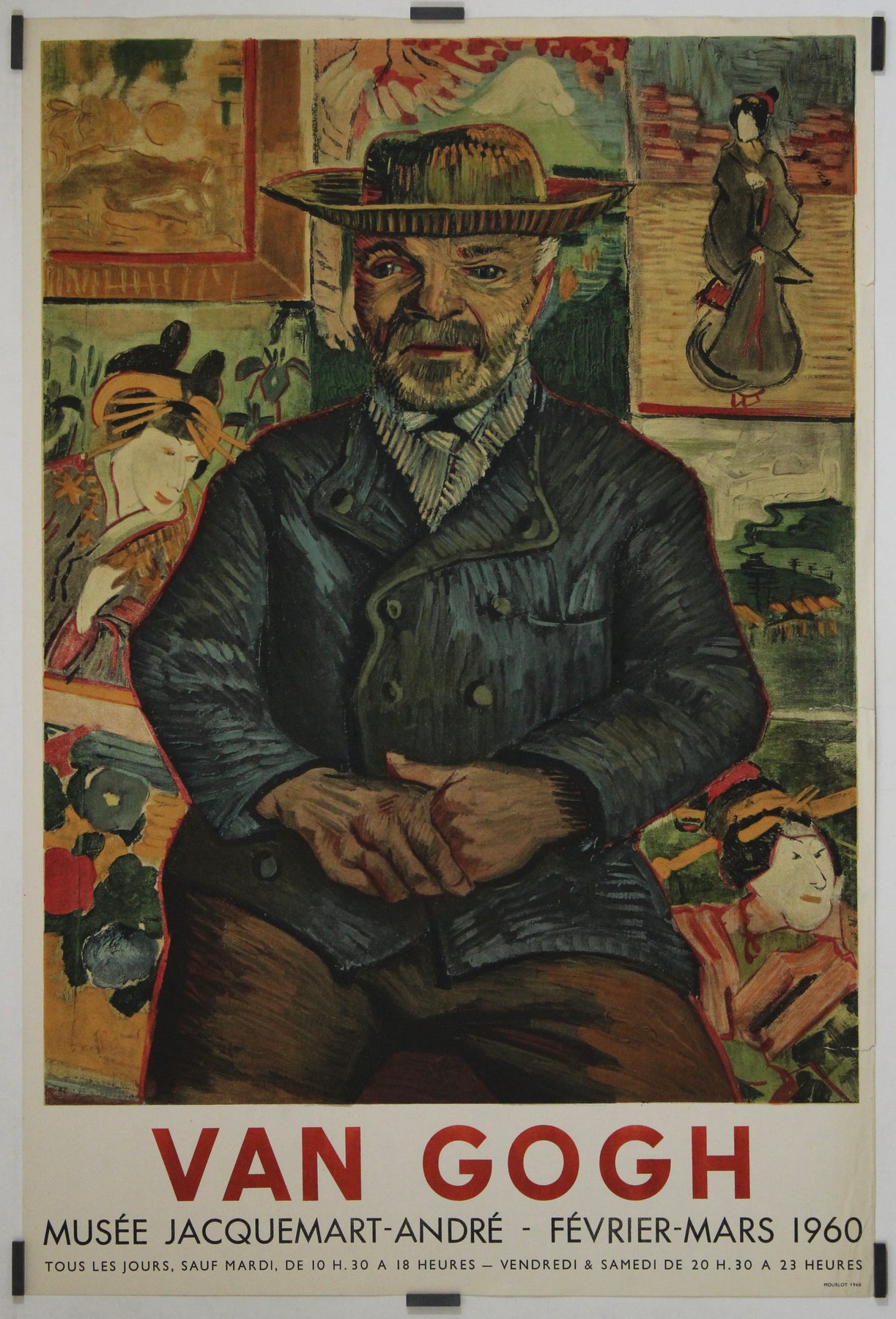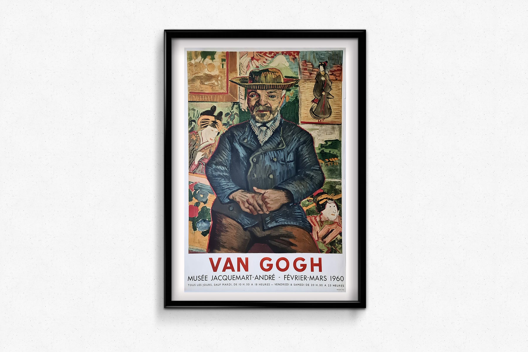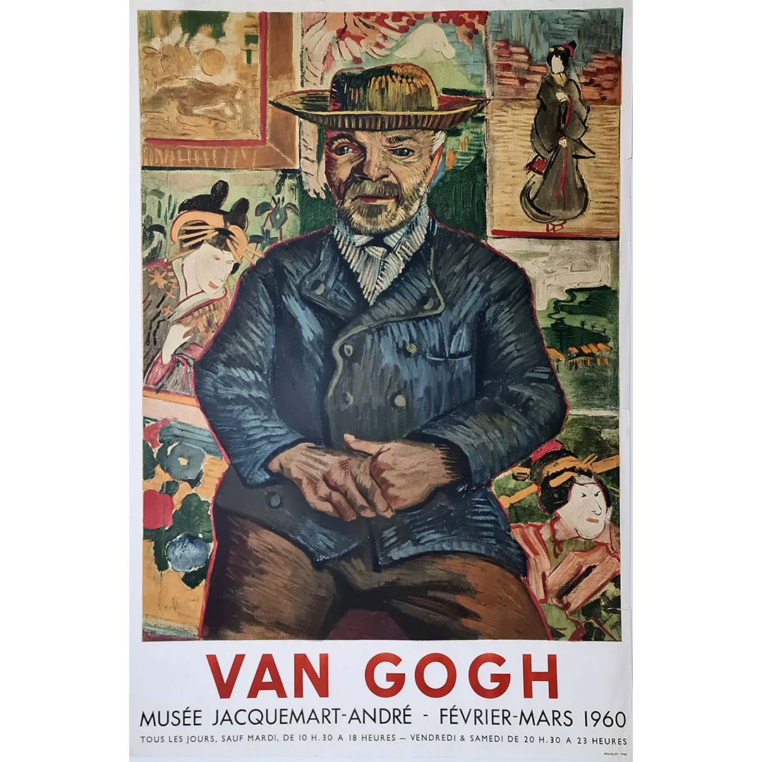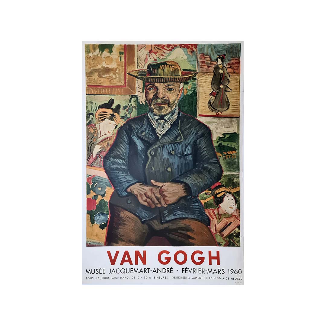 This striking exhibition poster was produced for the Van Gogh exhibition at the Musée Jacquemart-André in Paris, held from February to March 1960. It features a reproduction of Portrait du Père Tanguy (1887), one of Vincent van Gogh’s most celebrated works, which captures the essence of his Post-Impressionist style. The painting portrays Julien Tanguy, a Parisian art dealer and supporter of avant-garde painters, sitting before a vivid background of Japanese prints, a reflection of Van Gogh’s deep admiration for Japanese art.